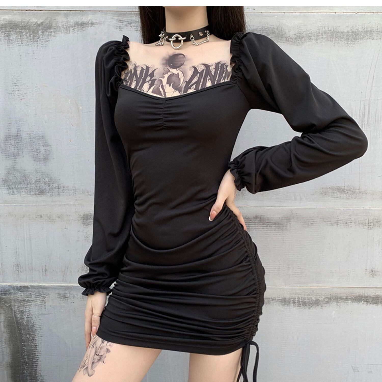 ✞✝✞ ブラック長袖スリーブドレス ワンピースオータム♡♥カワイイ♥ギャザー今年流行☆スカート ロング 秋物 スクウェア ✞✝✞ ゴスロリ SM ミリ 甘ロリ クラロリ 和ロリ エレガント 黒ロリ 姫ロリ 華ロリ AA-AA58488491124