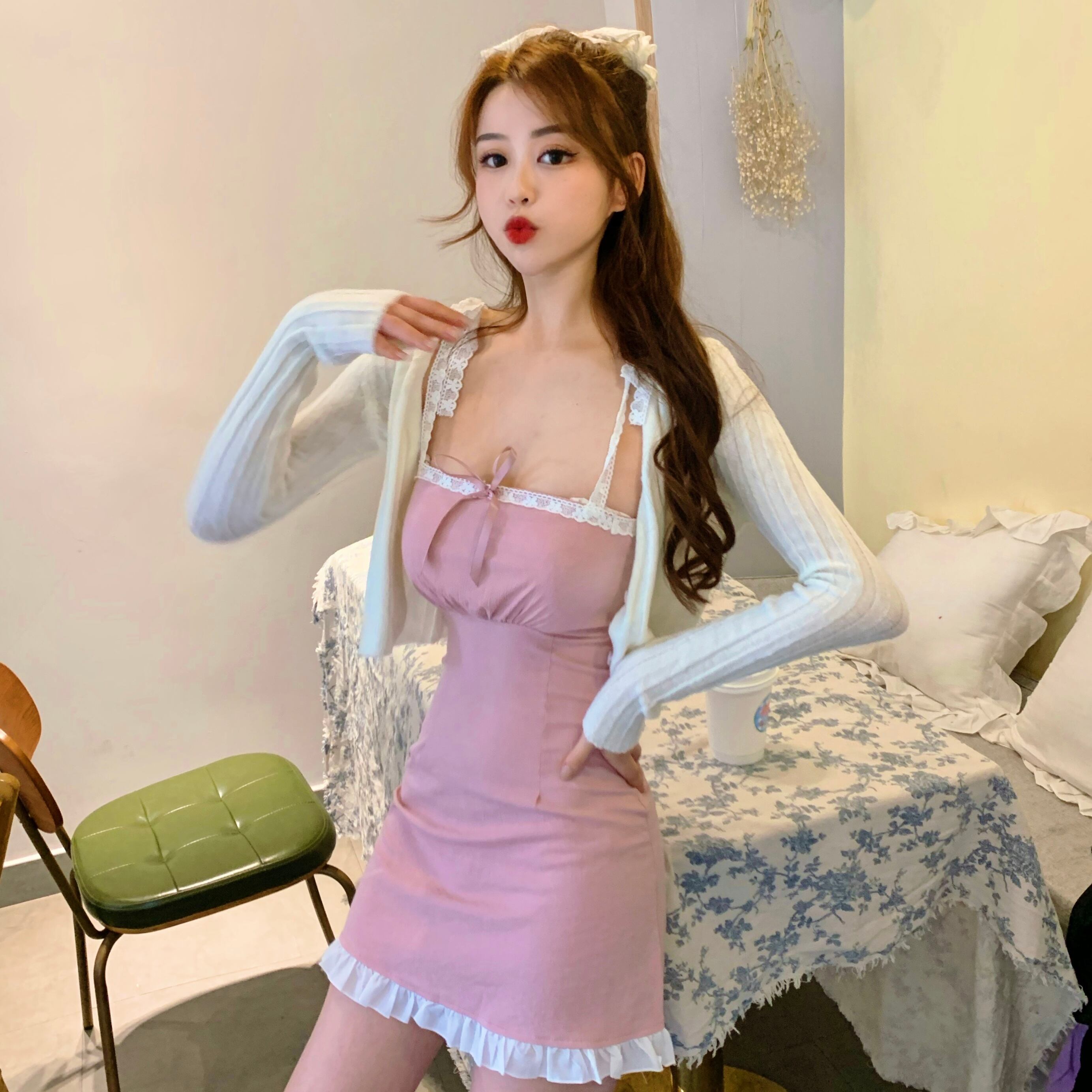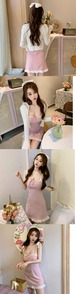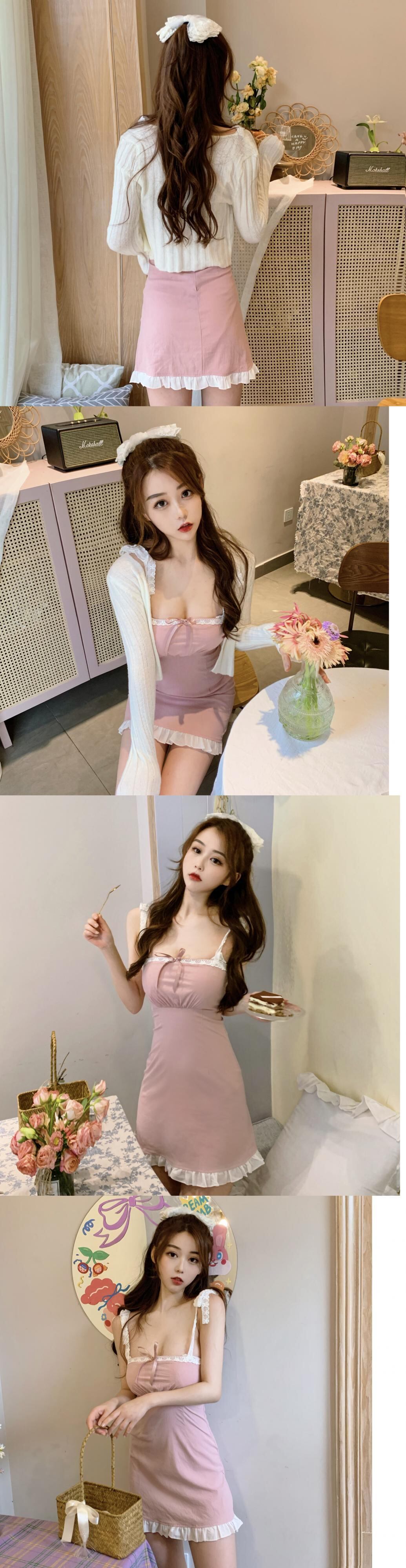 色:ニットカーディガン,ピンクのサスペンダースカートワンピース