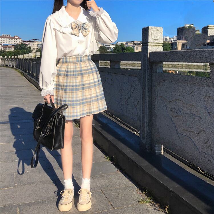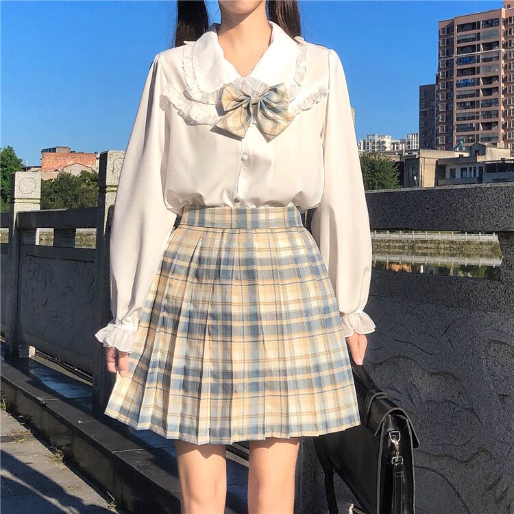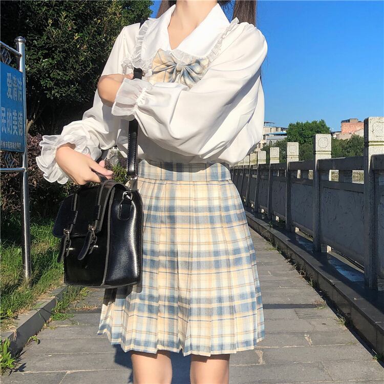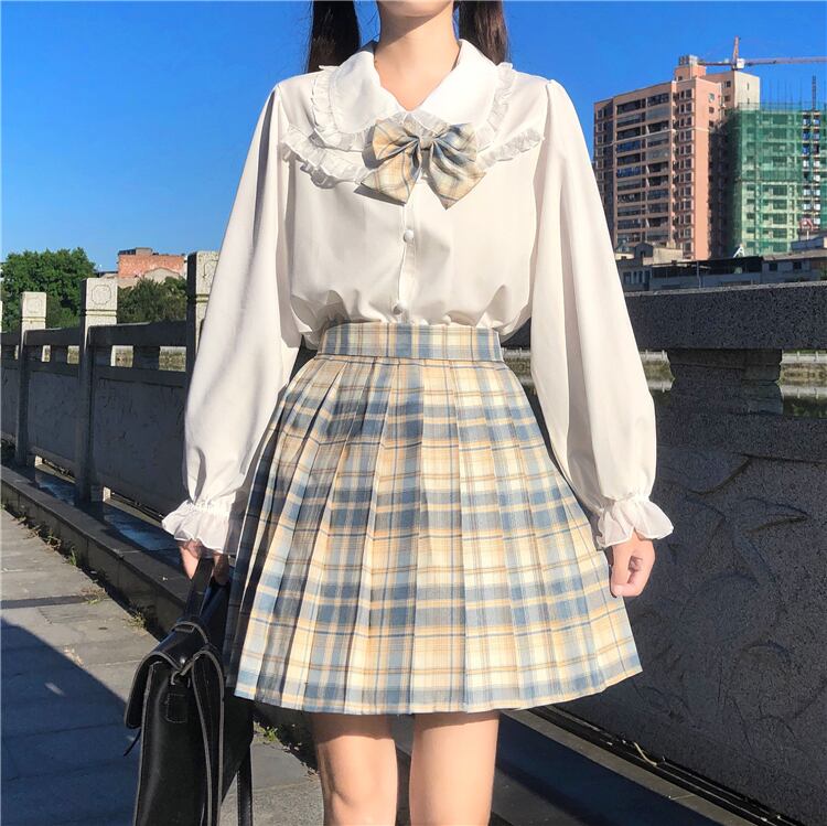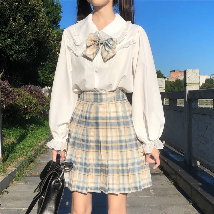 ✞ シャツブラウス長袖スリーブ白チェック柄プリーツショートスカート セット ロング ホワイト ✞ゴスロリ SM ミリ 甘ロリ クラロリ 和ロリ エレガント 黒ロリ 姫ロリ 華ロリ BB-BB71183171225