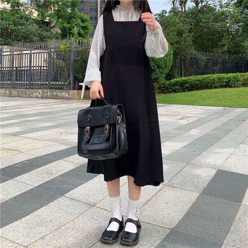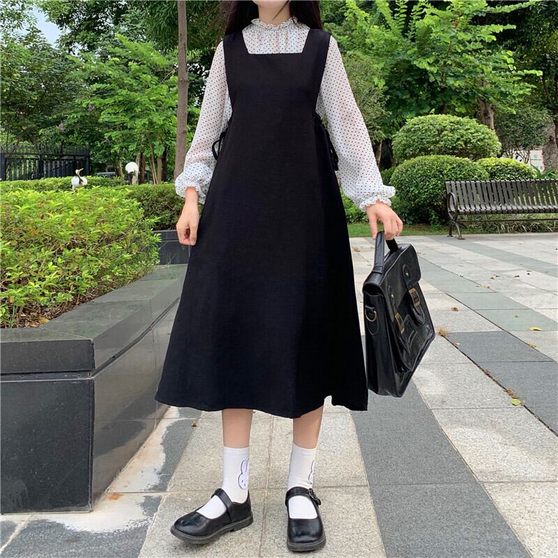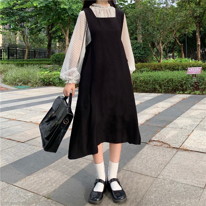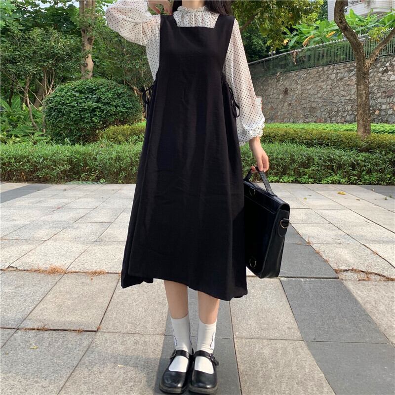 色:ブラックストラップスカートワンピース,水玉ボトムスシャツワンピース
