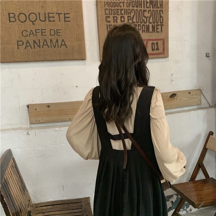 色:アプリコットベースシャツワンピース,ブラックストラップスカートワンピース