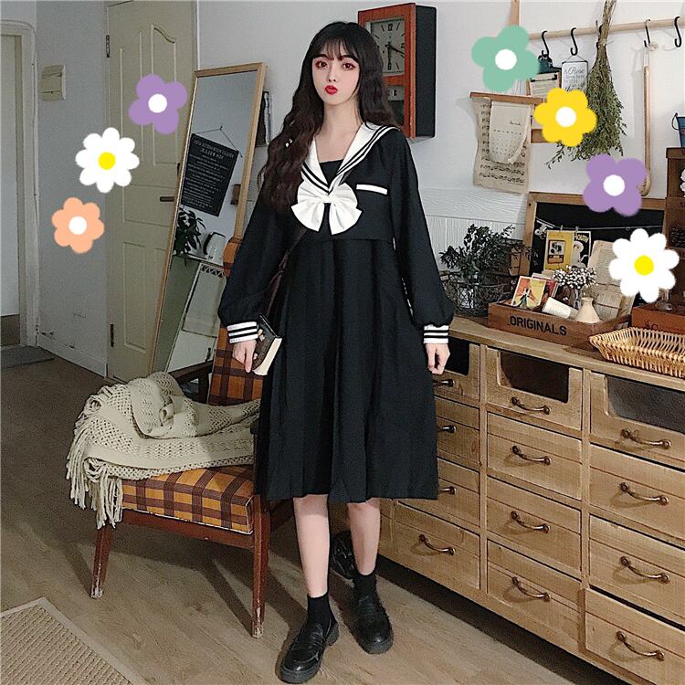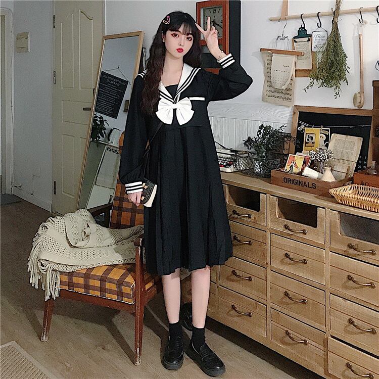 ✞ リボンネイビー長袖スリーブブラックスカート ロング スウィート ガーリー ✞ゴスロリ SM ミリ 甘ロリ クラロリ 和ロリ エレガント 黒ロリ 姫ロリ 華ロリ BB-BB88561846629