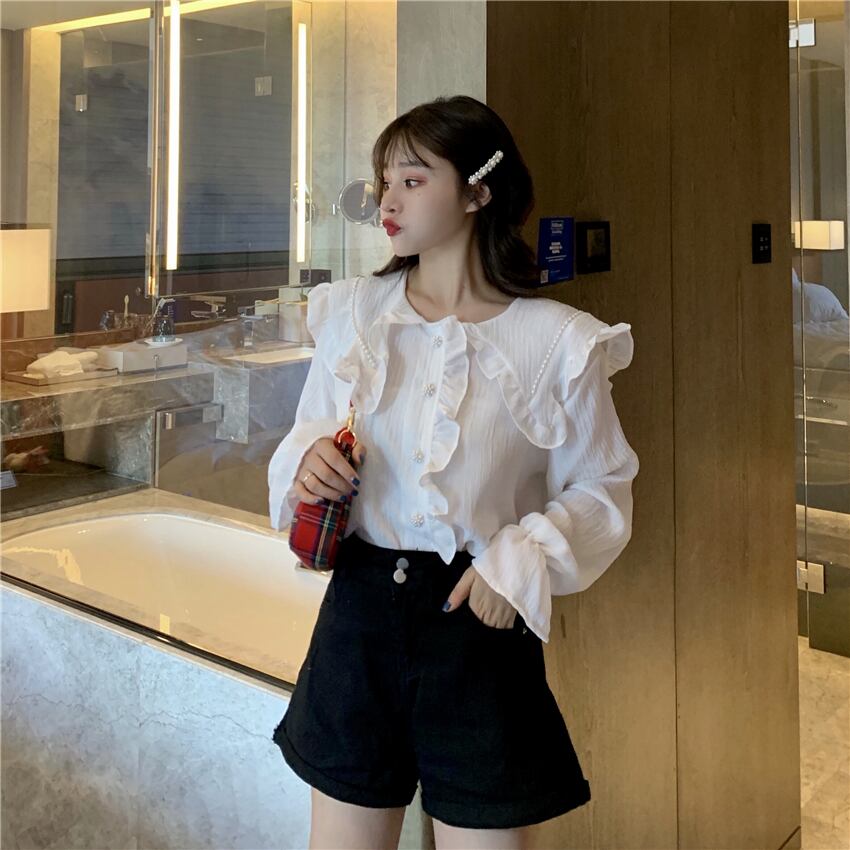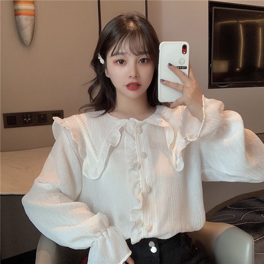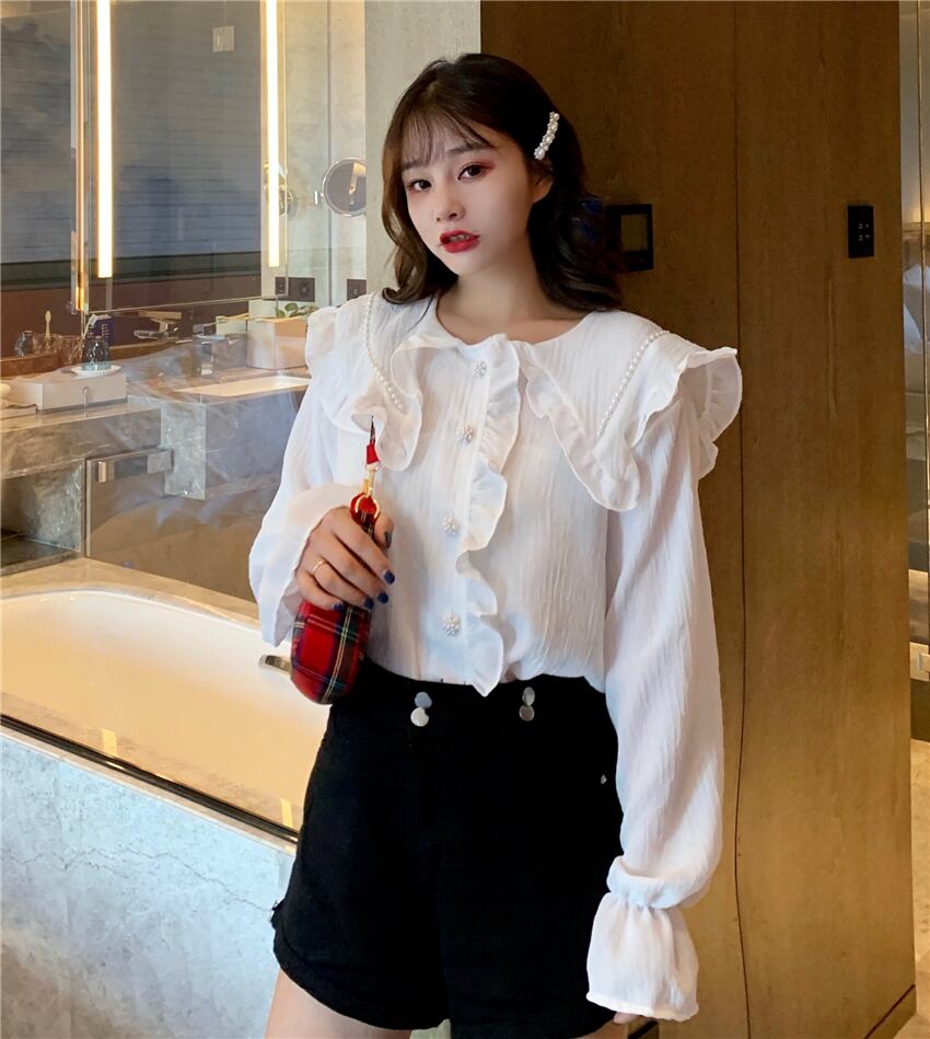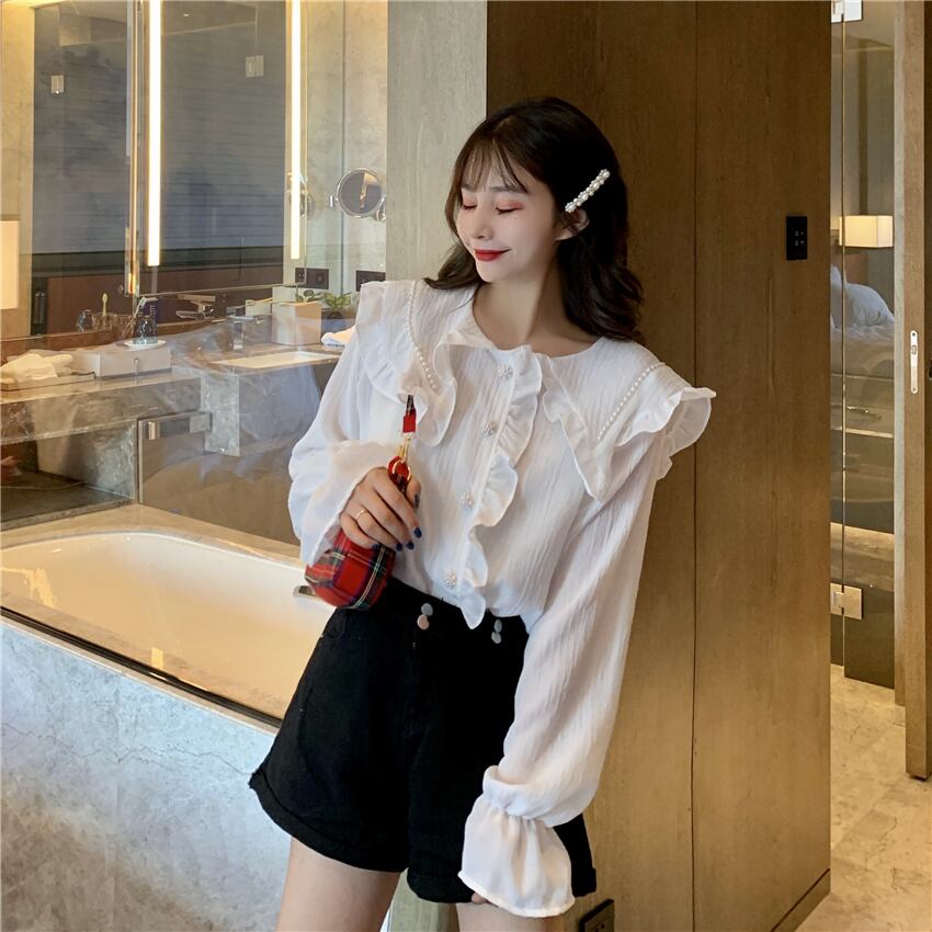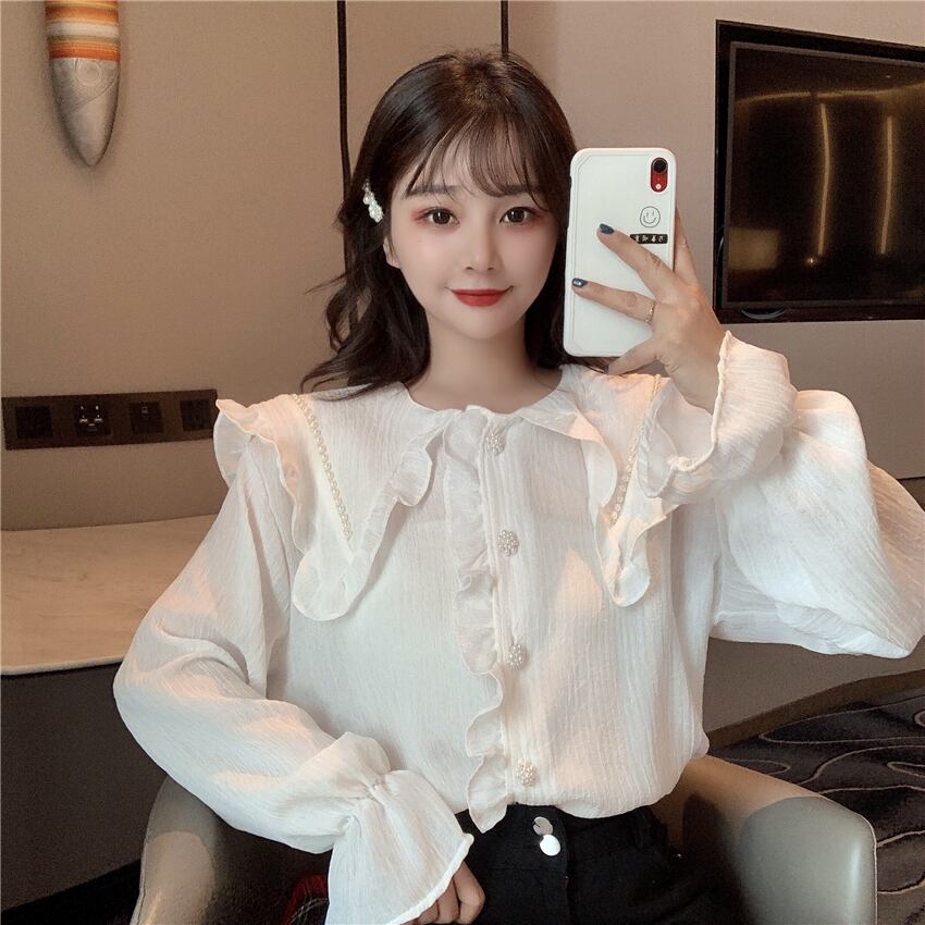 ✞ オータムパールスリーブ白シャツブラウス ホワイト スウィート 秋物 真珠 ✞ゴスロリ SM ミリ 甘ロリ クラロリ 和ロリ エレガント 黒ロリ 姫ロリ 華ロリ BB-BB8986817801
