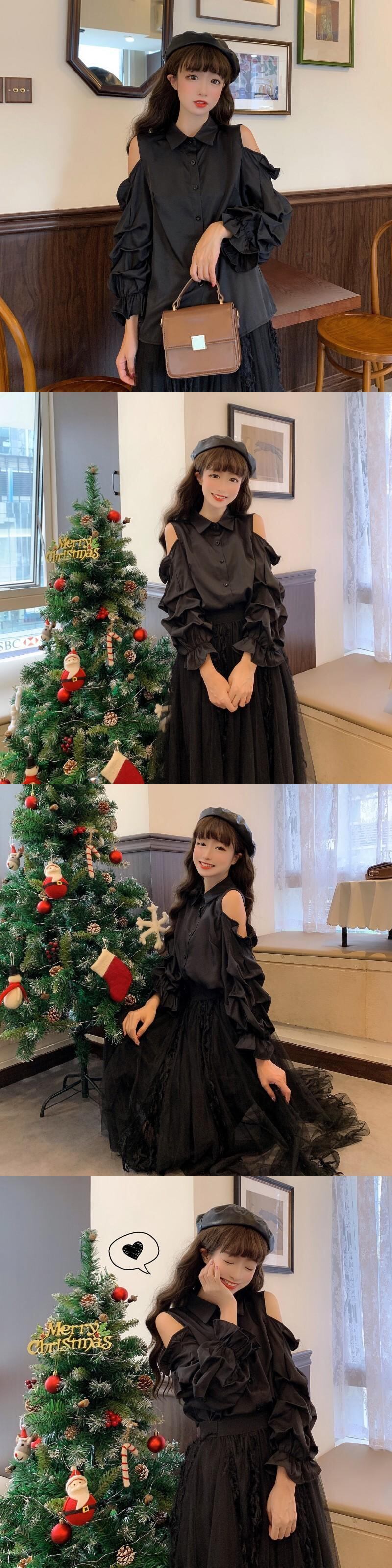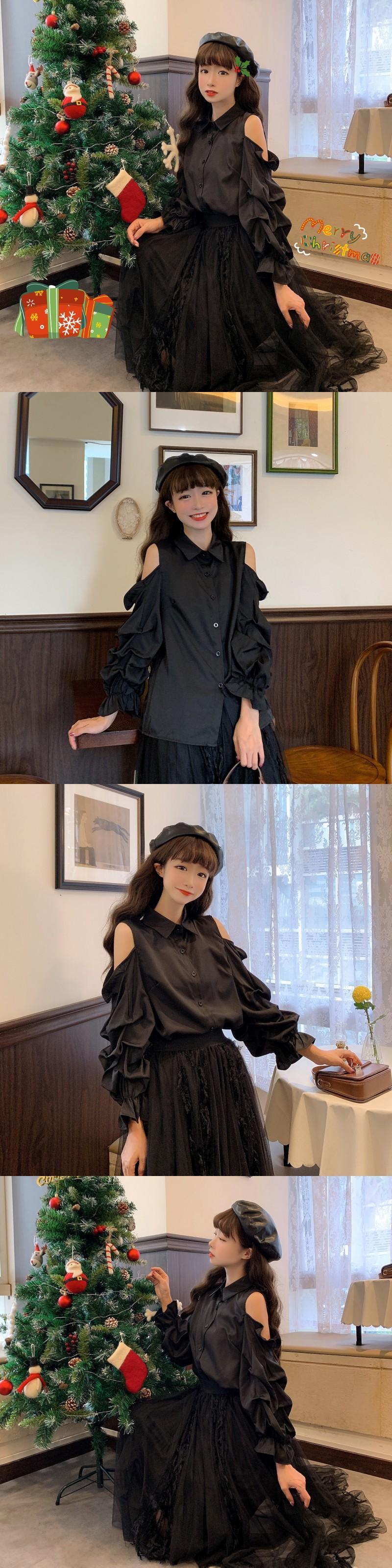 ✞ ストラップレススリーブシャツブラウス ランタンスリーブ スウィート ✞ゴスロリ SM ミリ 甘ロリ クラロリ 和ロリ エレガント 黒ロリ 姫ロリ 華ロリ BB-BB88154668223