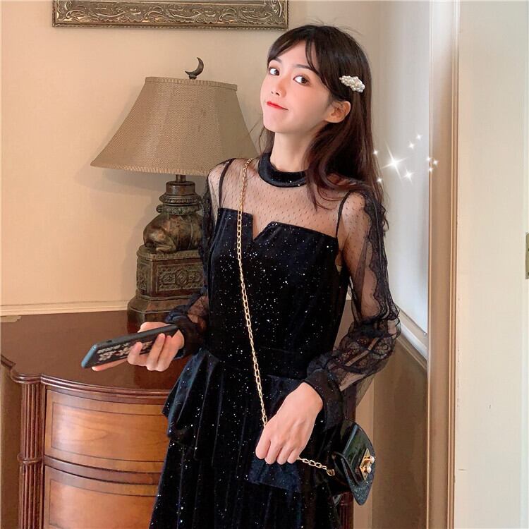 ✞ ドレス ワンピースラウンドネックメッシュロングハイウェスト♥カワイイ♥ベルベットスカート ステッチ ✞ゴスロリ SM ミリ 甘ロリ クラロリ 和ロリ エレガント 黒ロリ 姫ロリ 華ロリ BB-BB54213585387