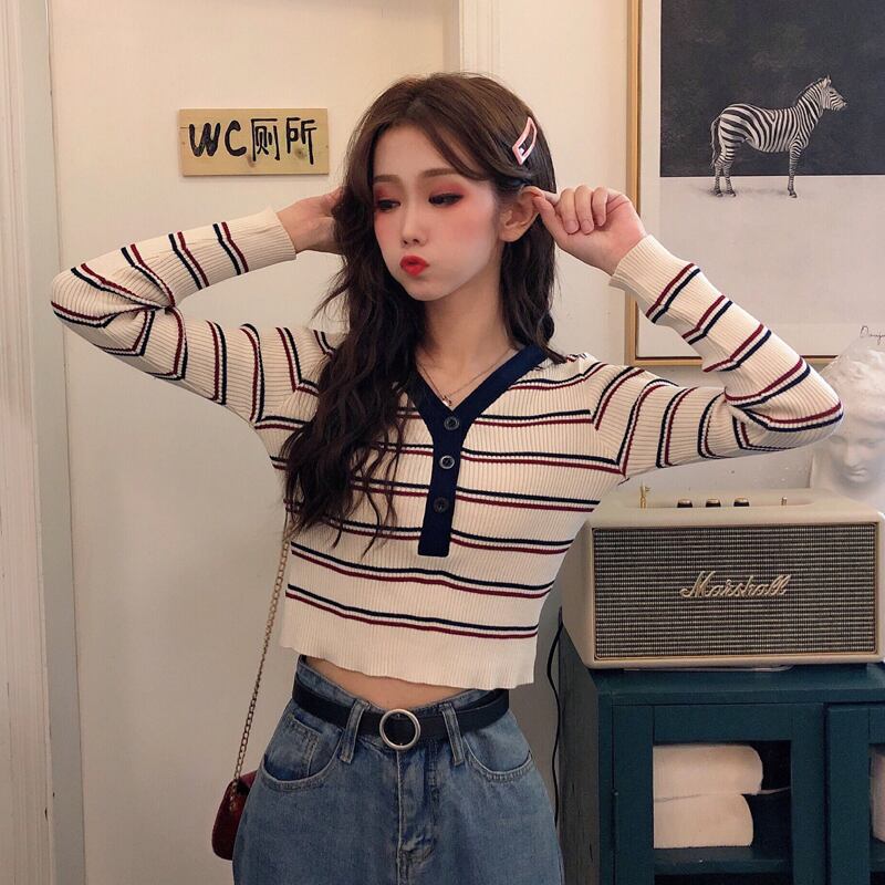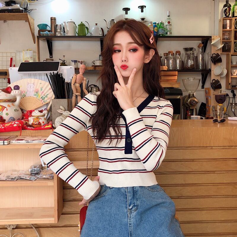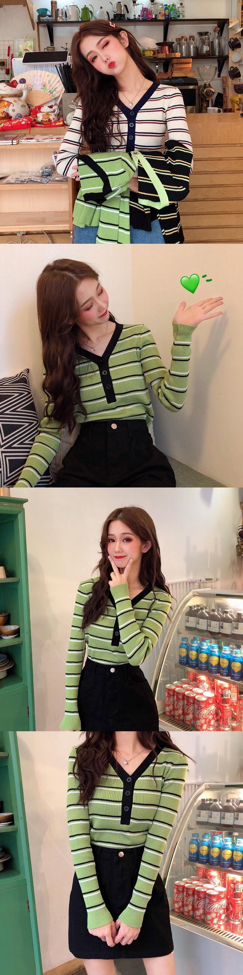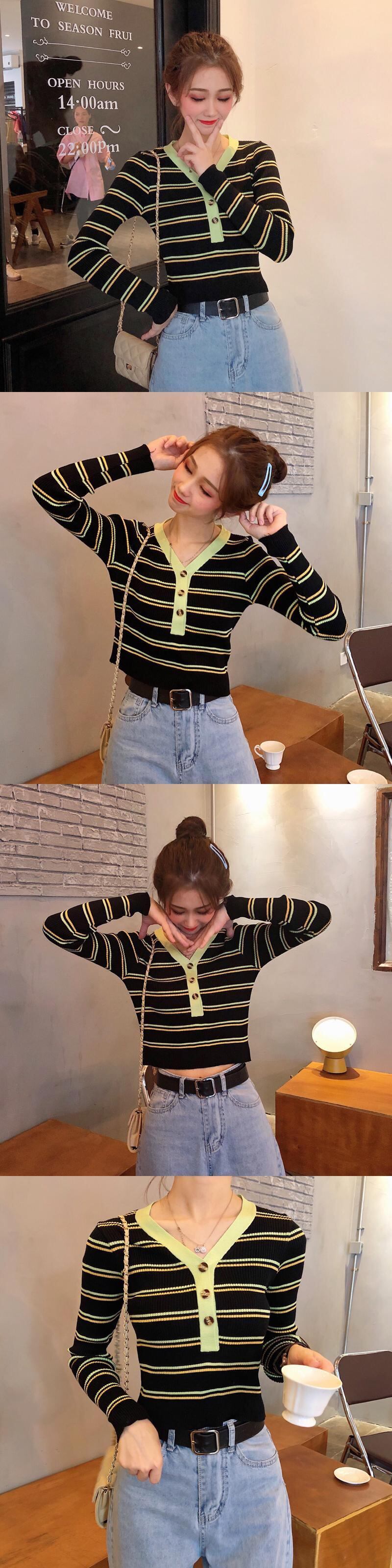 ✞ シャツブラウスVネックスリムストライプショートニットトップス ロング ステッチ ✞ゴスロリ SM ミリ 甘ロリ クラロリ 和ロリ エレガント 黒ロリ 姫ロリ 華ロリ BB-BB52777819658