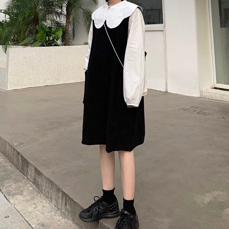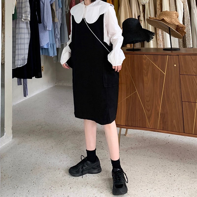 色:白いシャツワンピース,ブラックストラップスカートワンピース