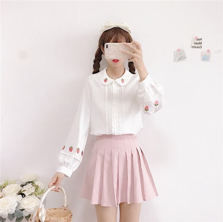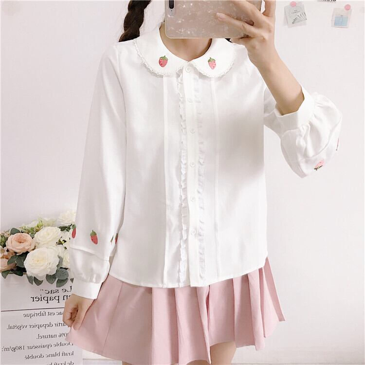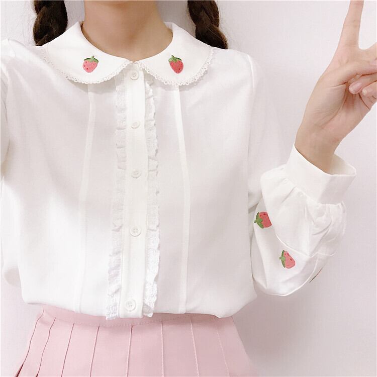 ✞ いちご刺繍ランタンスリーブシャツブラウス ホワイト 長袖 スウィート ✞ゴスロリ SM ミリ 甘ロリ クラロリ 和ロリ エレガント 黒ロリ 姫ロリ 華ロリ BB-BB13662321794