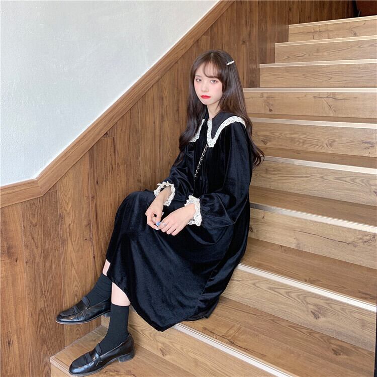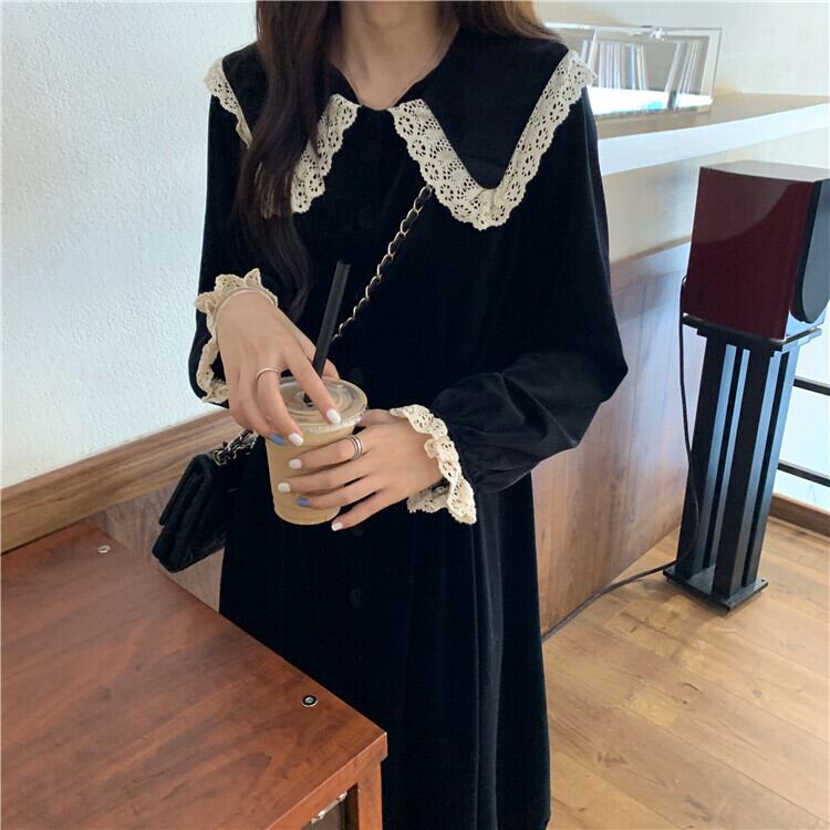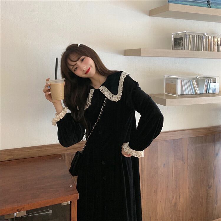 ✞ ドレス ワンピースレースロング♥カワイイ♥ベルベットブラック 長袖 スウィート ✞ゴスロリ SM ミリ 甘ロリ クラロリ 和ロリ エレガント 黒ロリ 姫ロリ 華ロリ BB-BB87707362422
