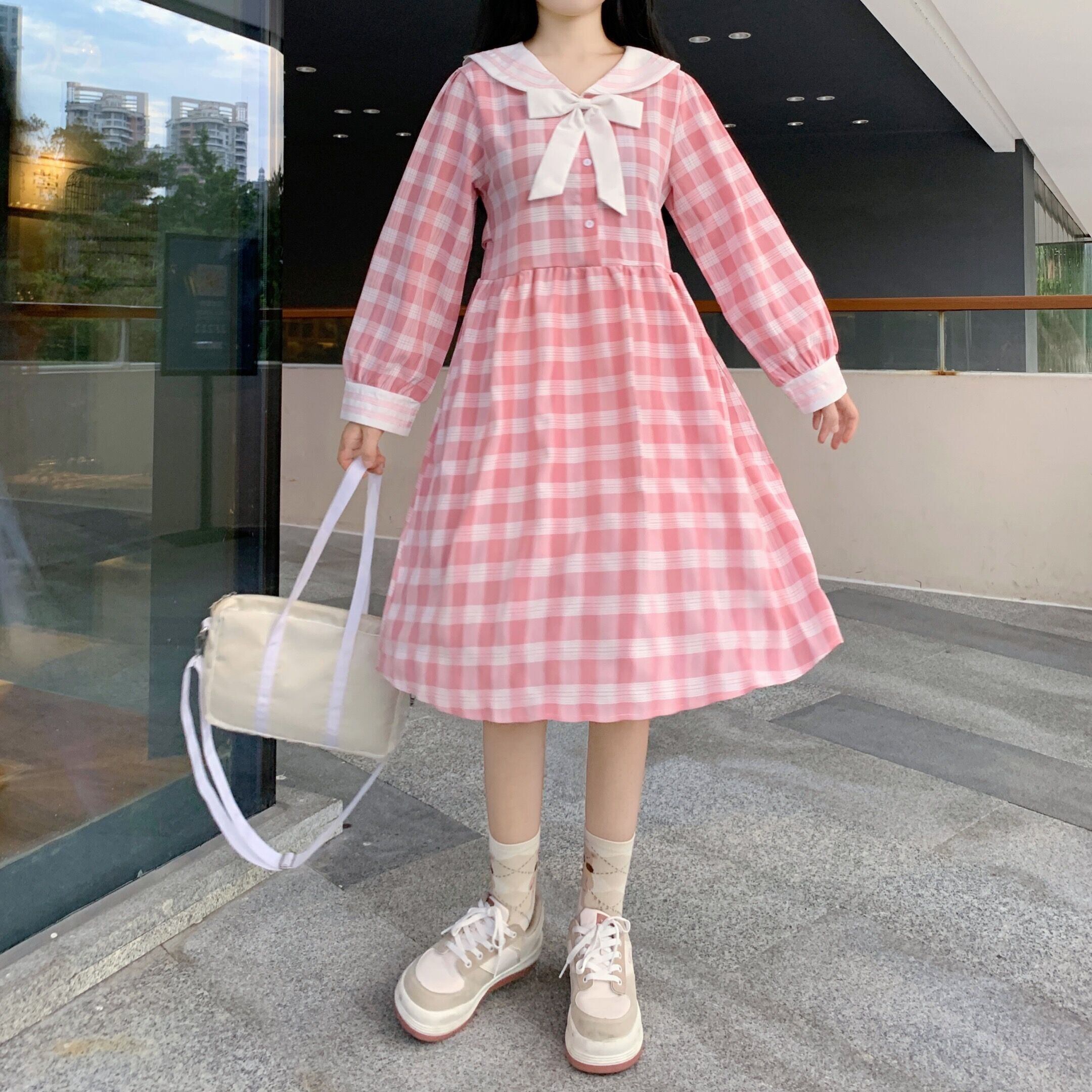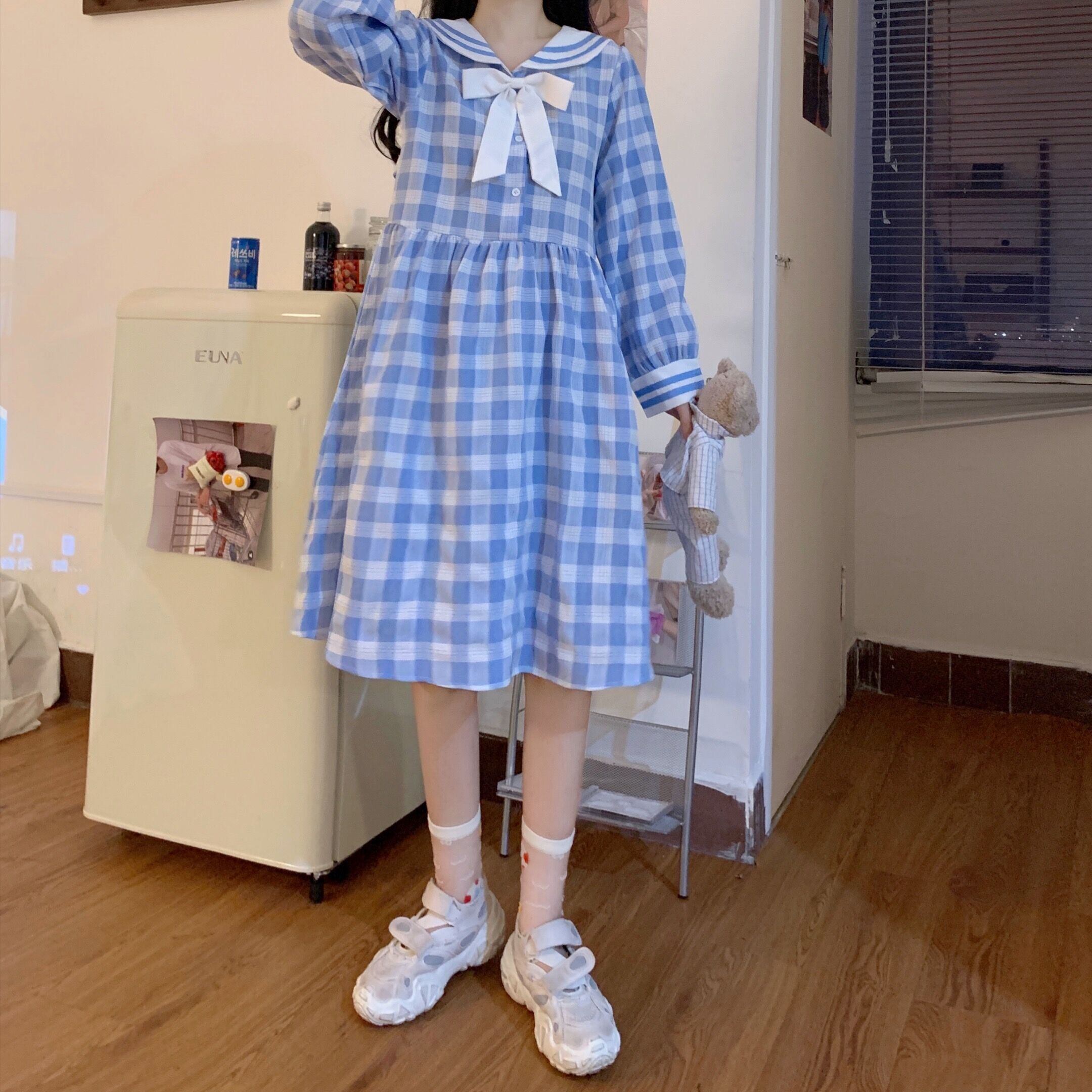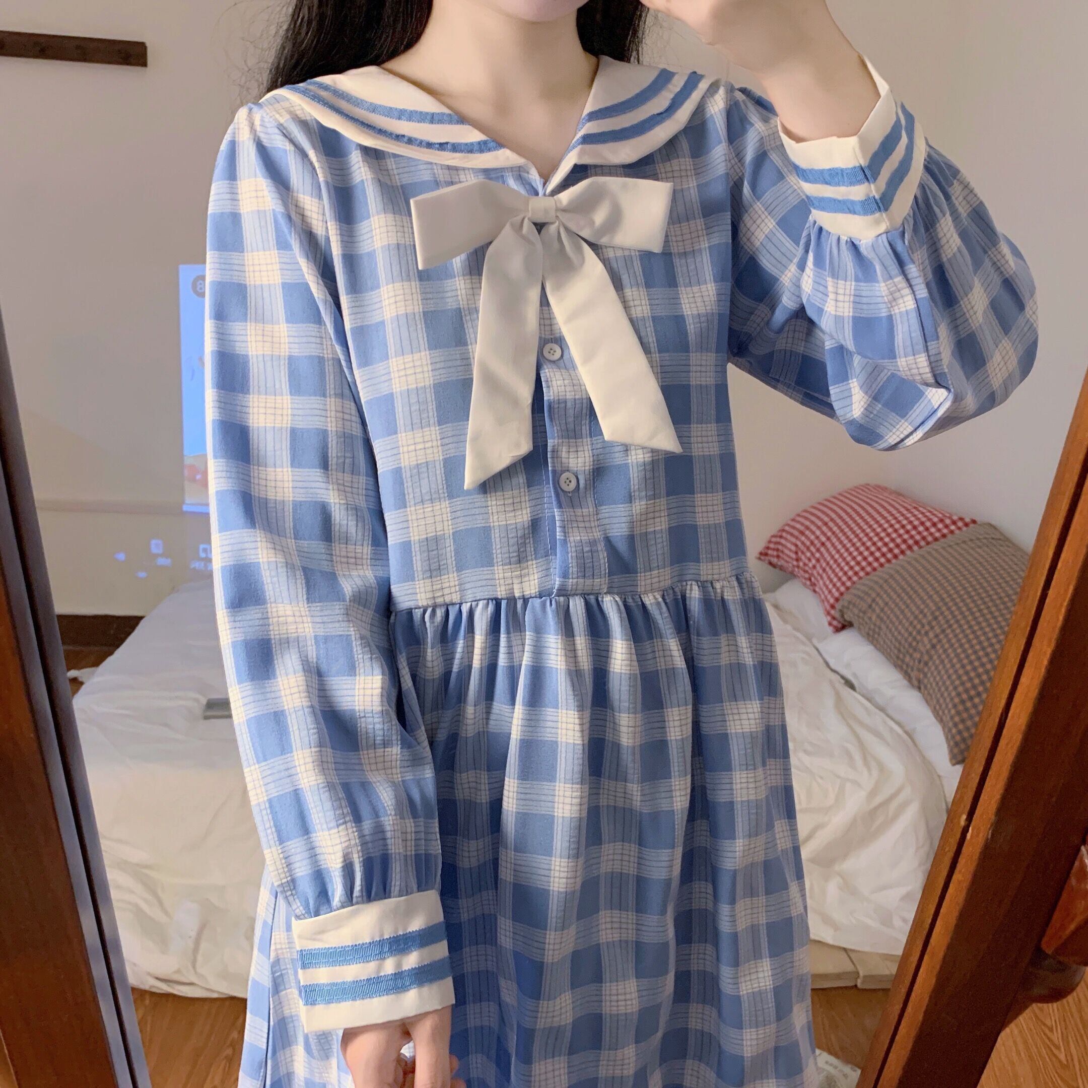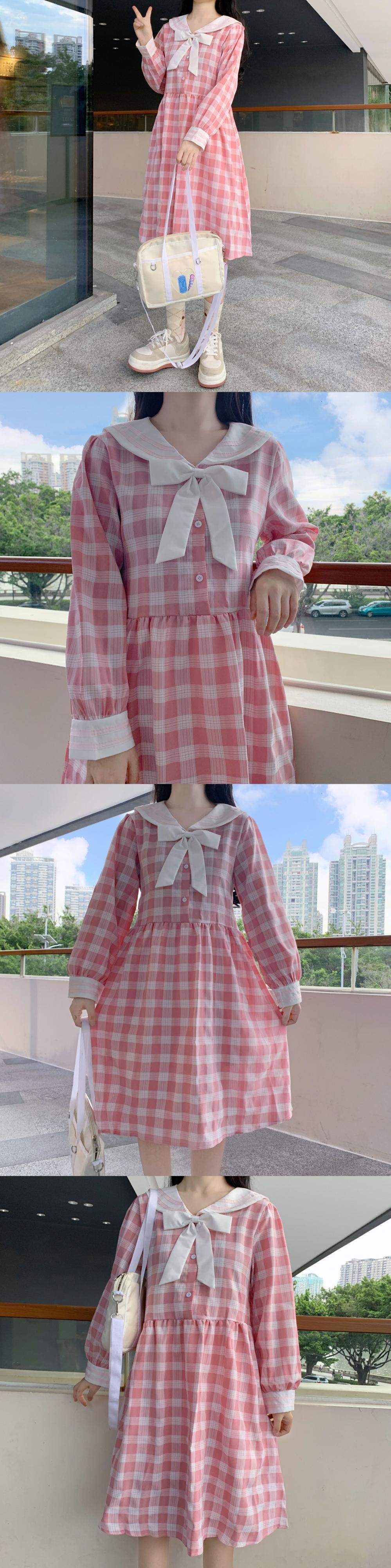 ✞ ネイビーチェック柄リボン長袖スリーブ ロング スウィート ガーリー ✞ゴスロリ SM ミリ 甘ロリ クラロリ 和ロリ エレガント 黒ロリ 姫ロリ 華ロリ BB-BB71596298809