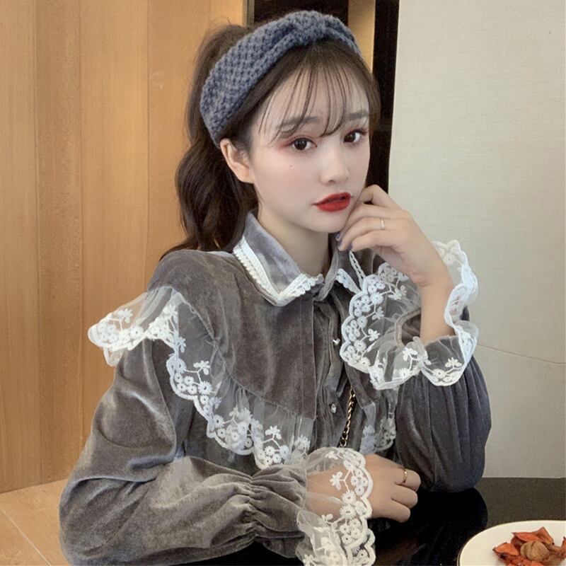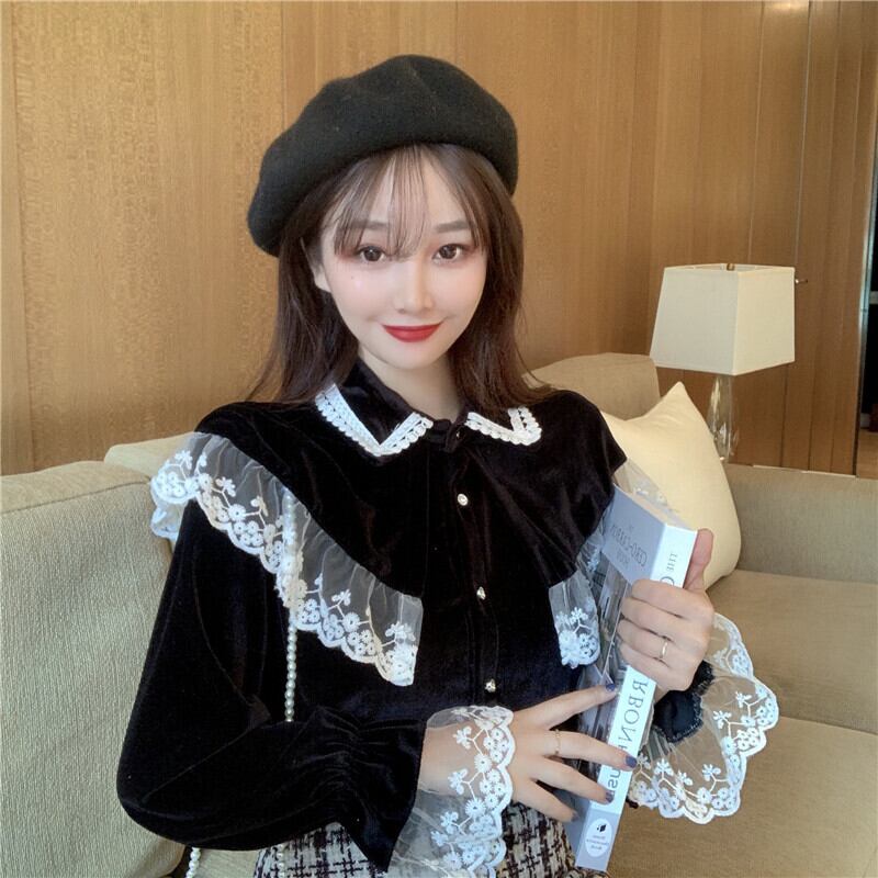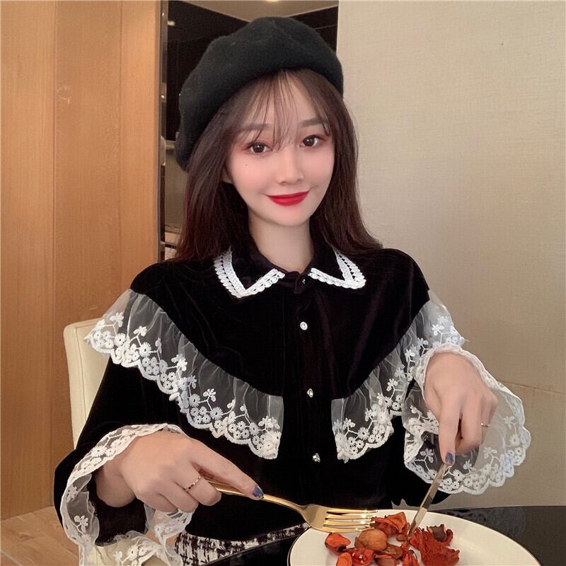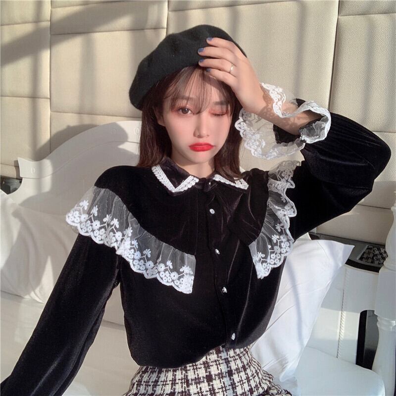 ✞ ♡レーススリーブベルベットスタンダードシャツブラウス レトロ ステッチ ✞ゴスロリ SM ミリ 甘ロリ クラロリ 和ロリ エレガント 黒ロリ 姫ロリ 華ロリ BB-BB31803811740