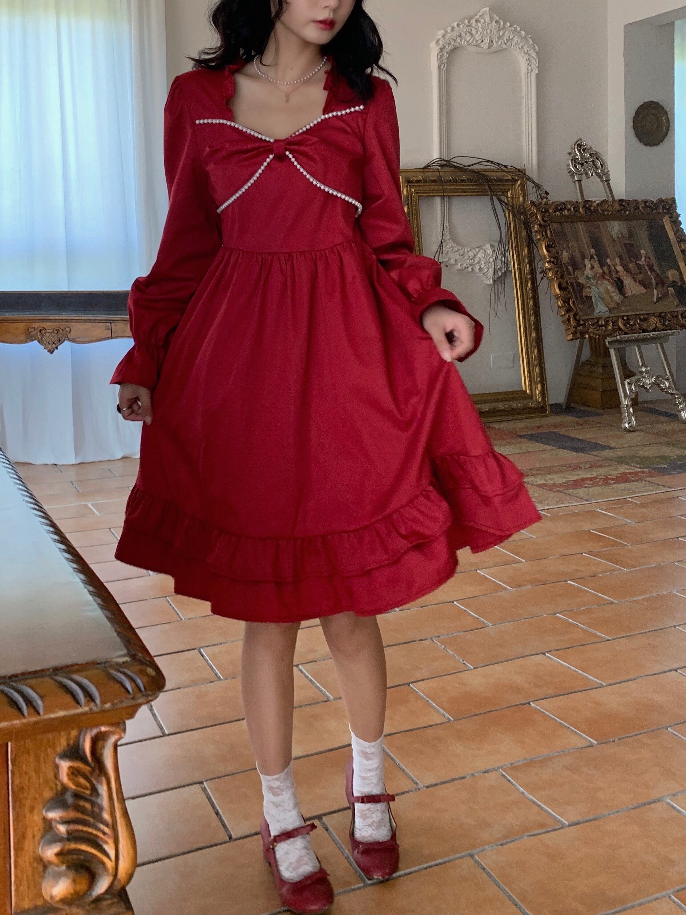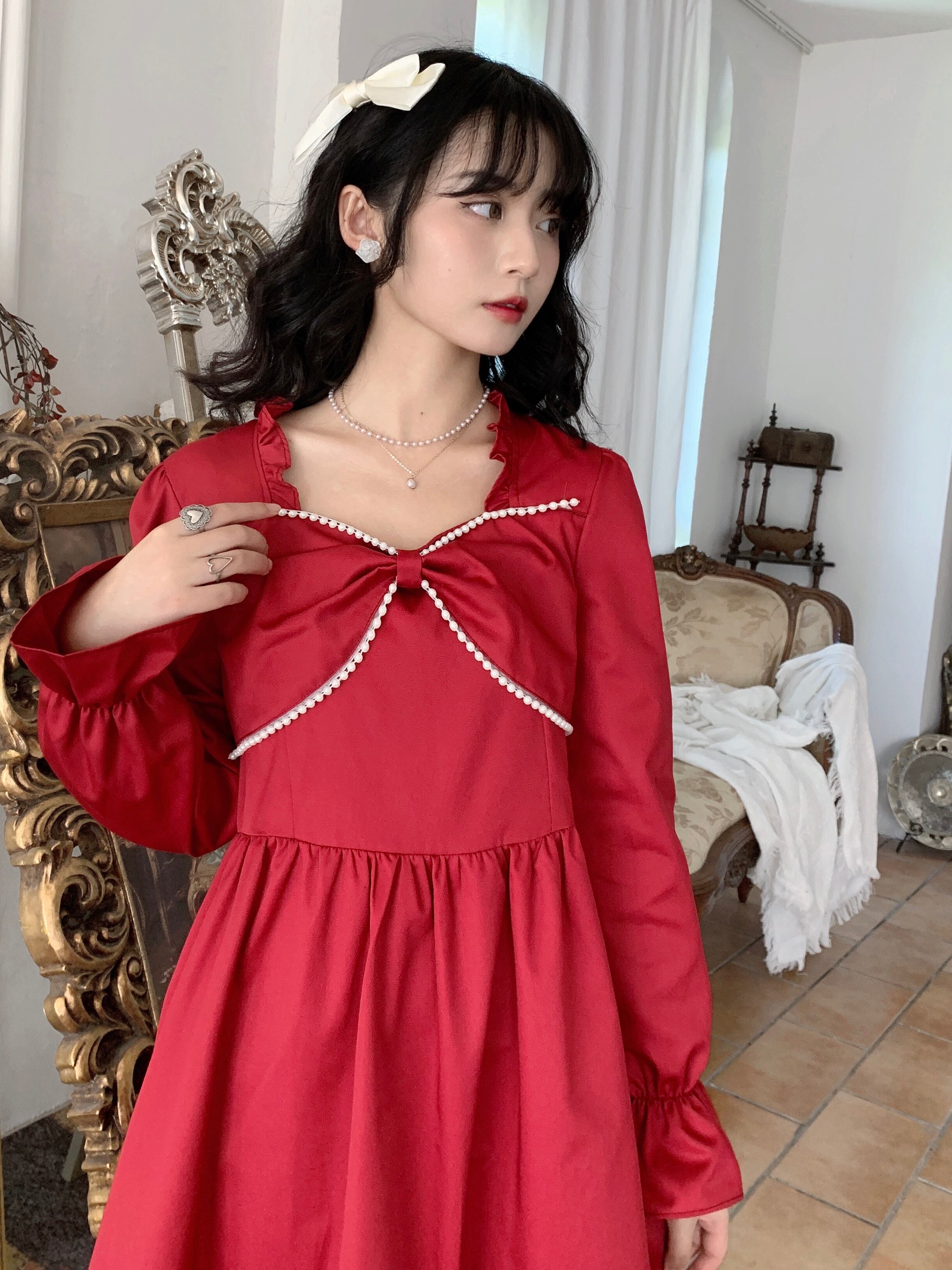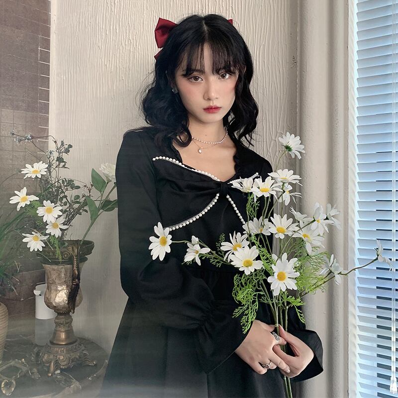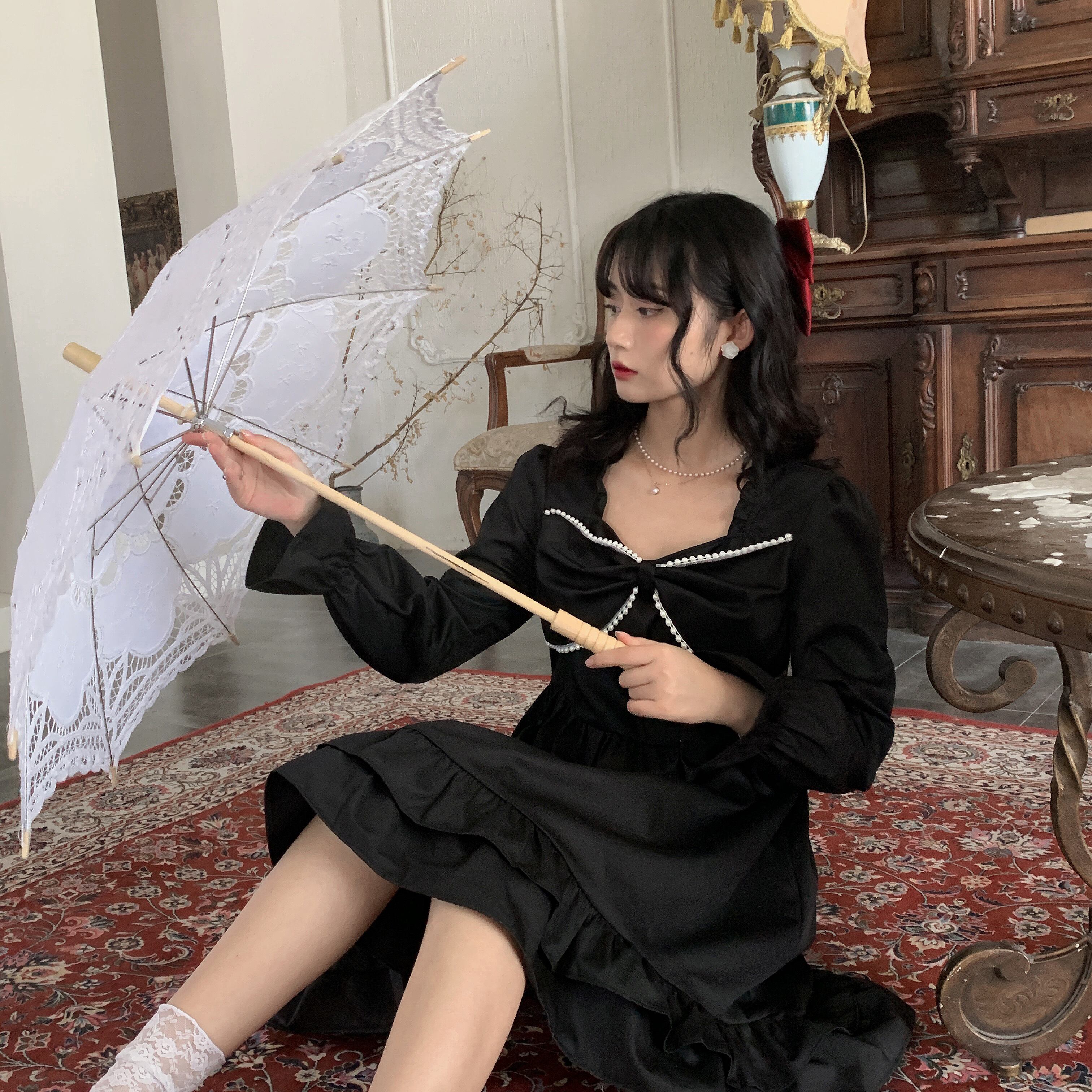 ✞ スカート パールリボン長袖スリーブラッフル ロング スウィート 真珠 スクウェア ✞ゴスロリ SM ミリ 甘ロリ クラロリ 和ロリ エレガント 黒ロリ 姫ロリ 華ロリ BB-BB23848668977