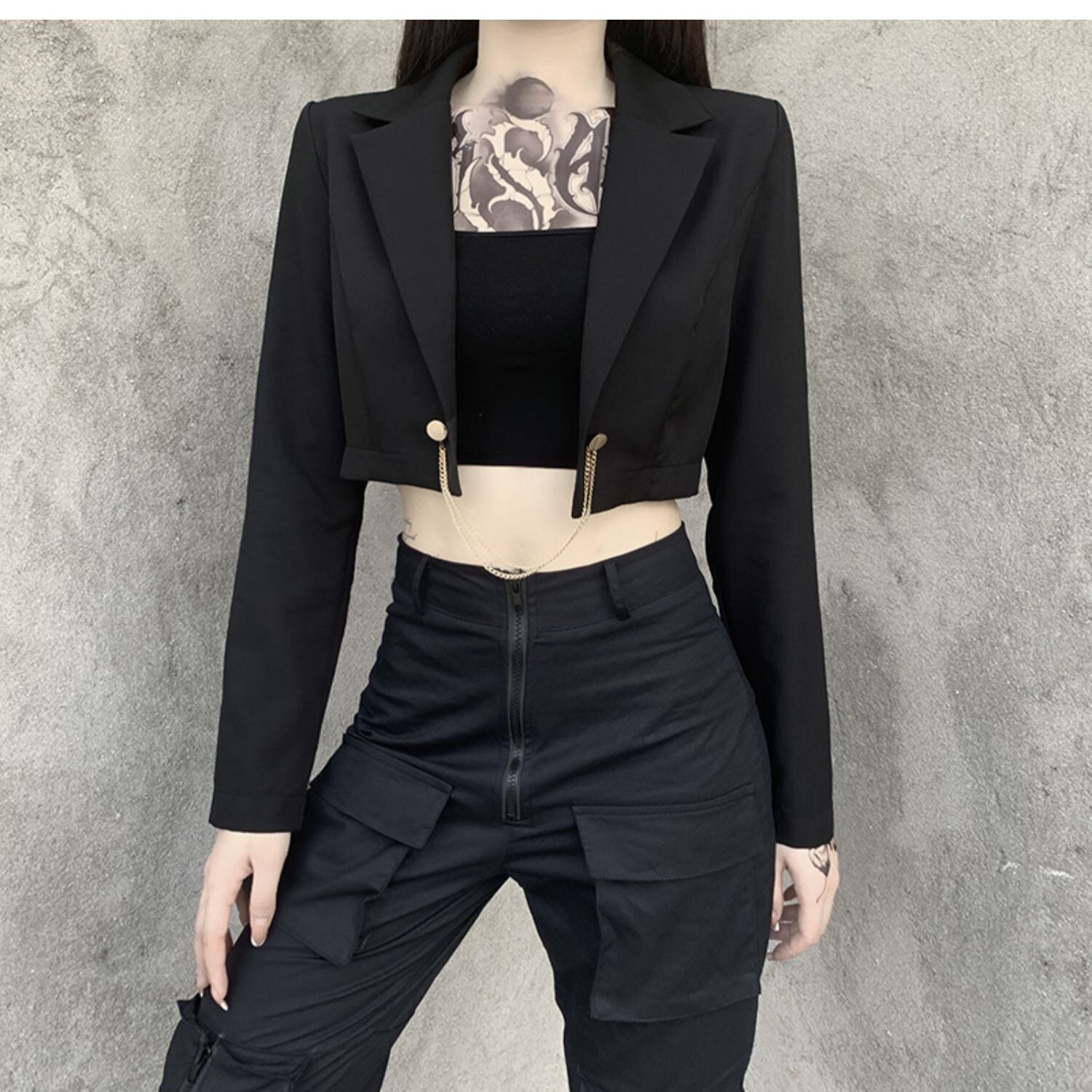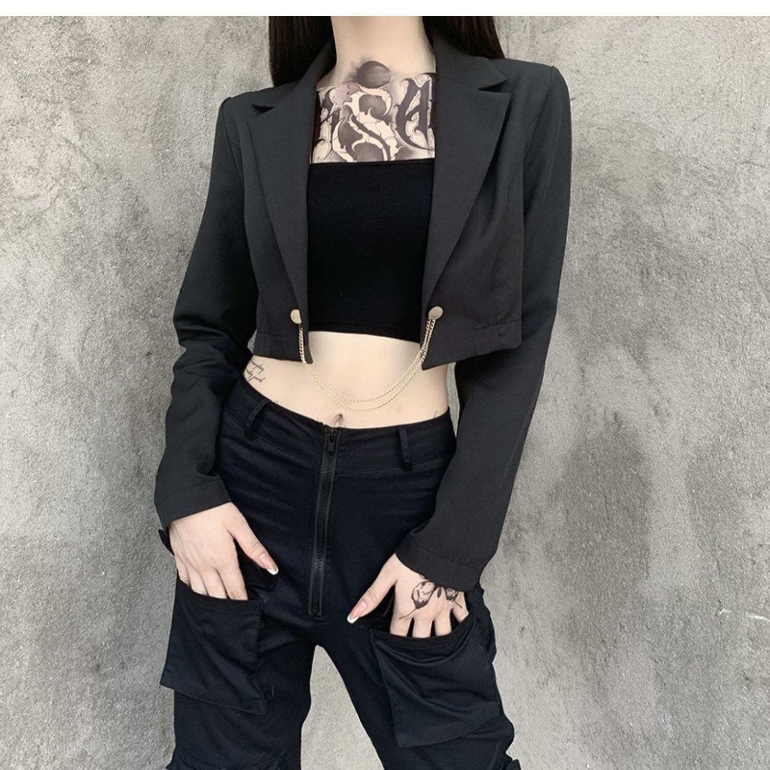 ✞✝✞ チェーン ショートジャケット 大人女子☆ウィンタースリムブラック ストリート 冬物 ✞✝✞ ゴスロリ SM ミリ 甘ロリ クラロリ 和ロリ エレガント 黒ロリ 姫ロリ 華ロリ AA-AA80673340558