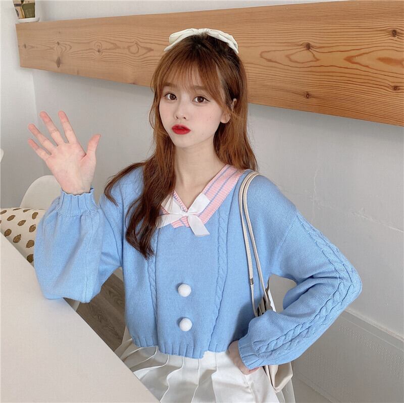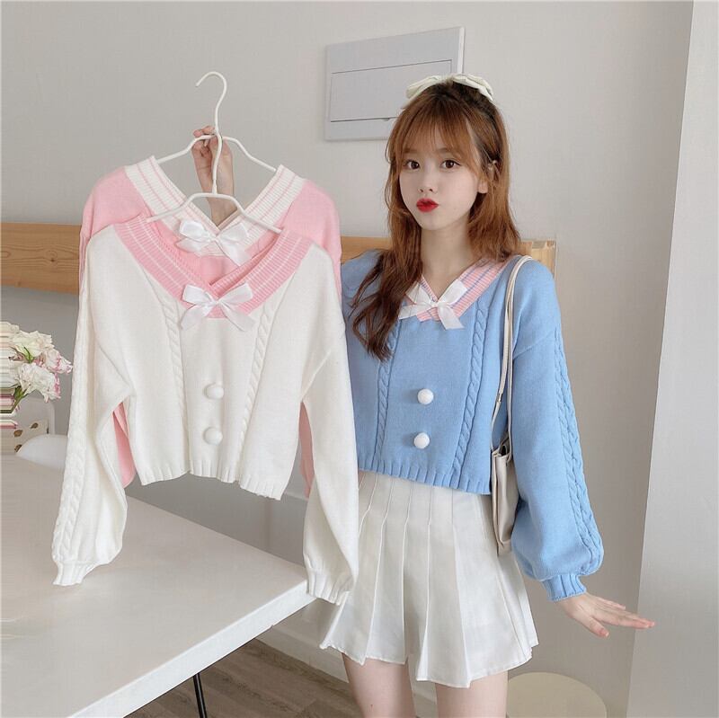 ✞ ♡セーター 大人女子☆Vネックリボンカラークロップドショートニットトップス ランタンスリーブ スウィート ✞ゴスロリ SM ミリ 甘ロリ クラロリ 和ロリ エレガント 黒ロリ 姫ロリ 華ロリ BB-BB31629930755