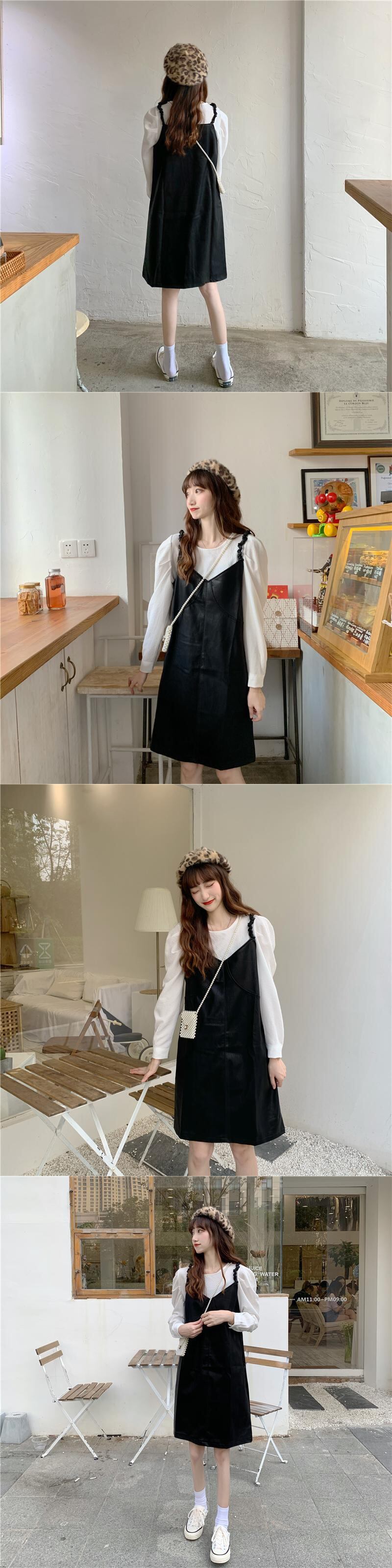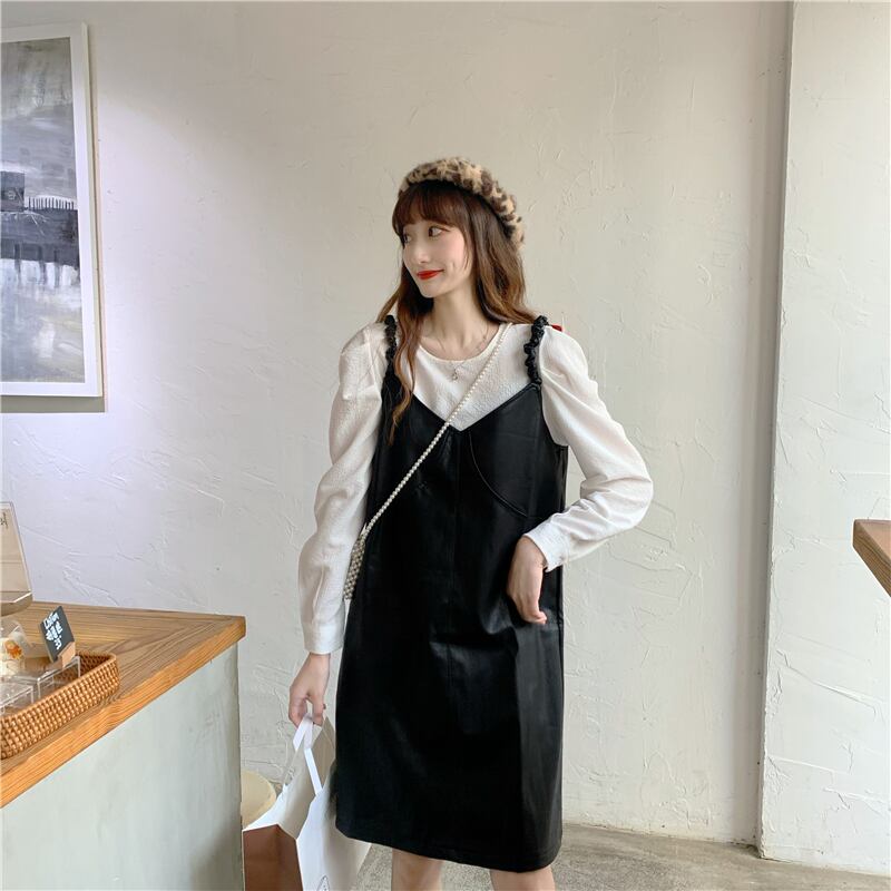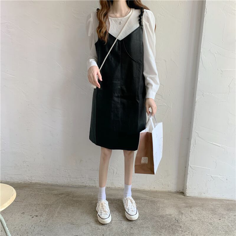 色:ブラックサスペンダースカートシングル,白いシャツワンピース