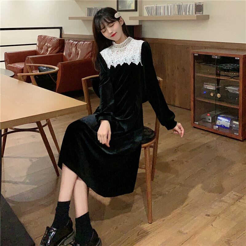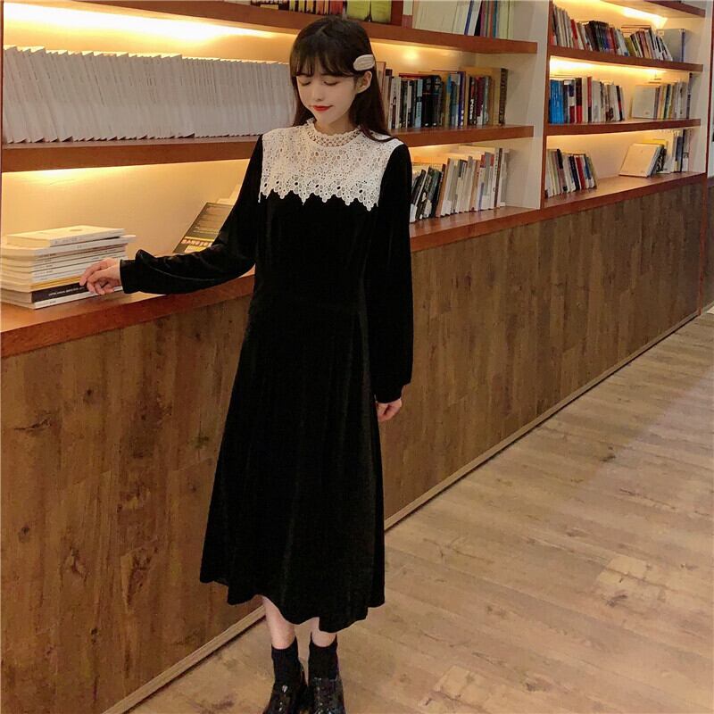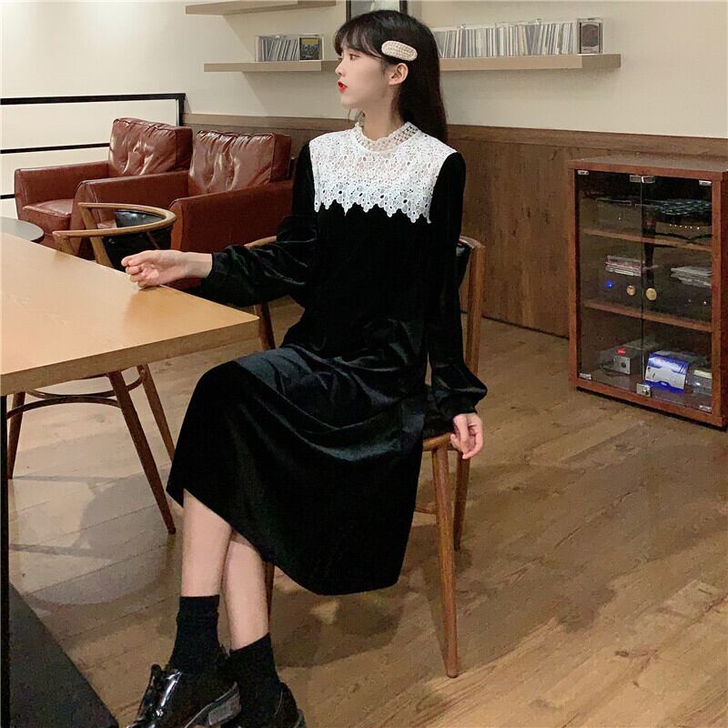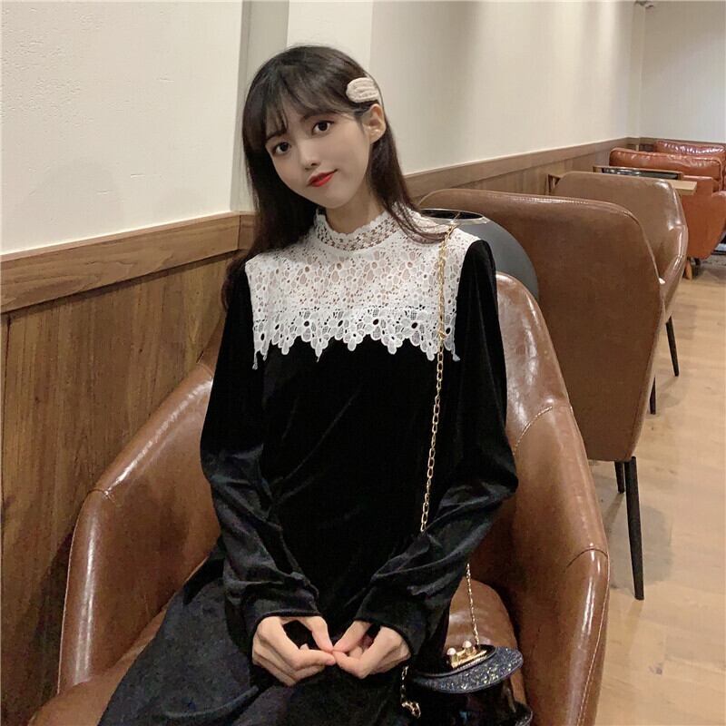 ✞ ベルベットブラックレーススタンドカラーロングスリム 長袖 スウィート ステッチ ✞ゴスロリ SM ミリ 甘ロリ クラロリ 和ロリ エレガント 黒ロリ 姫ロリ 華ロリ BB-BB76947807596