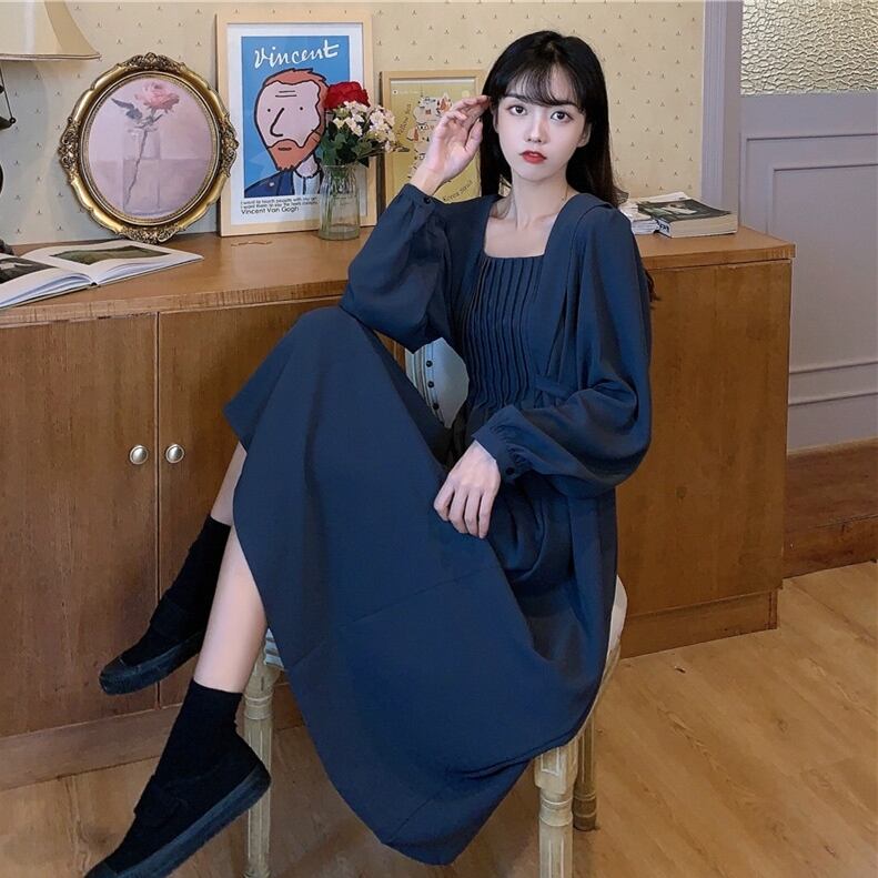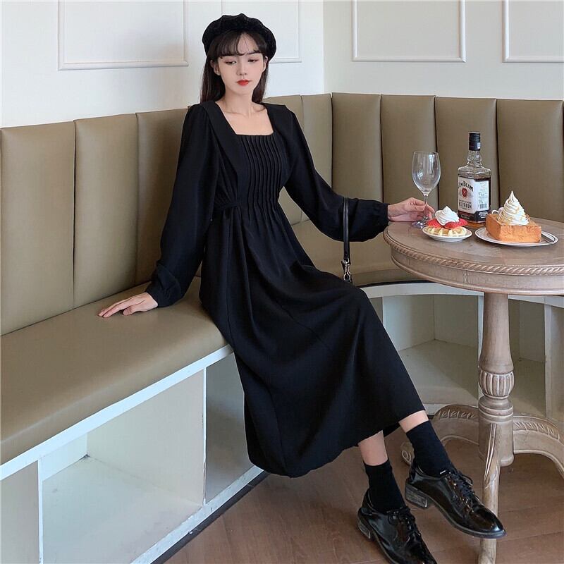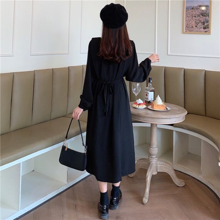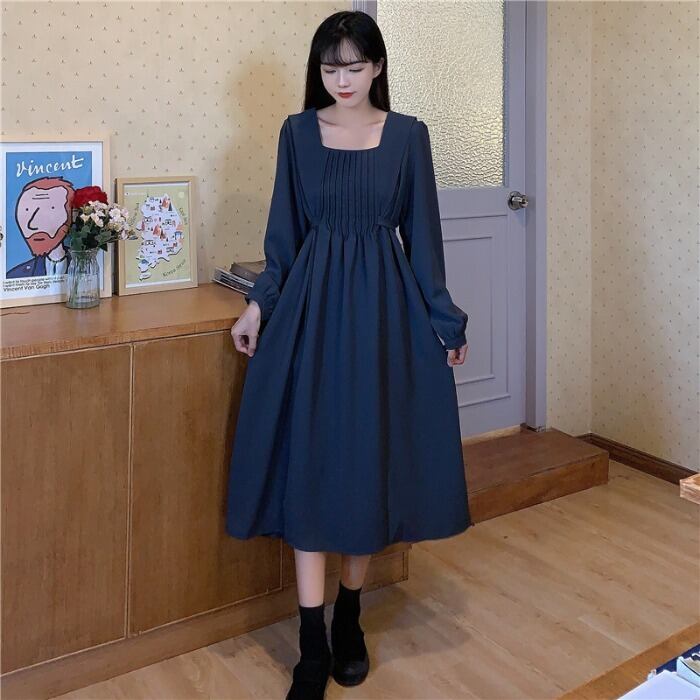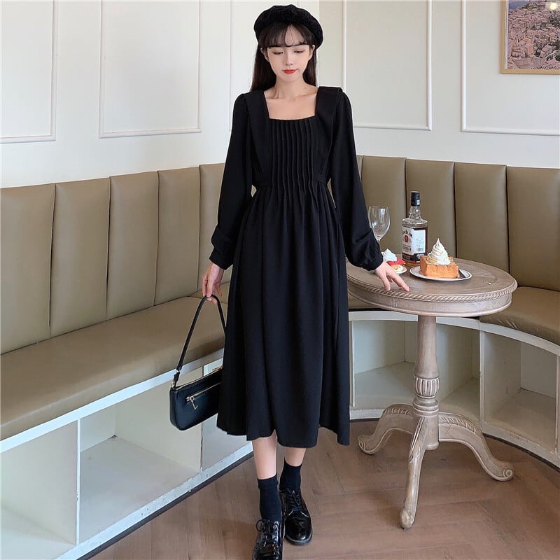 ✞清楚系スクエアネックシフォンワンピースドレスOP 長袖スリーブ ロング レトロ ソリッドカラー✞ゴスロリ SM ミリ 甘ロリ クラロリ 和ロリ エレガント 黒ロリ 姫ロリ 華ロリ BB-BB80372350700