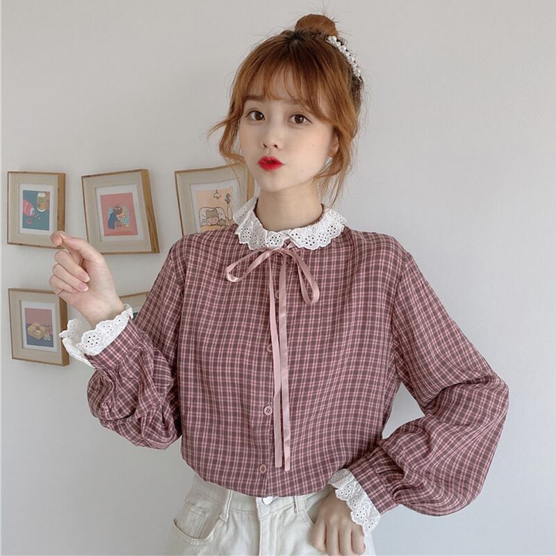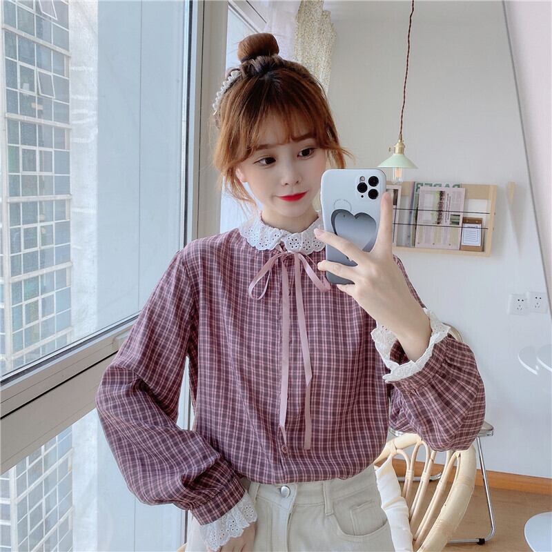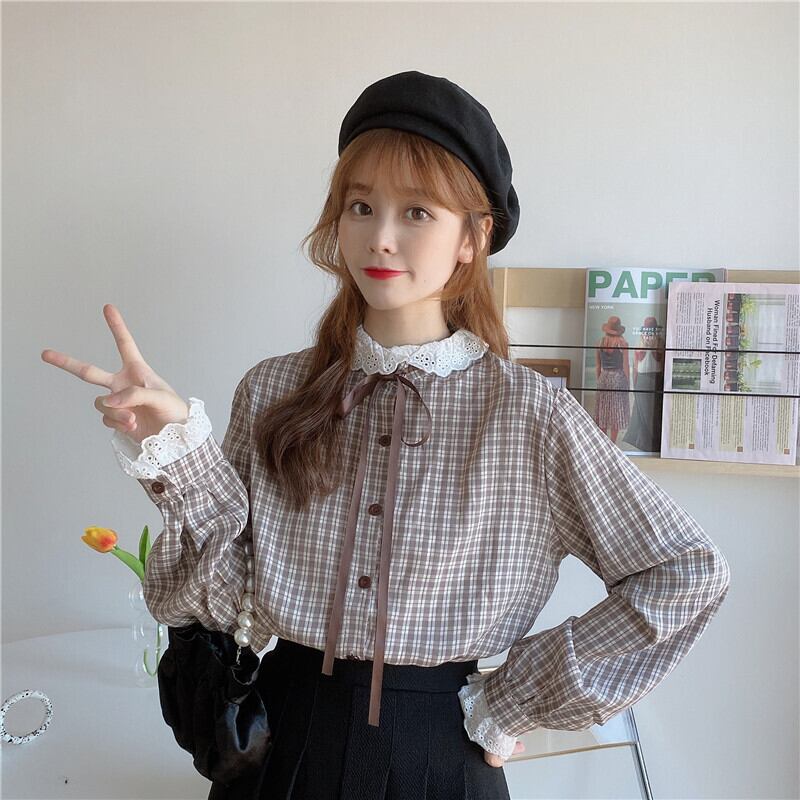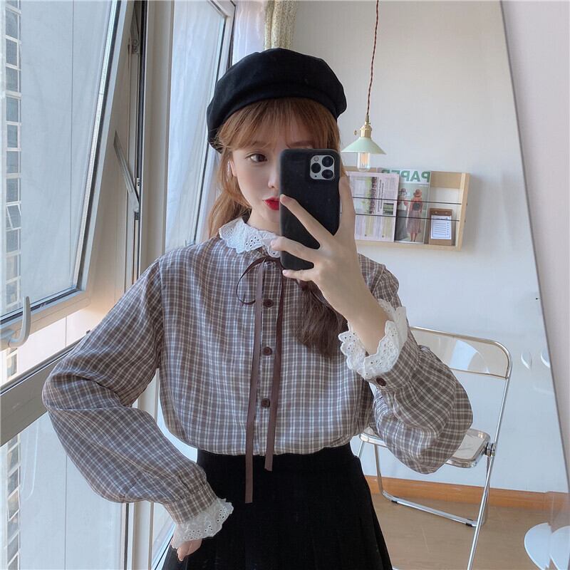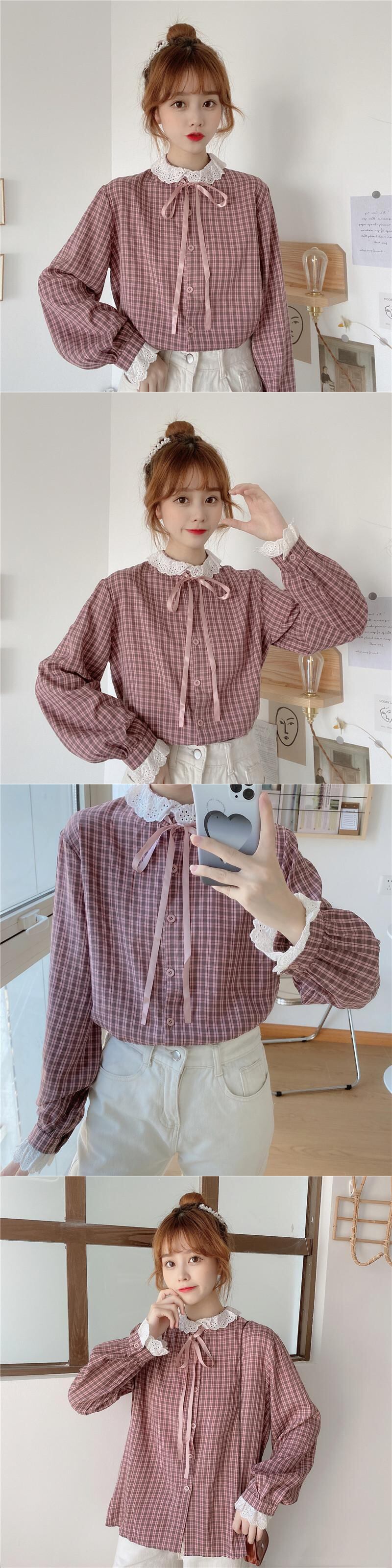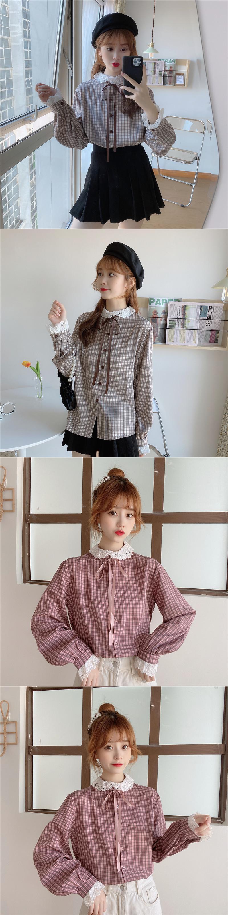 ✞ オータムラウンドネックスリーブスタンダードチェック柄シャツブラウス大人女子☆ ロング ランタンスリーブ レトロ レース スウィート 秋物 レースアップ ✞ゴスロリ SM ミリ 甘ロリ クラロリ 和ロリ エレガント 黒ロリ 姫ロリ 華ロリ BB-BB18456066530