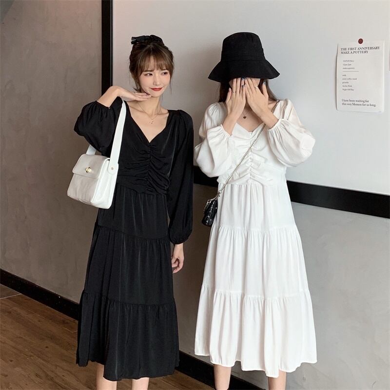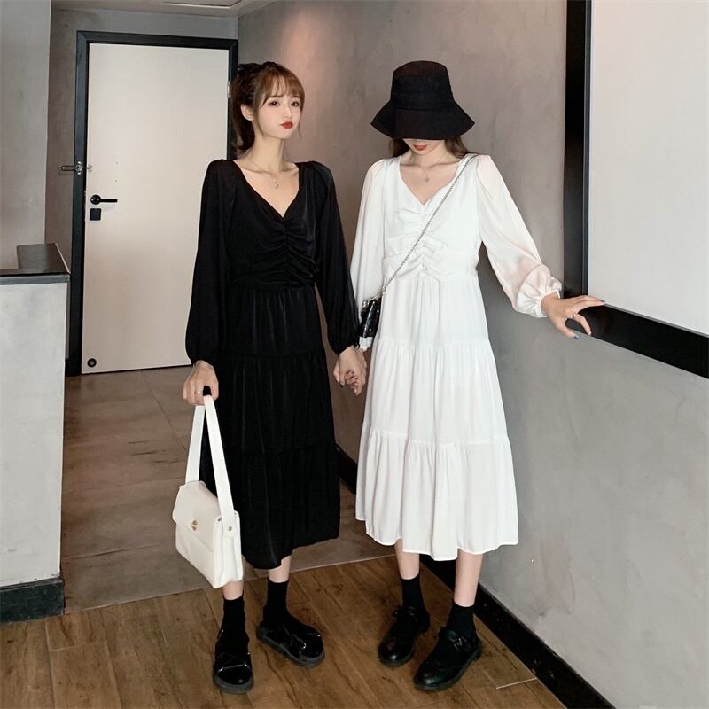 ✞ スカート 大人女子☆スタンダード★♥カワイイ♥ソリッド Vネックスリーブ長袖ドレス ワンピースオータム ロング レトロ 秋物 ソリッドカラー ✞ゴスロリ SM ミリ 甘ロリ クラロリ 和ロリ エレガント 黒ロリ 姫ロリ 華ロリ BB-BB49581961329