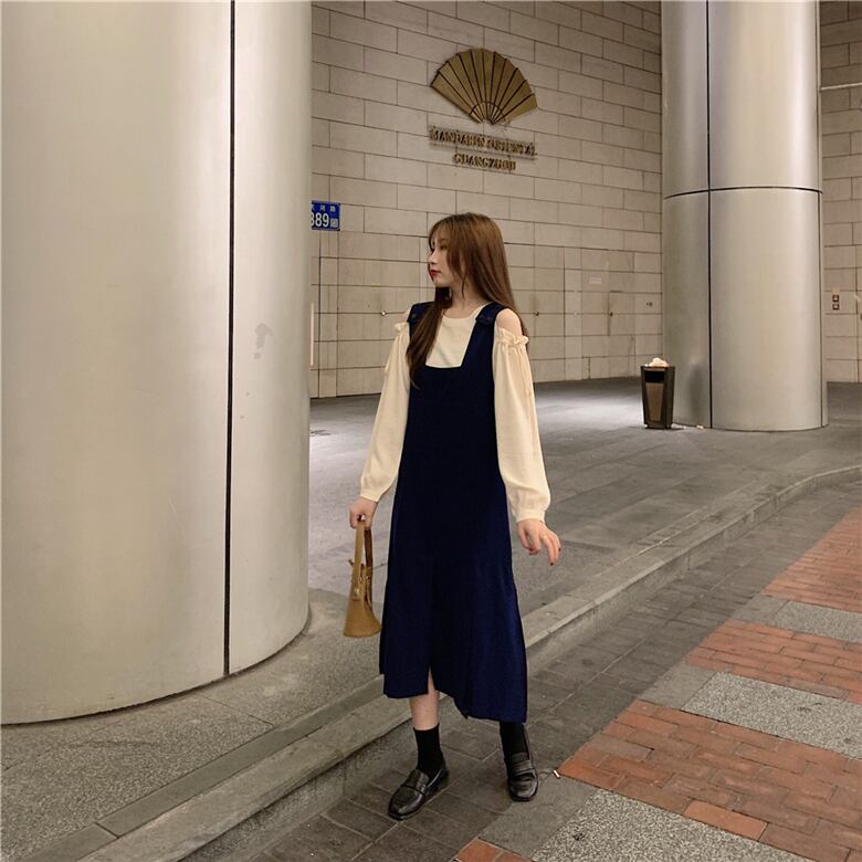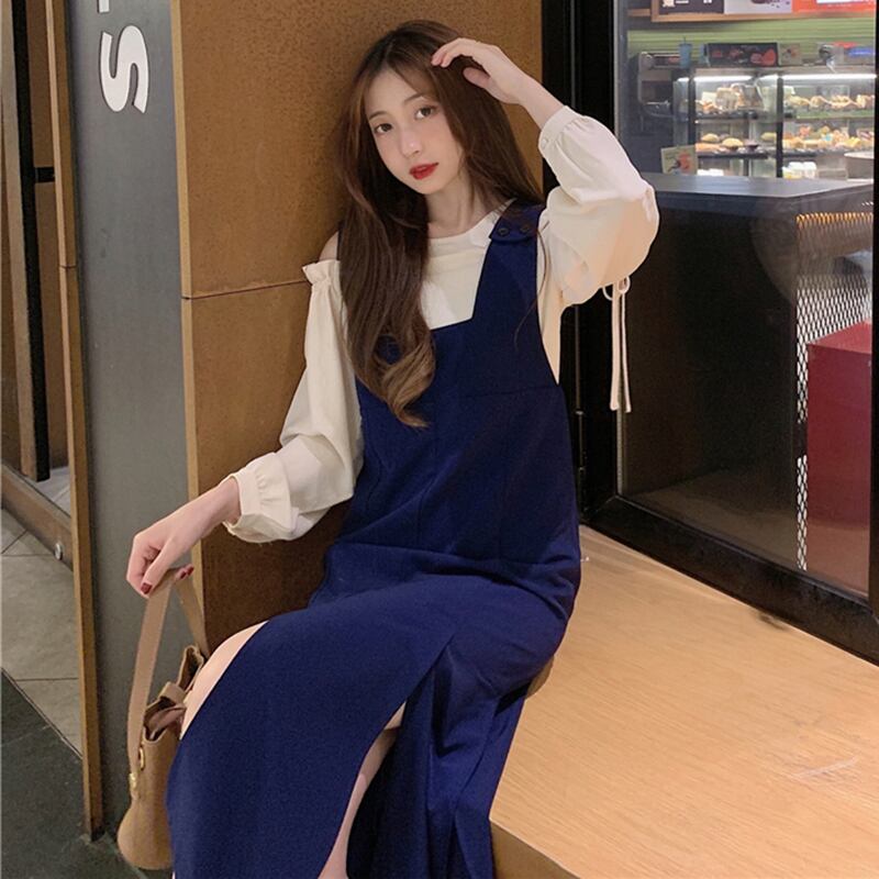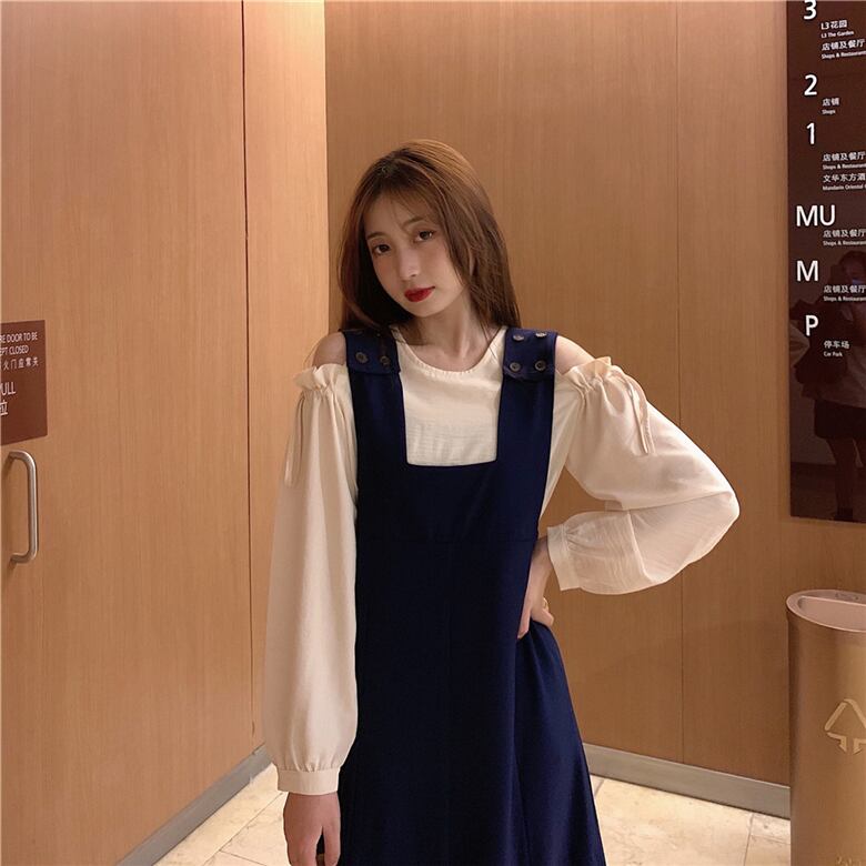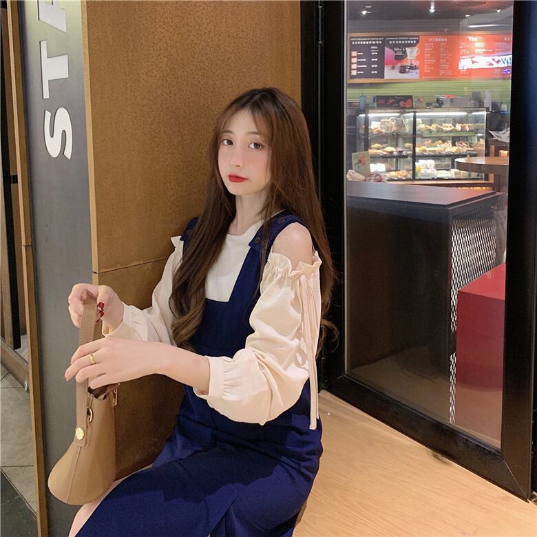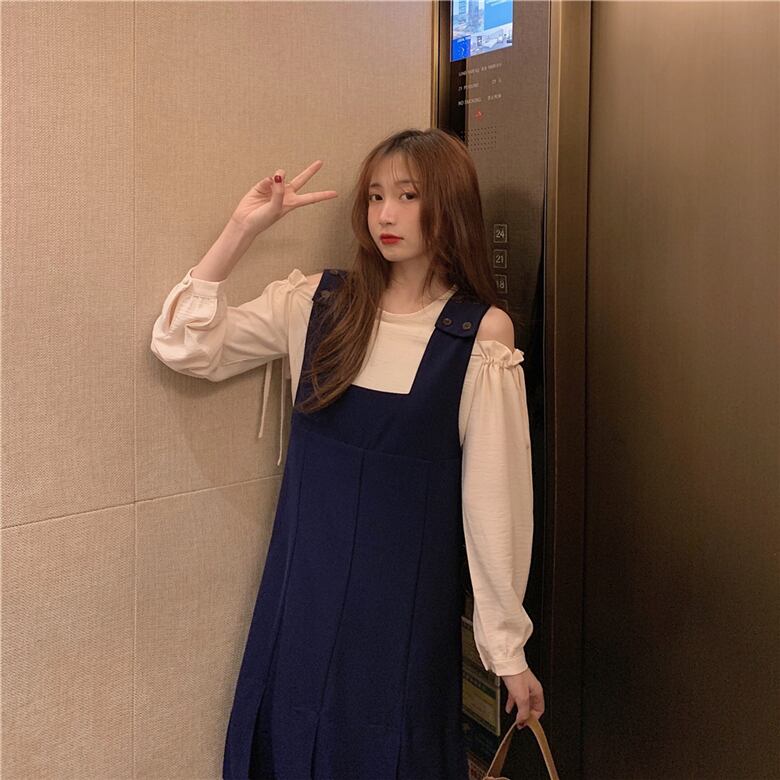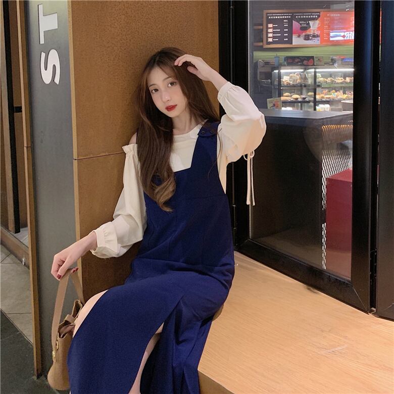 色:ブルーサスペンダースカートワンピース,アプリコットシャツワンピース