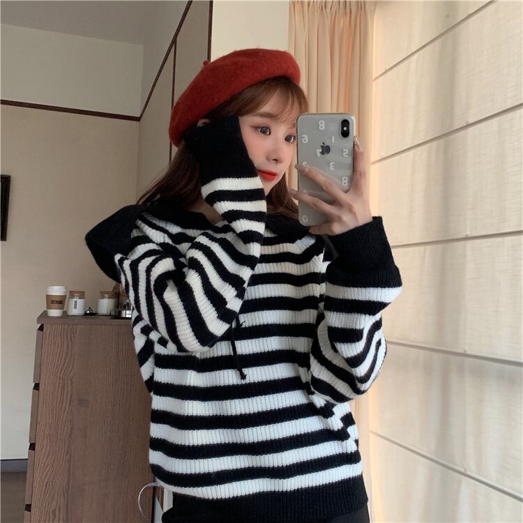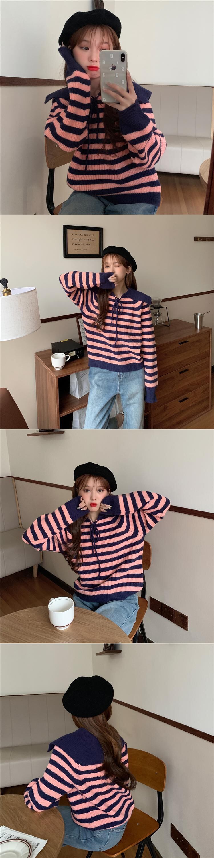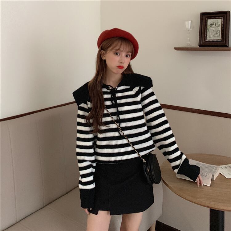 ✞ ♡セーター 大人女子☆リボンネイビー長袖スリーブカラーストライプニットトップス ロング スウィート ✞ゴスロリ SM ミリ 甘ロリ クラロリ 和ロリ エレガント 黒ロリ 姫ロリ 華ロリ BB-BB41487777825