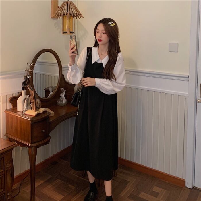 色:白いシャツワンピース,アプリコットシャツワンピース,ブラックスカートワンピース,カーキスカートワンピース