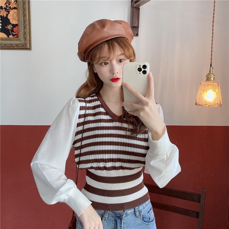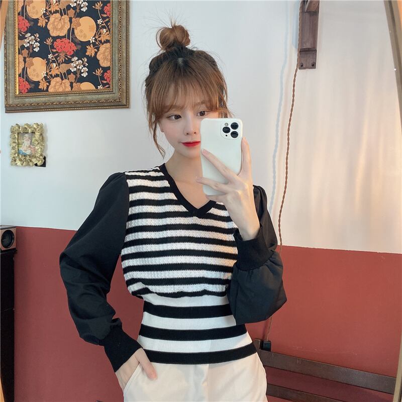 ✞ ストライプVネックプルオーバー ブラウス スリーブショートスリムニットセーター ガーリー ステッチ ✞ゴスロリ SM ミリ 甘ロリ クラロリ 和ロリ エレガント 黒ロリ 姫ロリ 華ロリ BB-BB52954818690