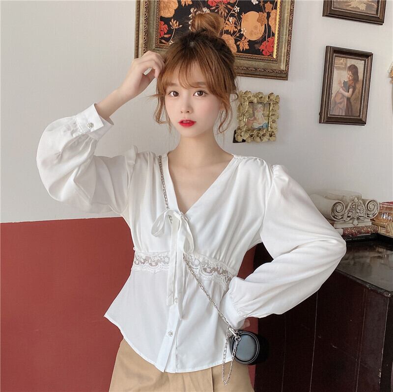 ✞ Vネックリボンレース★ショート白シャツブラウス ロング ホワイト スウィート ✞ゴスロリ SM ミリ 甘ロリ クラロリ 和ロリ エレガント 黒ロリ 姫ロリ 華ロリ BB-BB13262319373