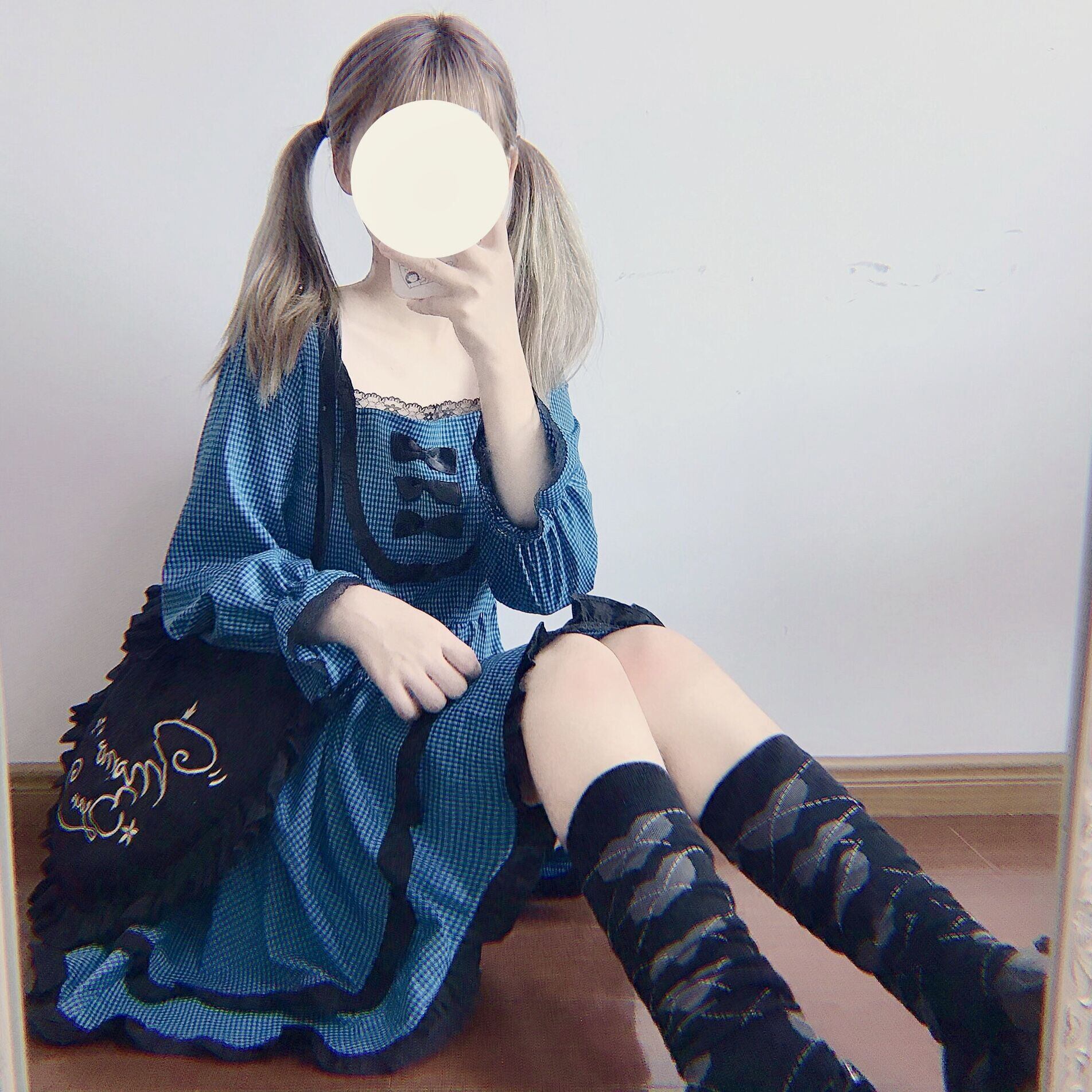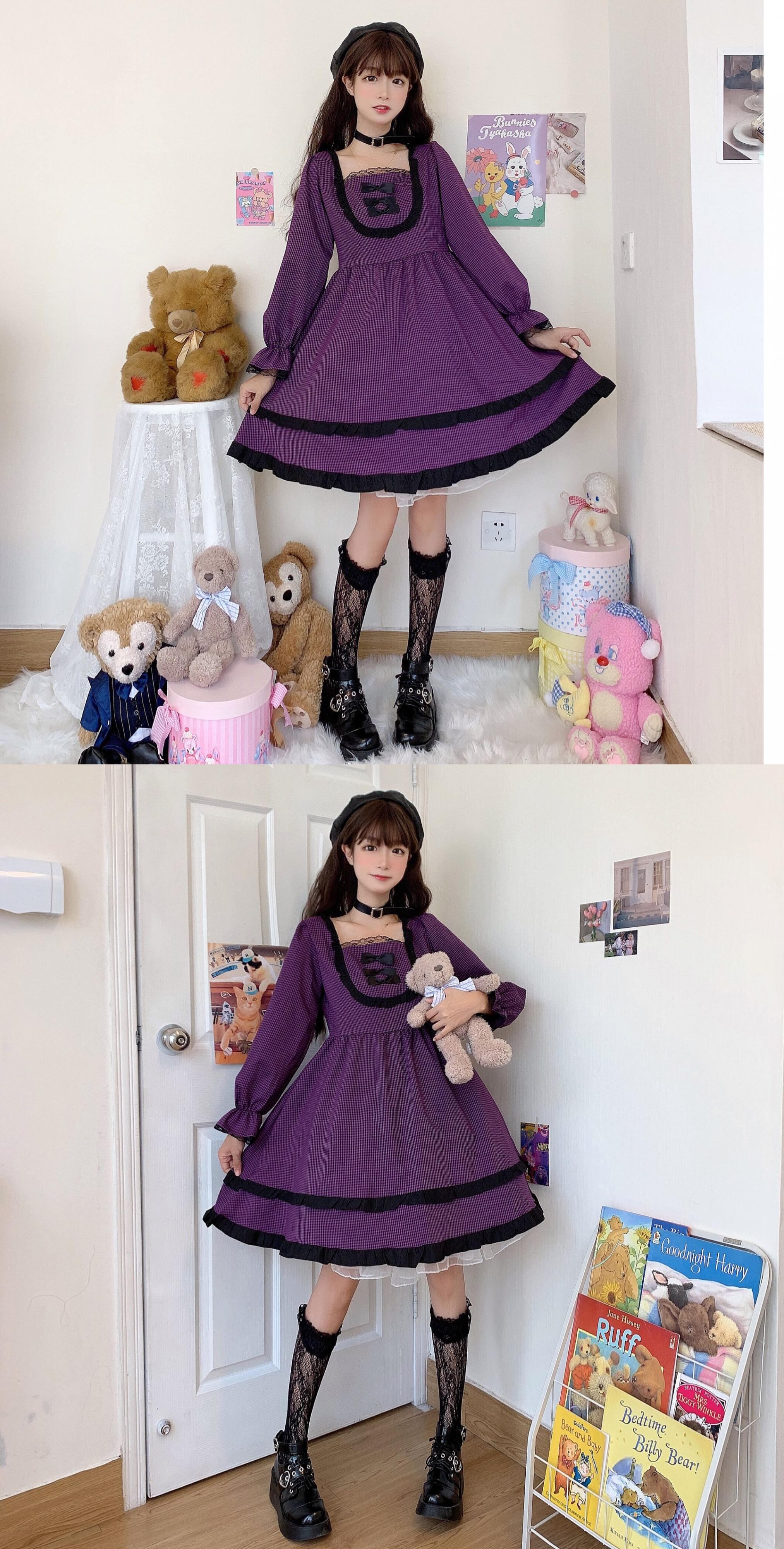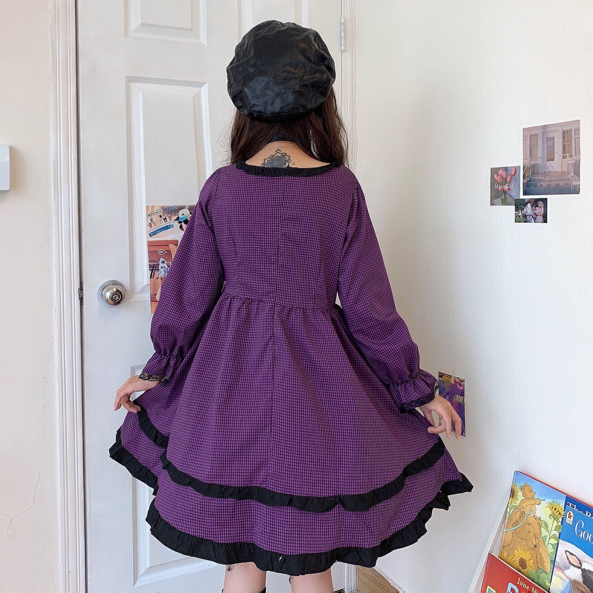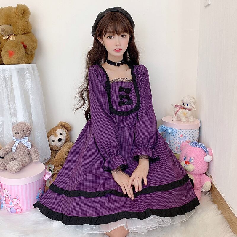 ✞ レースリボンチェック柄ラッフル ロング パープル スクウェア ステッチ ✞ゴスロリ SM ミリ 甘ロリ クラロリ 和ロリ エレガント 黒ロリ 姫ロリ 華ロリ BB-BB13637839746