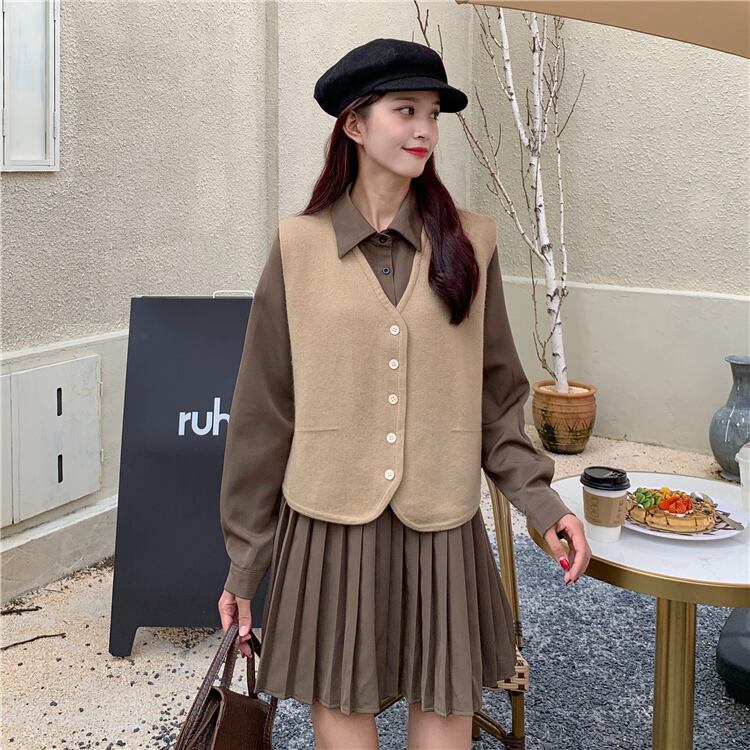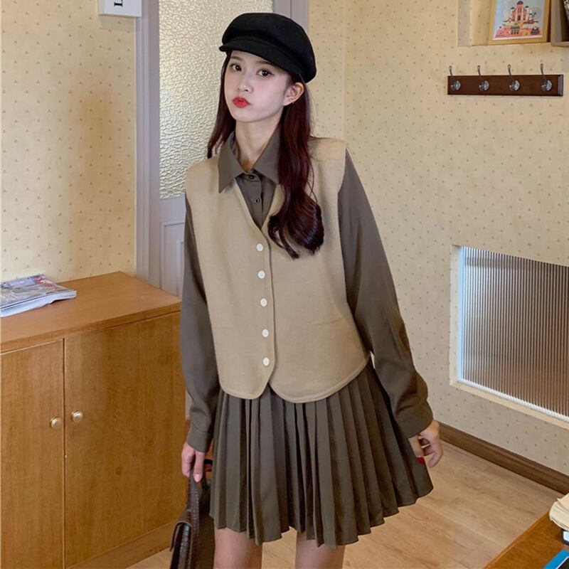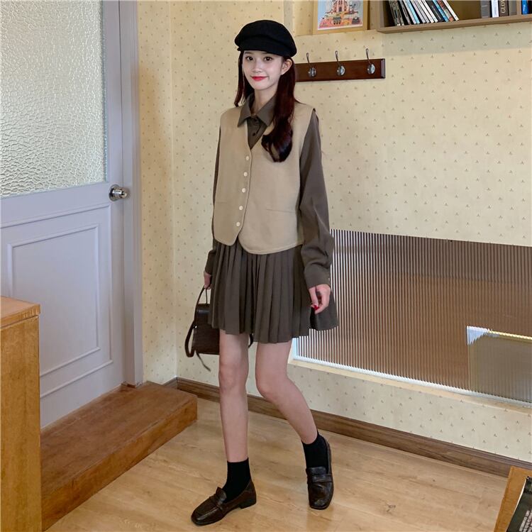色:カーキベストワンピース,グレーベストシングルピース,コーヒーカラープリーツスカートワンピース,ブラックプリーツスカートワンピース