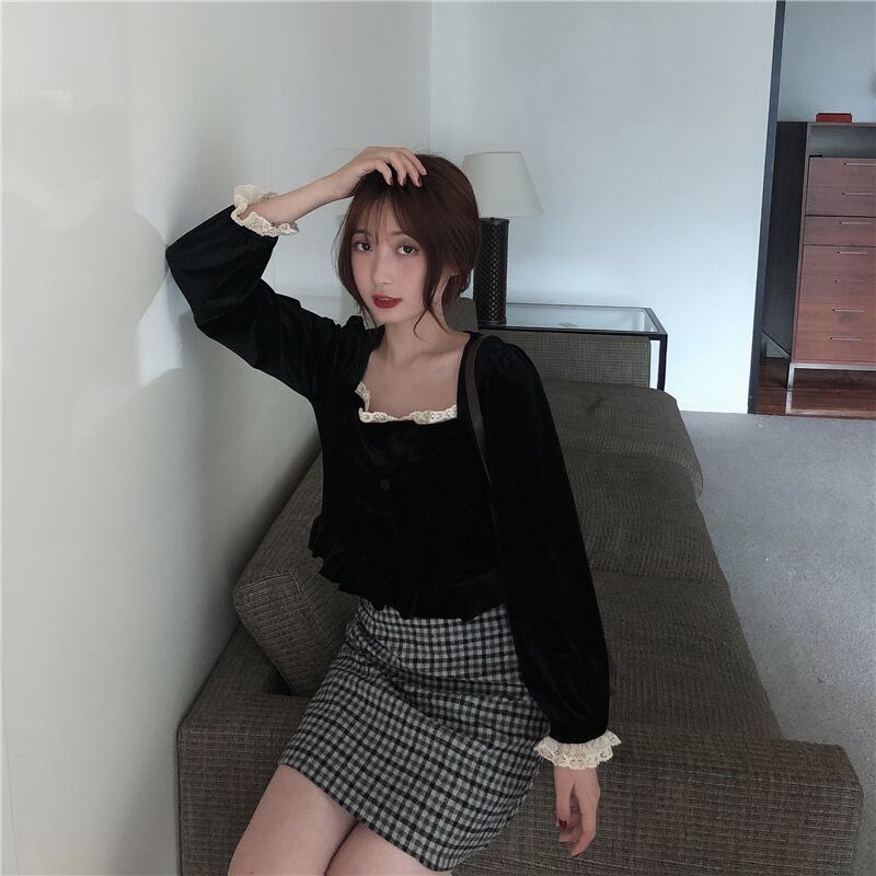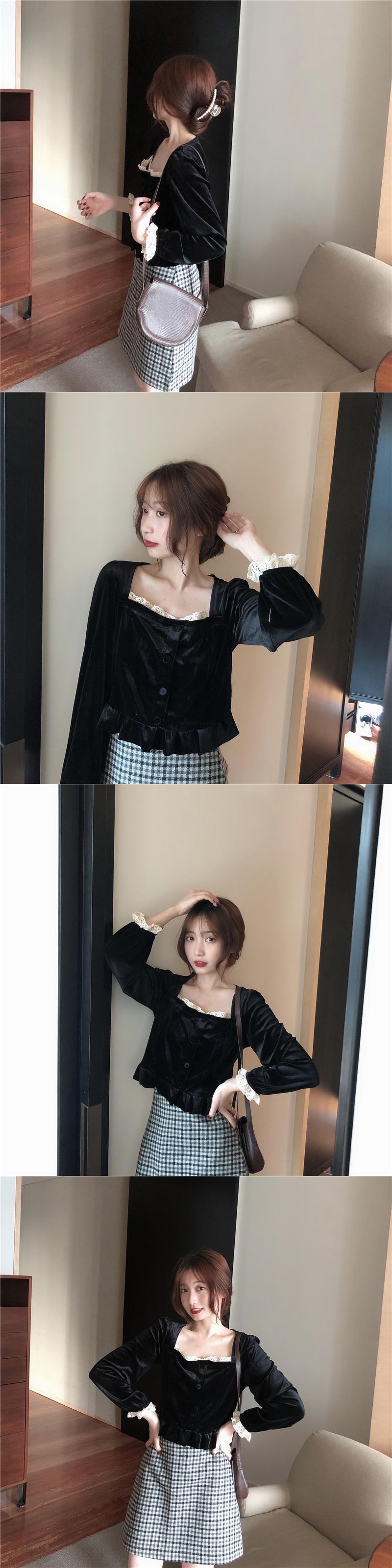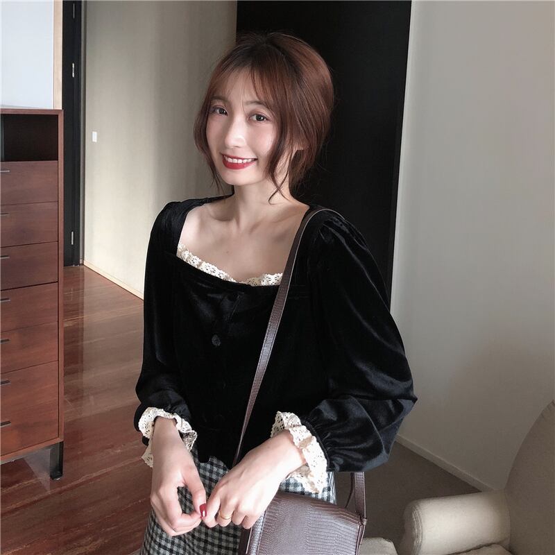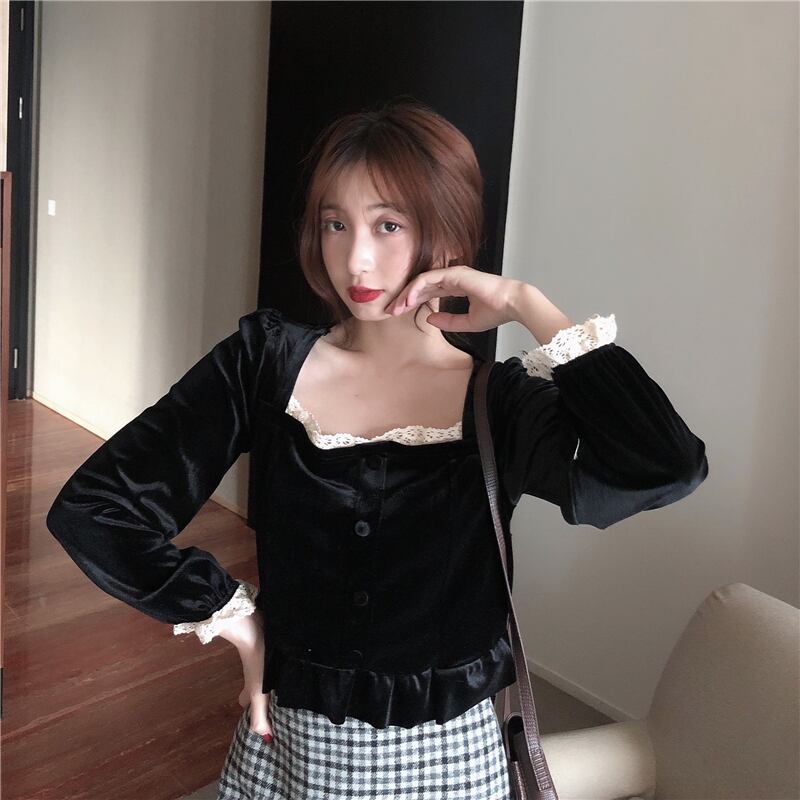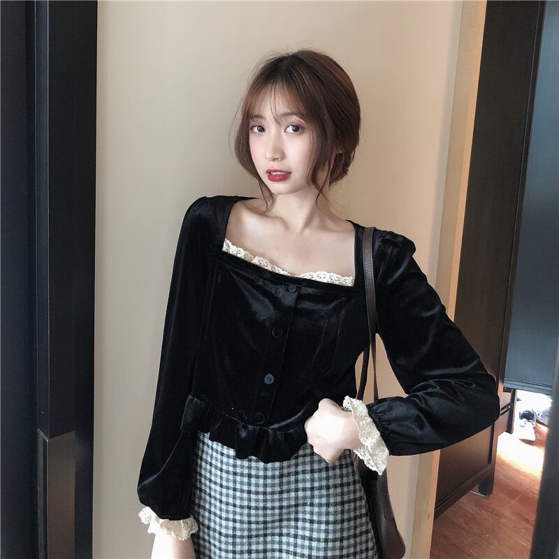 ✞ スタンダードレースゴールドベルベットロングスリムショートシャツブラウス大人女子☆ レトロ 長袖 スクウェア ✞ゴスロリ SM ミリ 甘ロリ クラロリ 和ロリ エレガント 黒ロリ 姫ロリ 華ロリ BB-BB25658690735