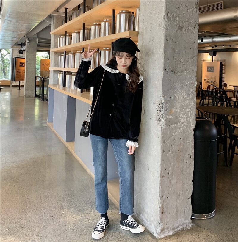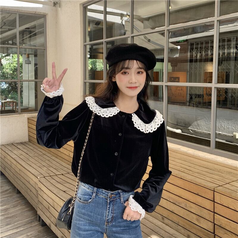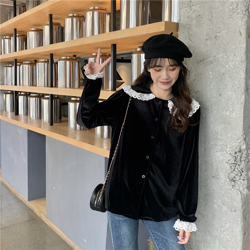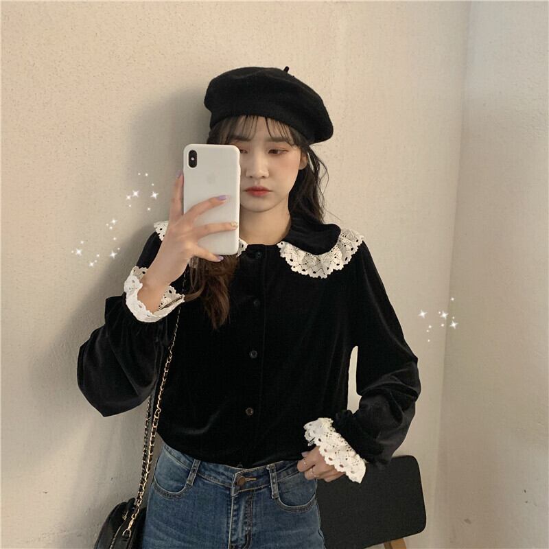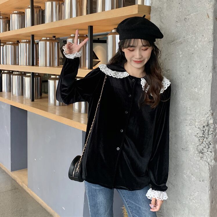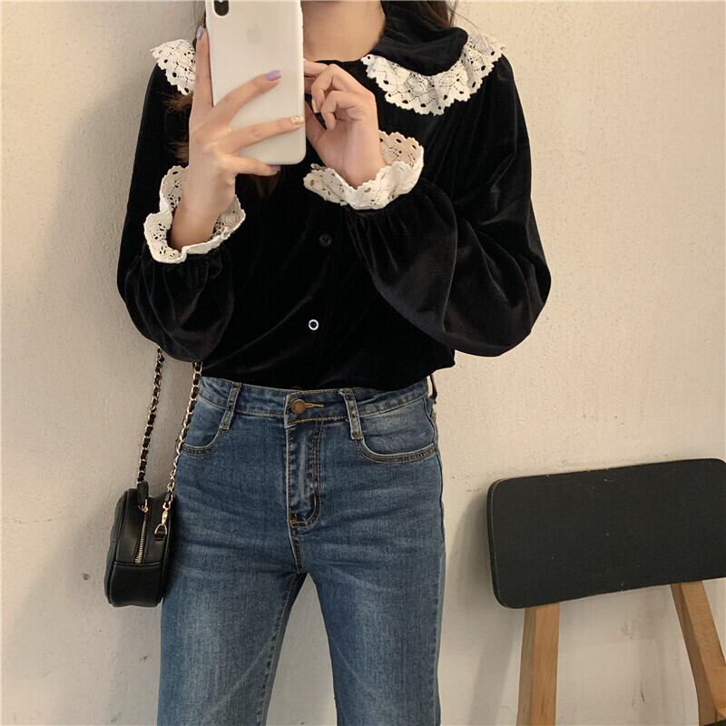 ✞ スタンダードレースベルベットシャツブラウス♥カワイイ♥ブラック大人女子☆ レトロ スウィート ステッチ ✞ゴスロリ SM ミリ 甘ロリ クラロリ 和ロリ エレガント 黒ロリ 姫ロリ 華ロリ BB-BB34713254584