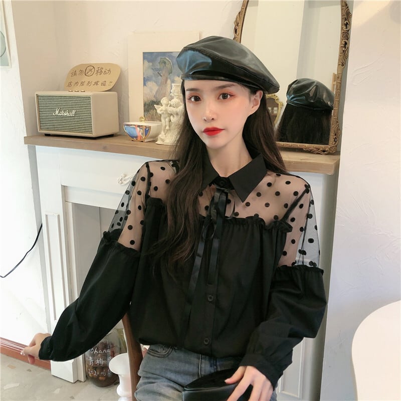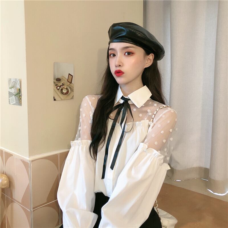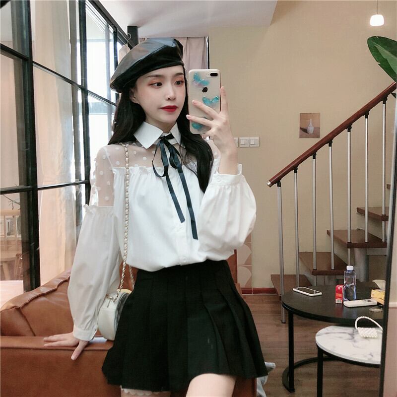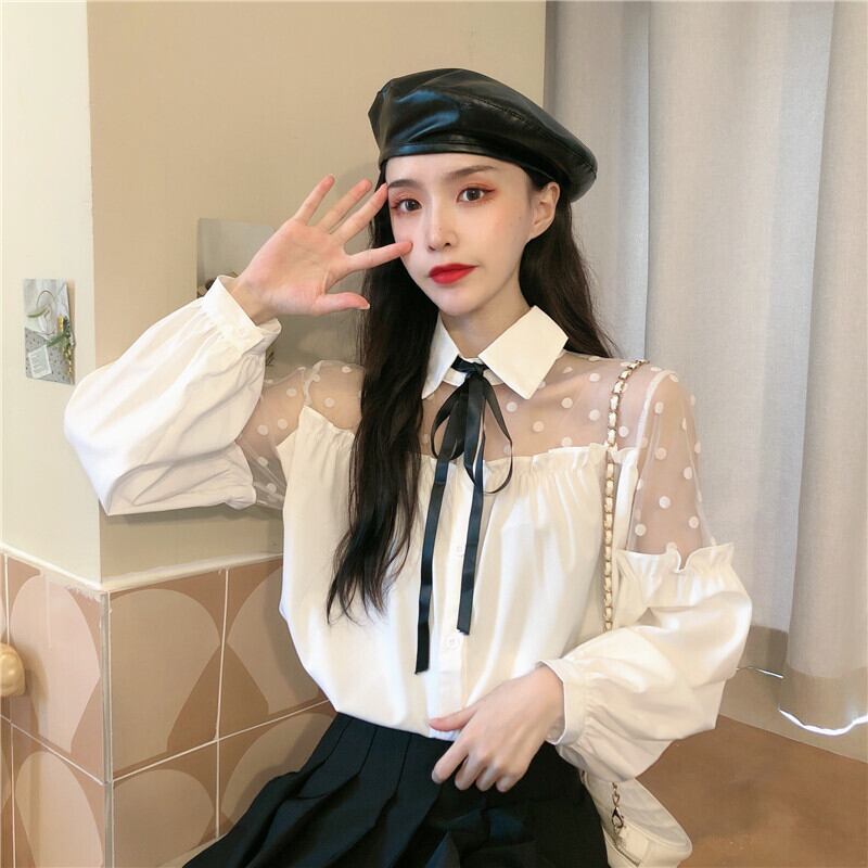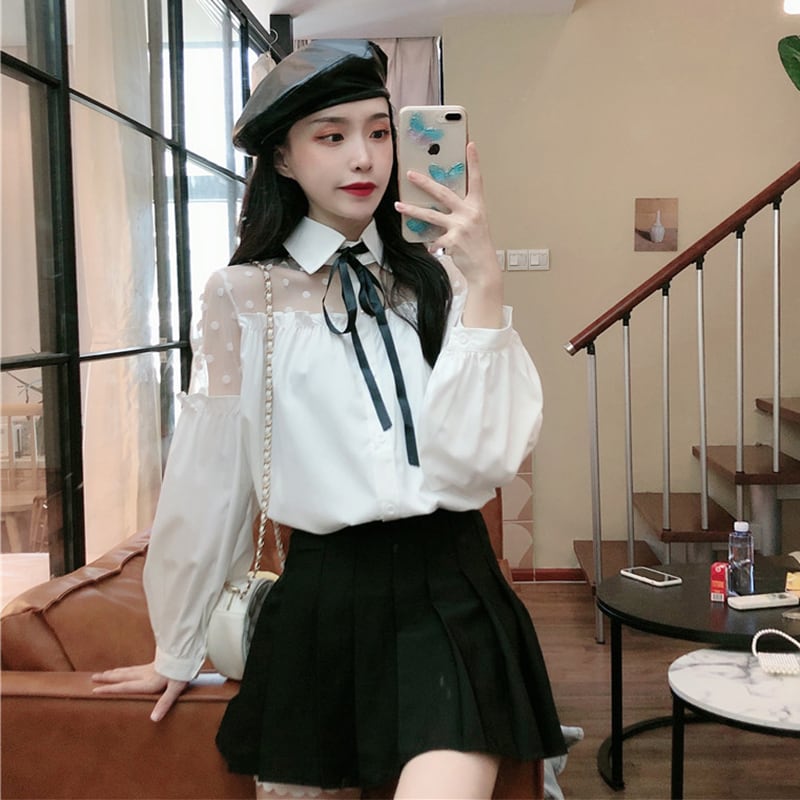 ✞ メッシュスリーブリボン白シャツブラウス ホワイト ステッチ ✞ゴスロリ SM ミリ 甘ロリ クラロリ 和ロリ エレガント 黒ロリ 姫ロリ 華ロリ BB-BB66681018158