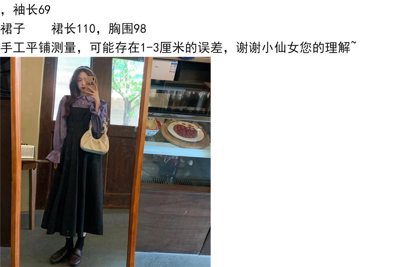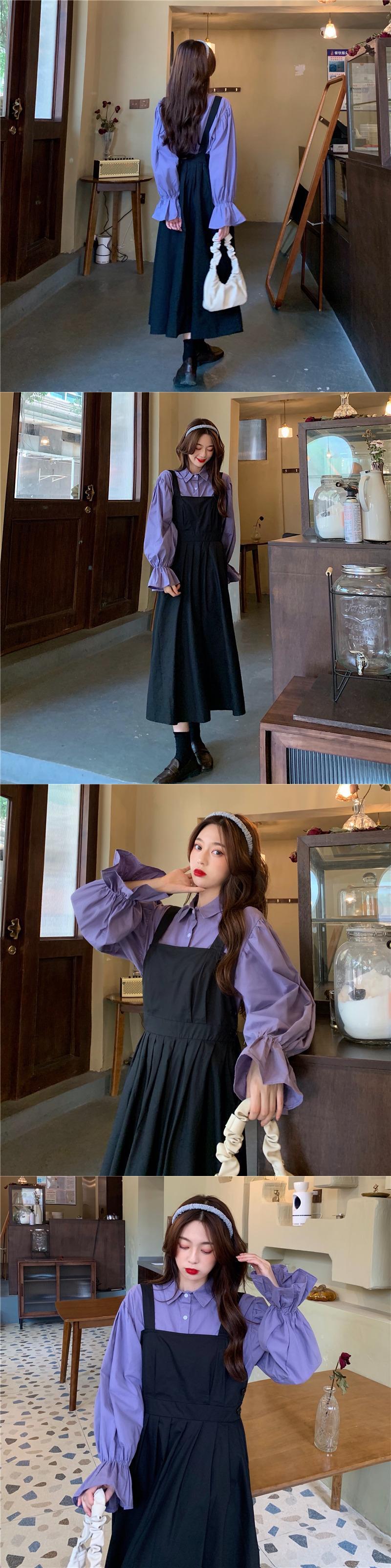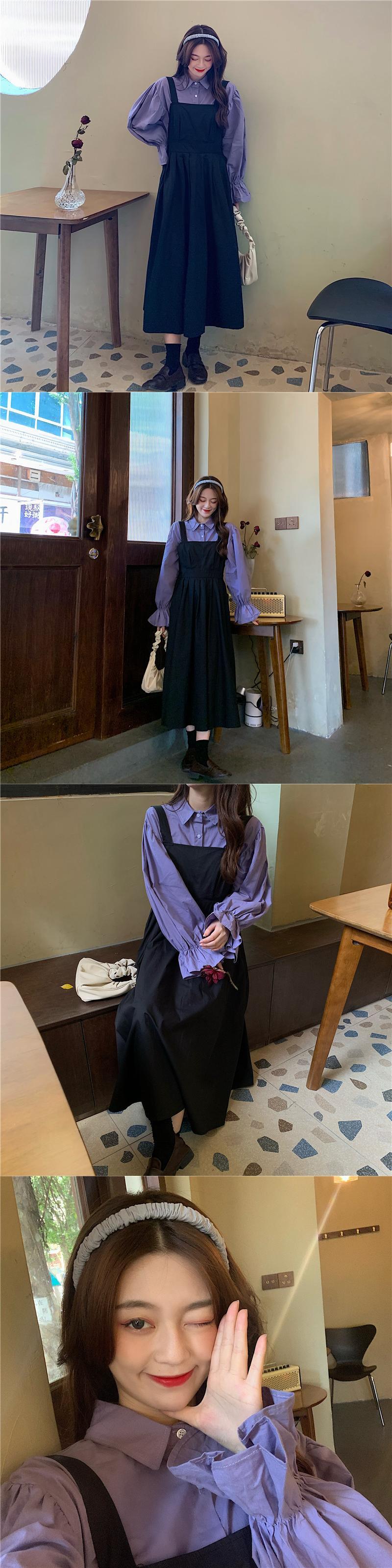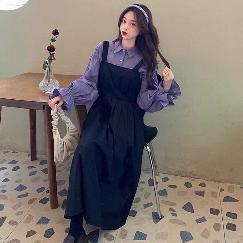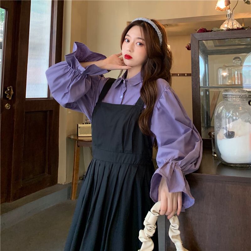 色:紫のシャツワンピース,ブラックストラップスカートワンピース