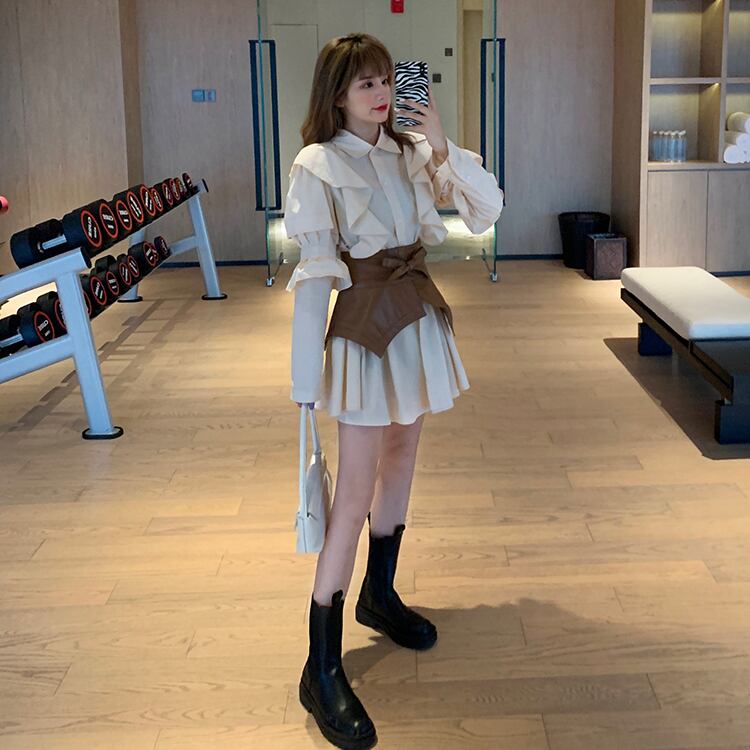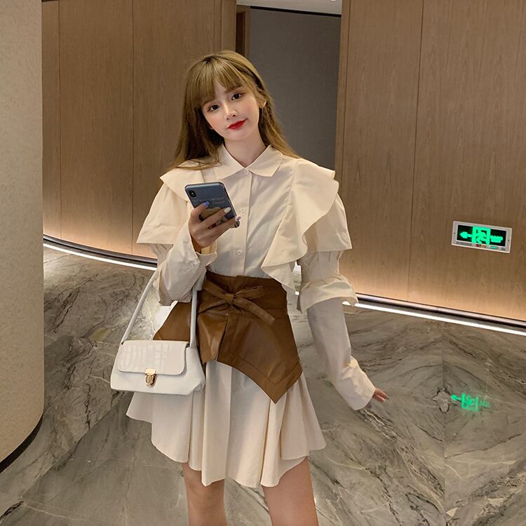 色:アプリコットシャツワンピース,カーキウエストワンピース