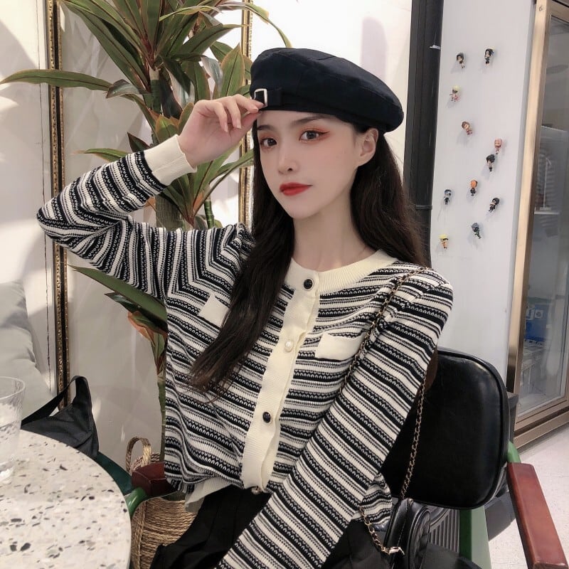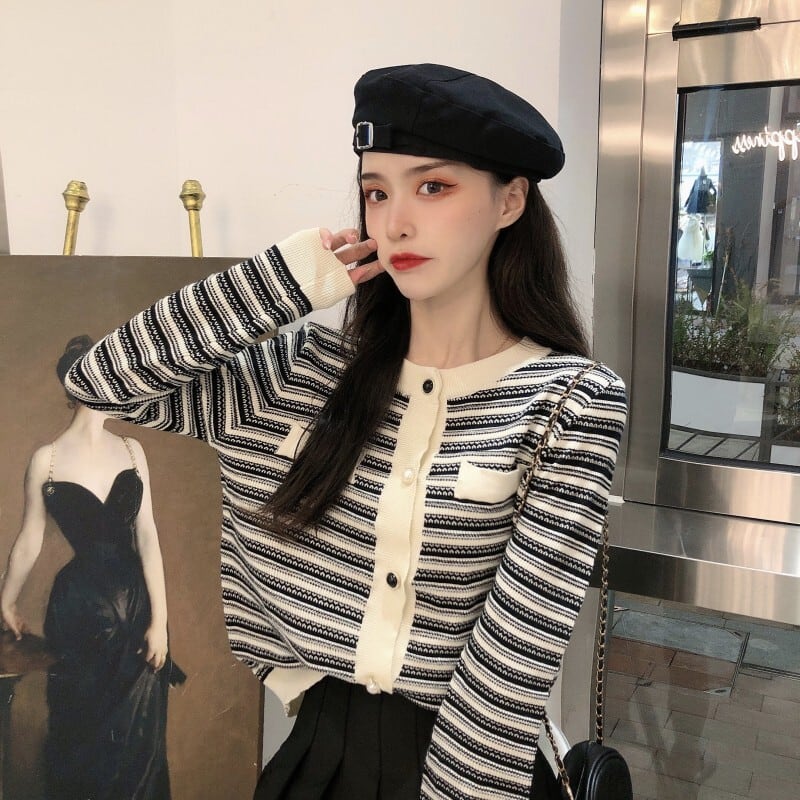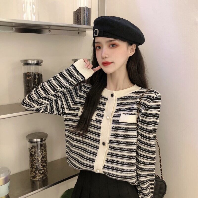 ✞ストライプショート丈ニットカーディガンセーター ジャケット CA ラウンドネック♡大人女子☆ ロング レトロ スウィート ✞ゴスロリ SM ミリ 甘ロリ クラロリ 和ロリ エレガント 黒ロリ 姫ロリ 華ロリ BB-BB39990545601