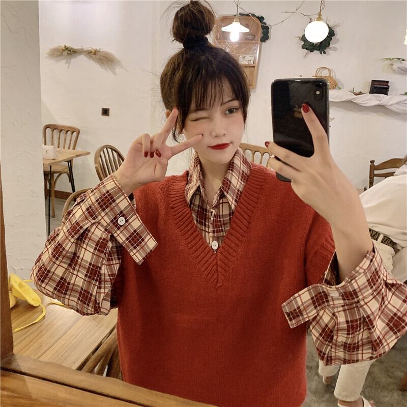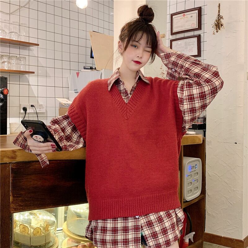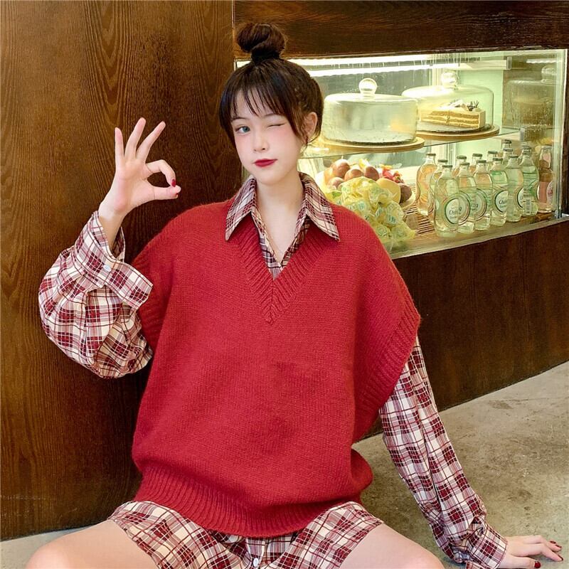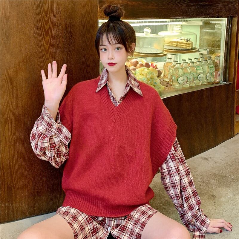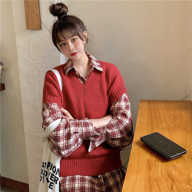 色:バーガンディベストシングルピース,チェック柄シャツシングル