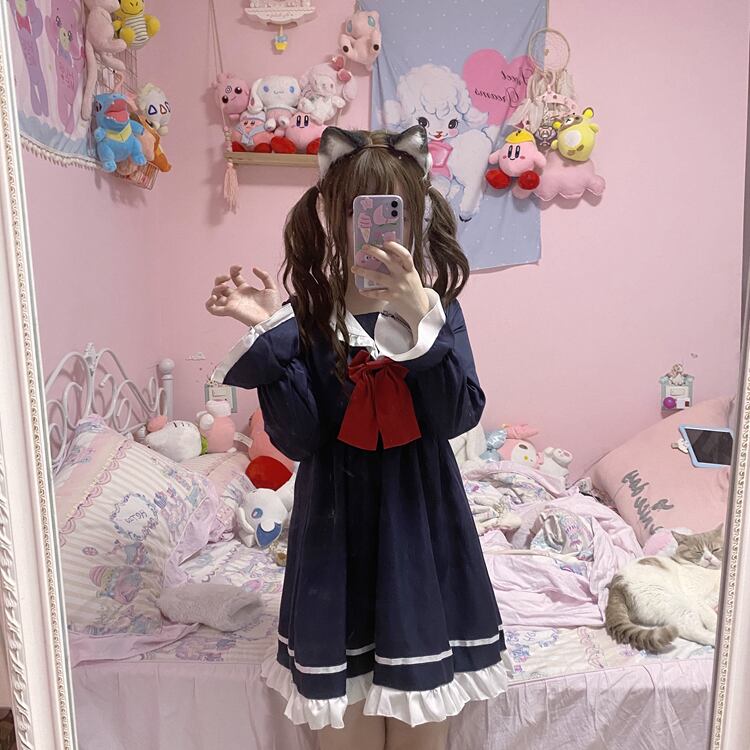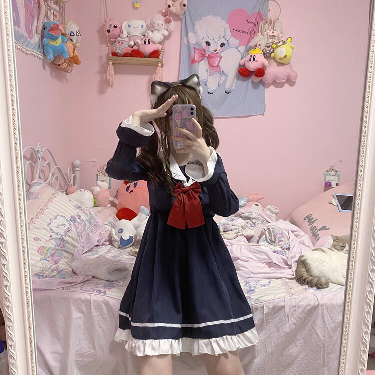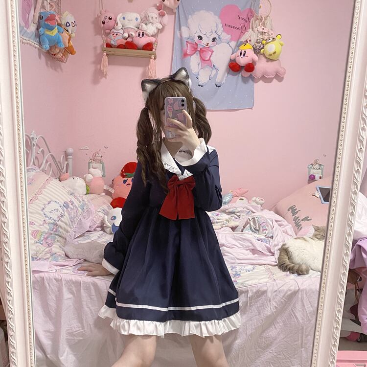 ✞ ♡ネイビーリボン長袖スリーブラッフル ロング スウィート ✞ゴスロリ SM ミリ 甘ロリ クラロリ 和ロリ エレガント 黒ロリ 姫ロリ 華ロリ BB-BB16681732195