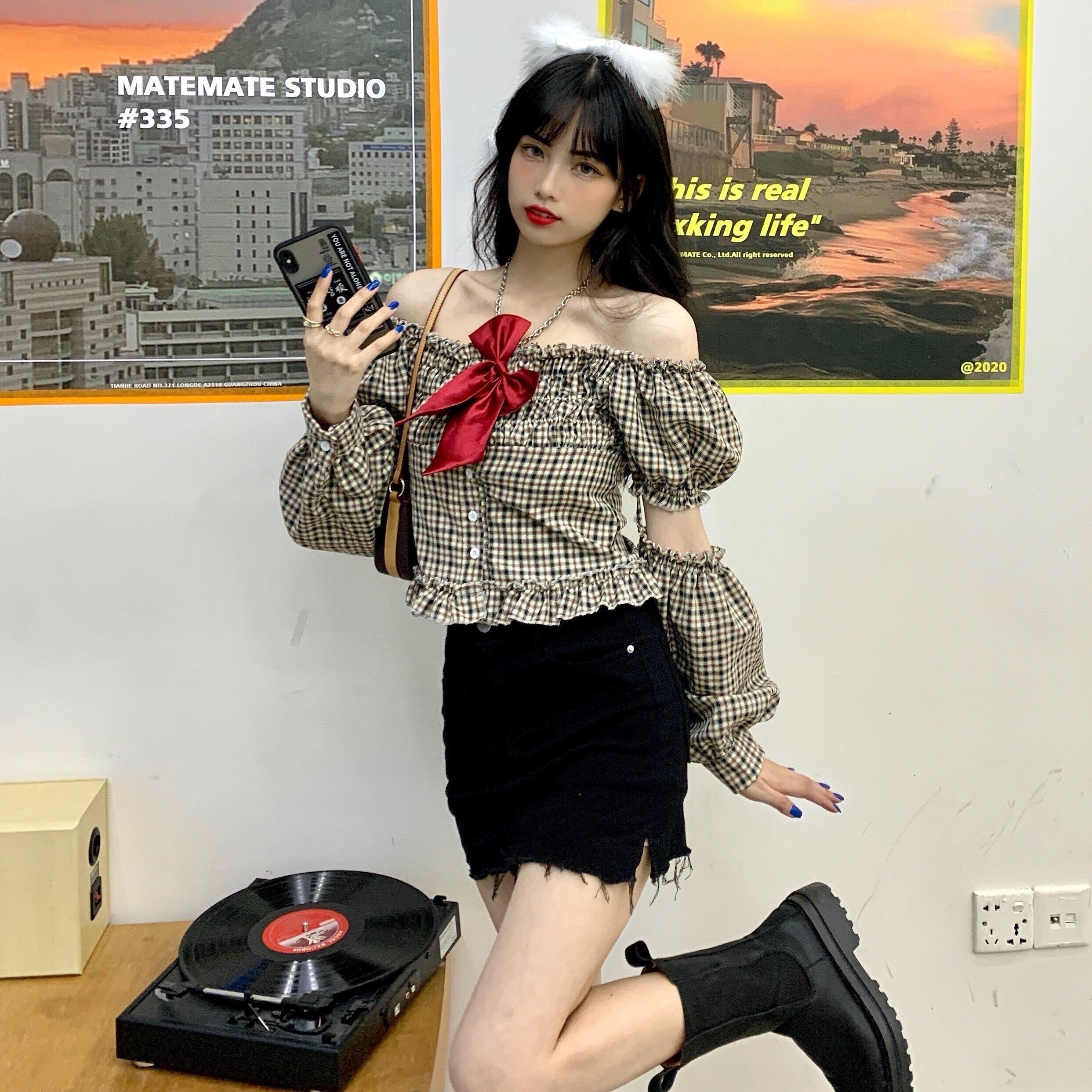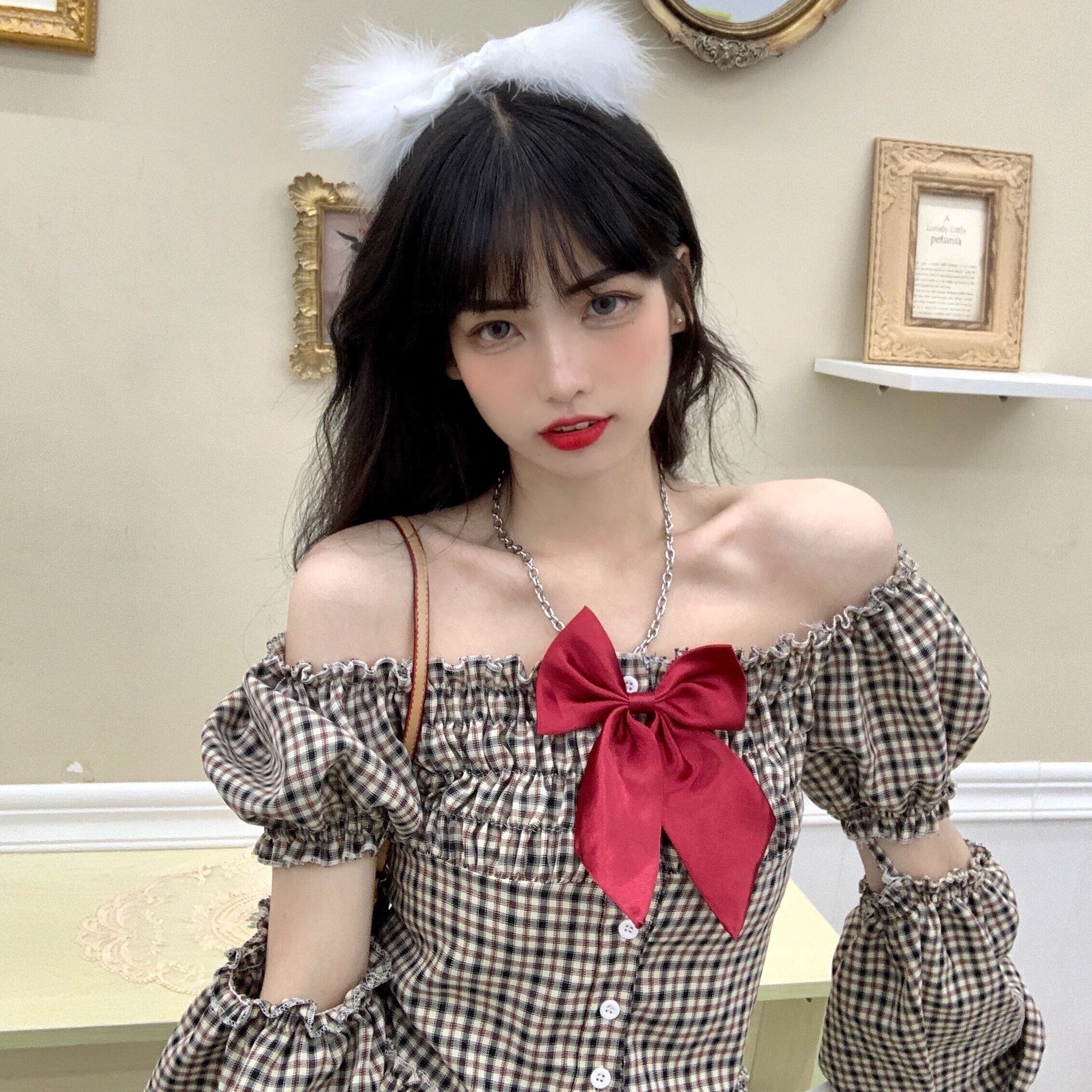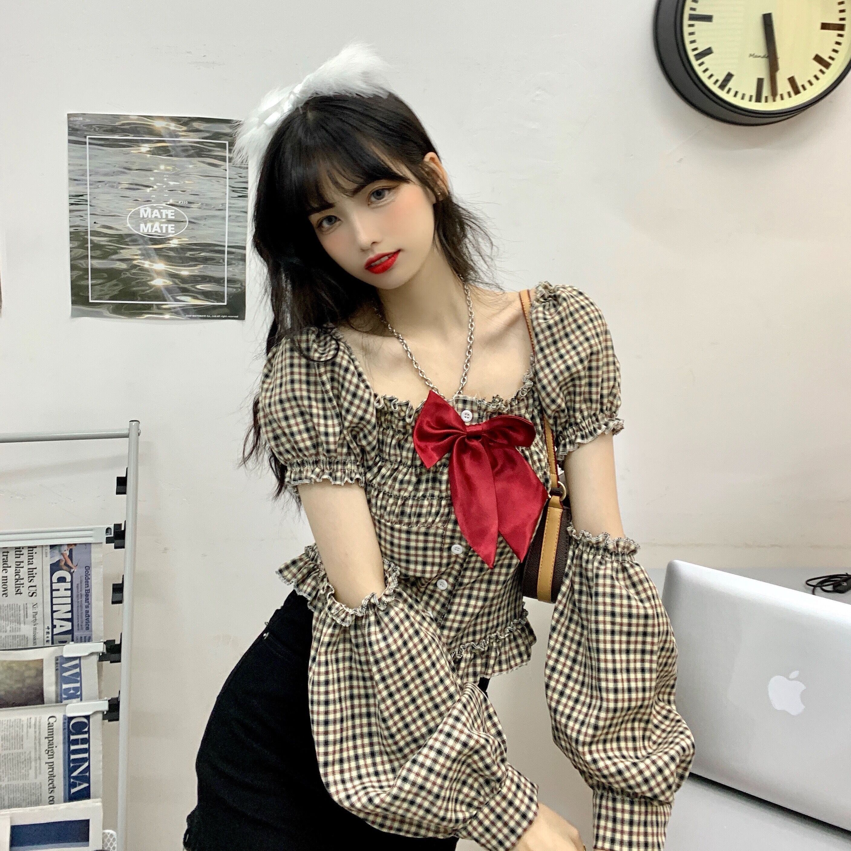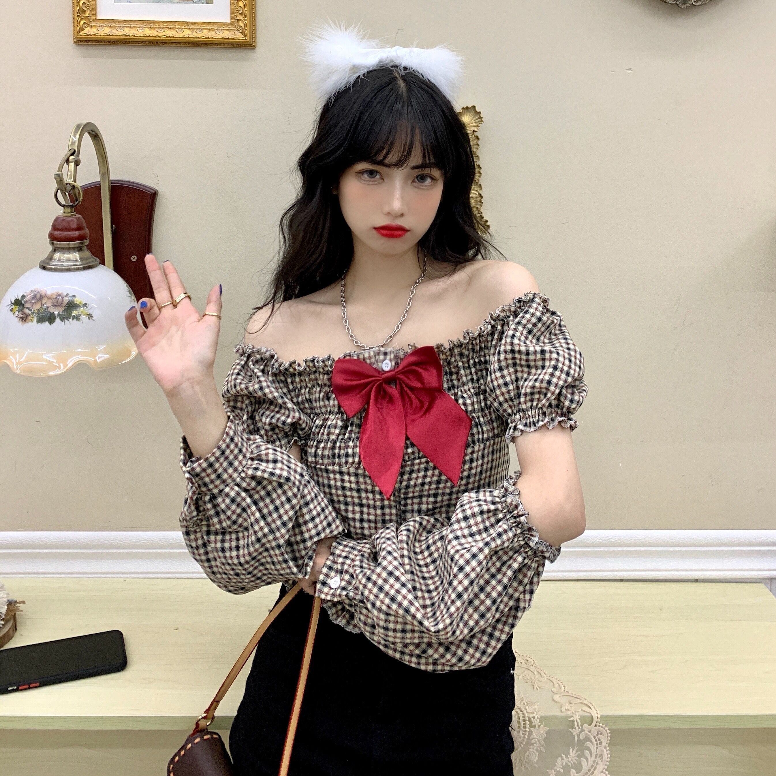 ✞ リボンスリーブチェック柄ショートシャツブラウス ランタンスリーブ スウィート スクウェア ステッチ ✞ゴスロリ SM ミリ 甘ロリ クラロリ 和ロリ エレガント 黒ロリ 姫ロリ 華ロリ BB-BB53111296048
