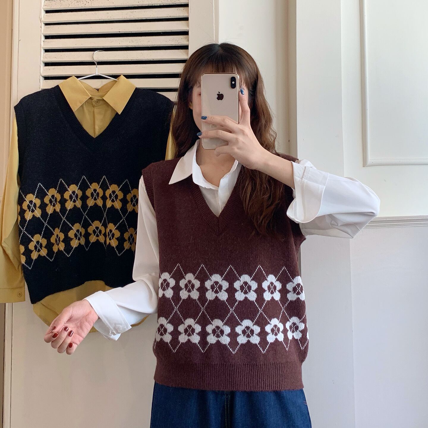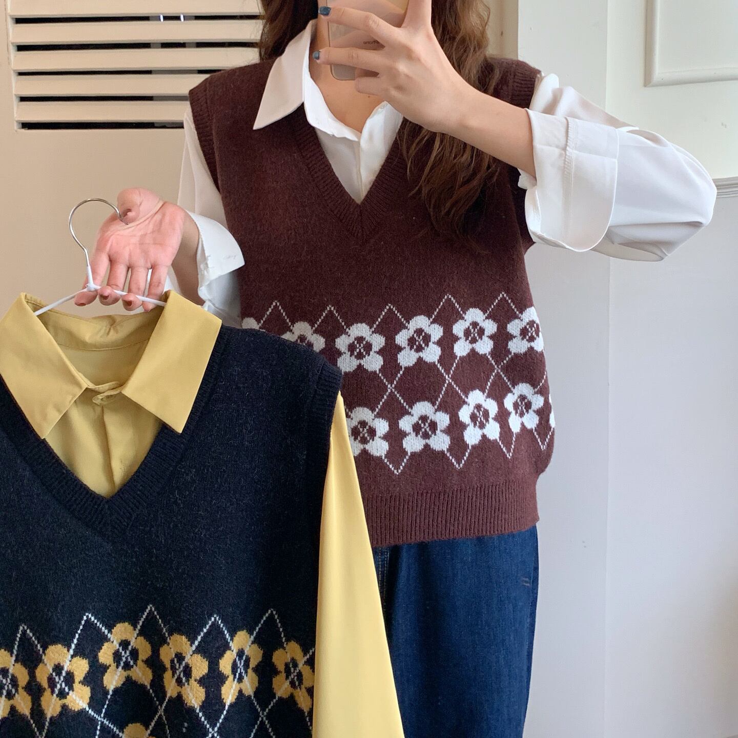 色:ブラックベストワンピース,コーヒーカラーベストワンピース,白いシャツワンピース,黄色のシャツワンピース