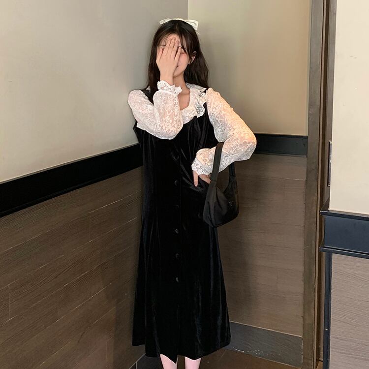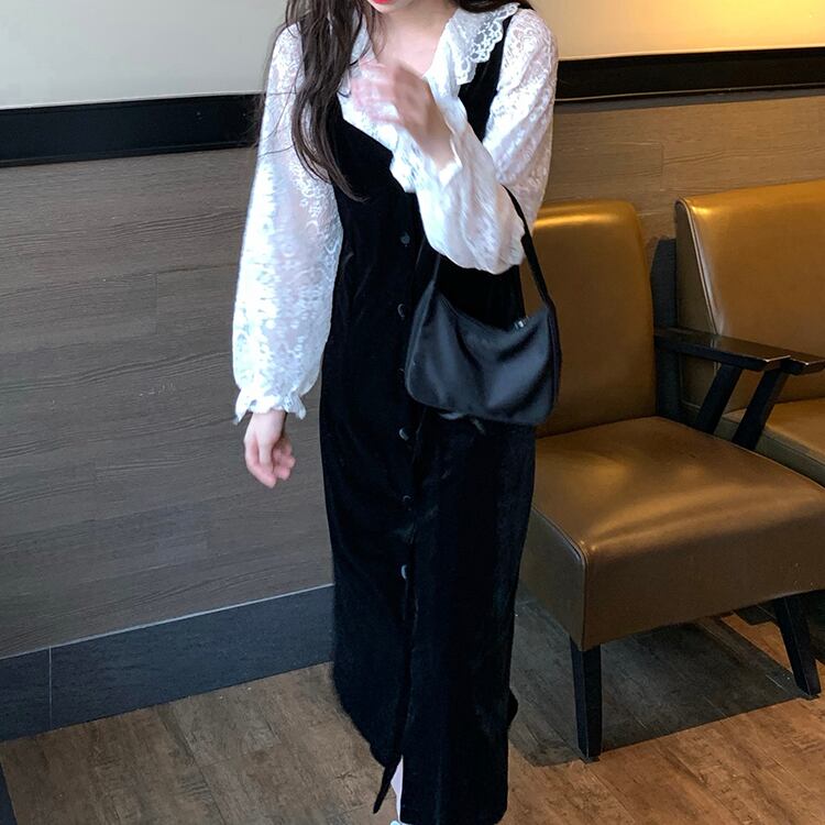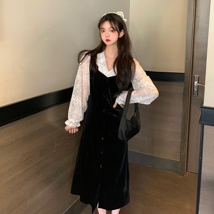 色:レースシャツシングル,ベルベットスリングスカートワンピース