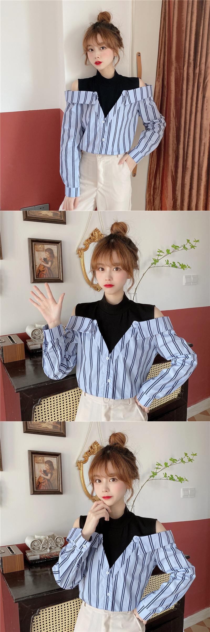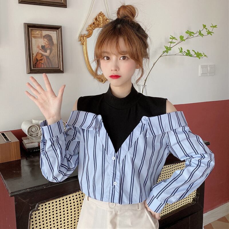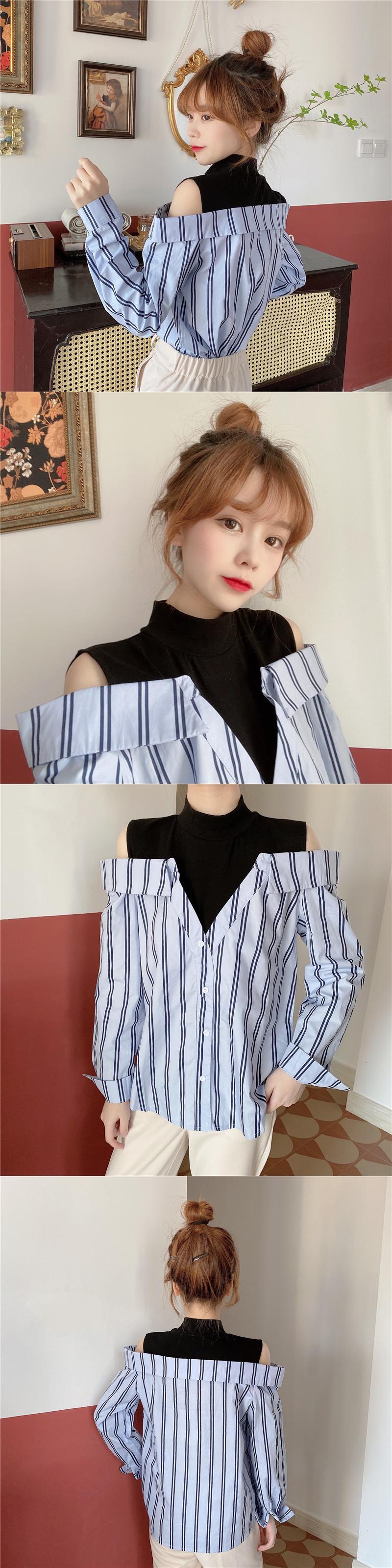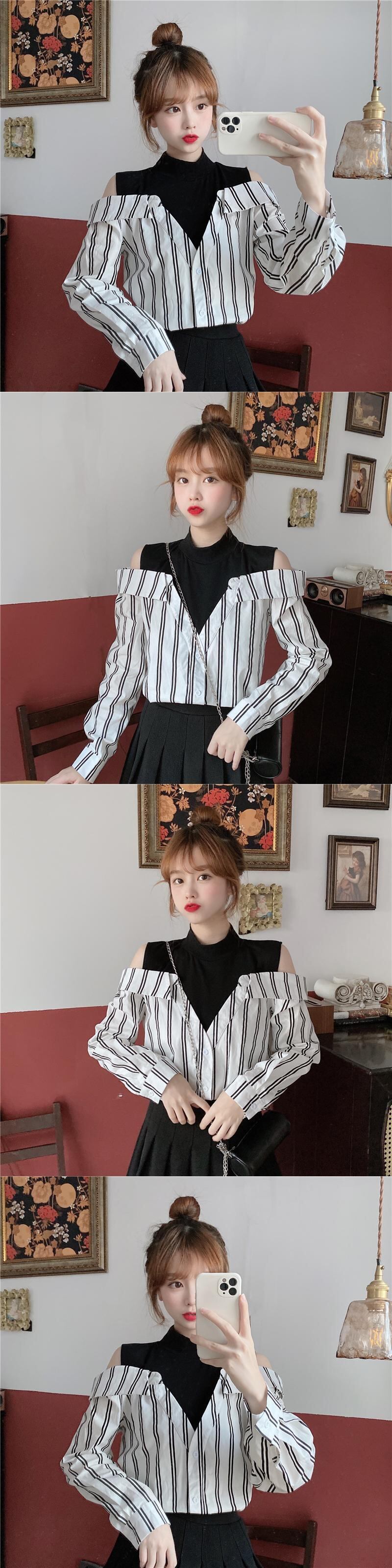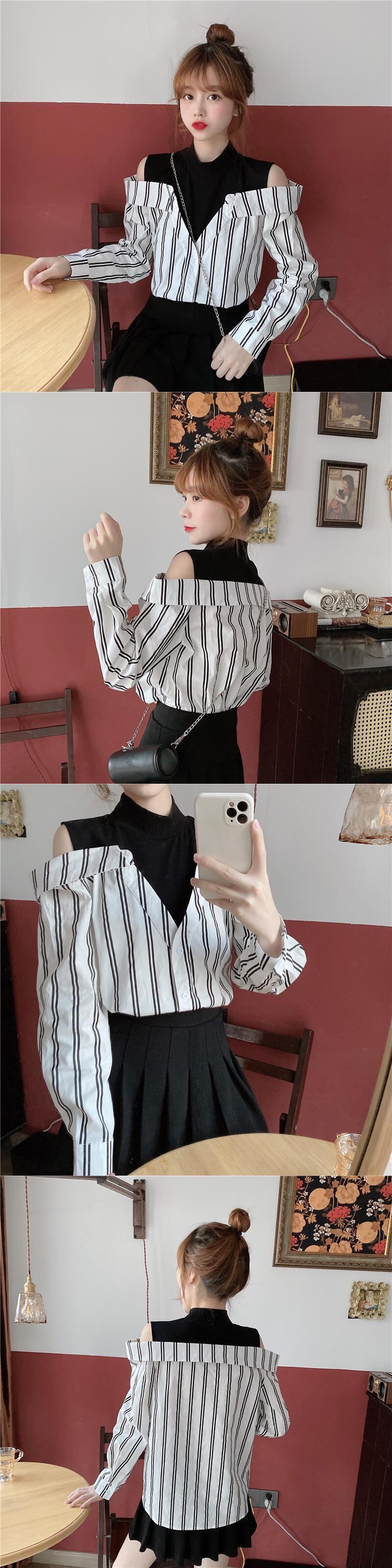 ✞ ストラップレスストライプシャツブラウス♡大人女子☆ ロング スウィート ステッチ ✞ゴスロリ SM ミリ 甘ロリ クラロリ 和ロリ エレガント 黒ロリ 姫ロリ 華ロリ BB-BB81227516764