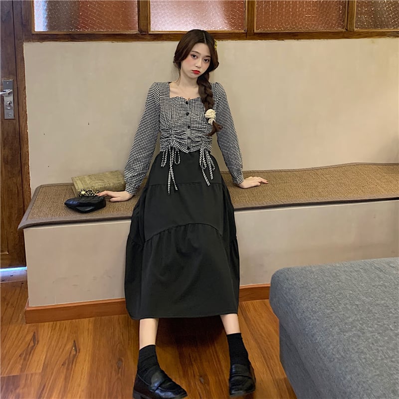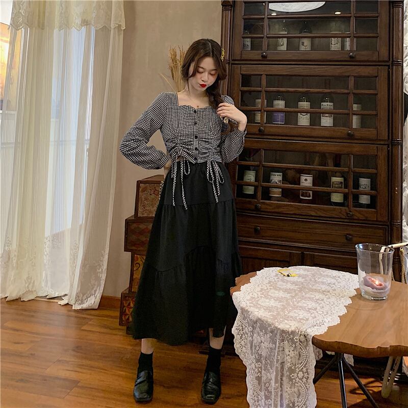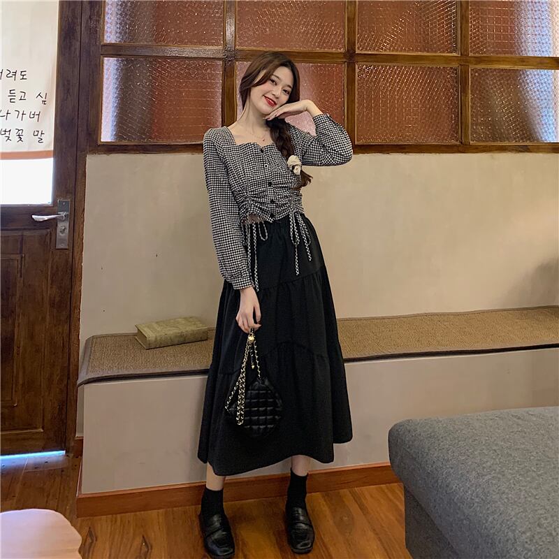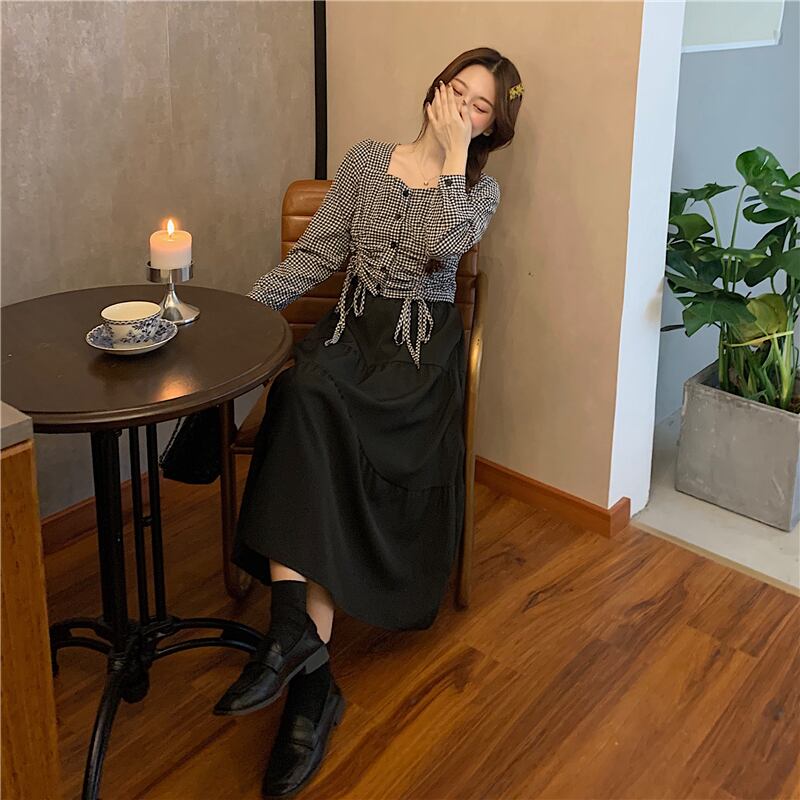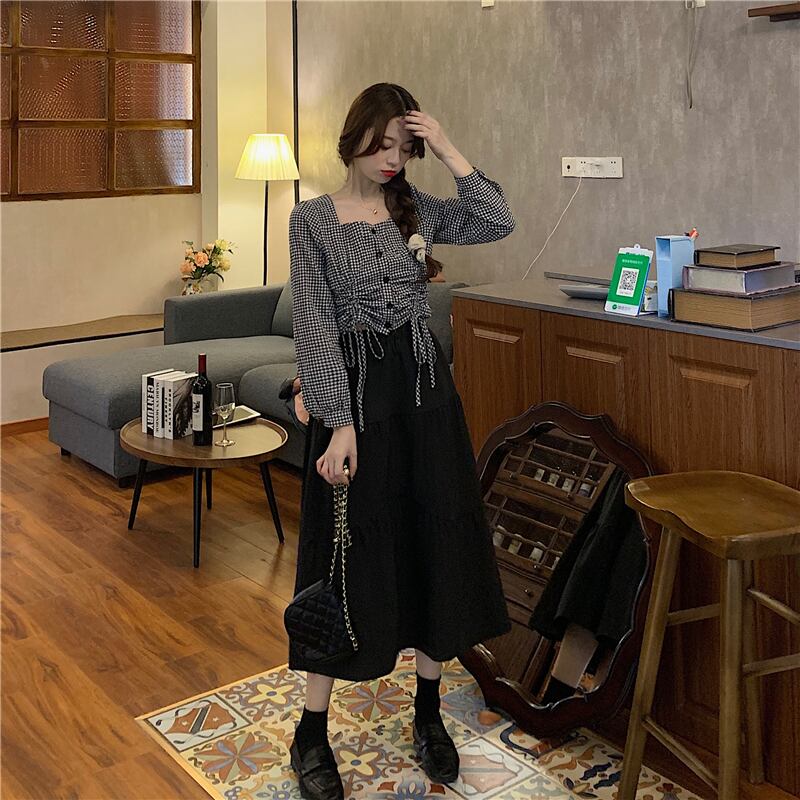 色:格子縞のシャツワンピース,ブラックスカートワンピース
