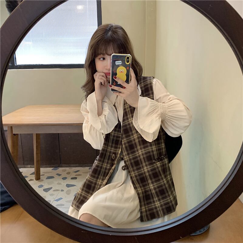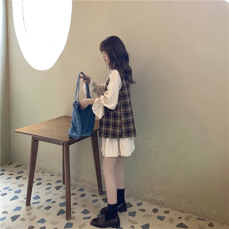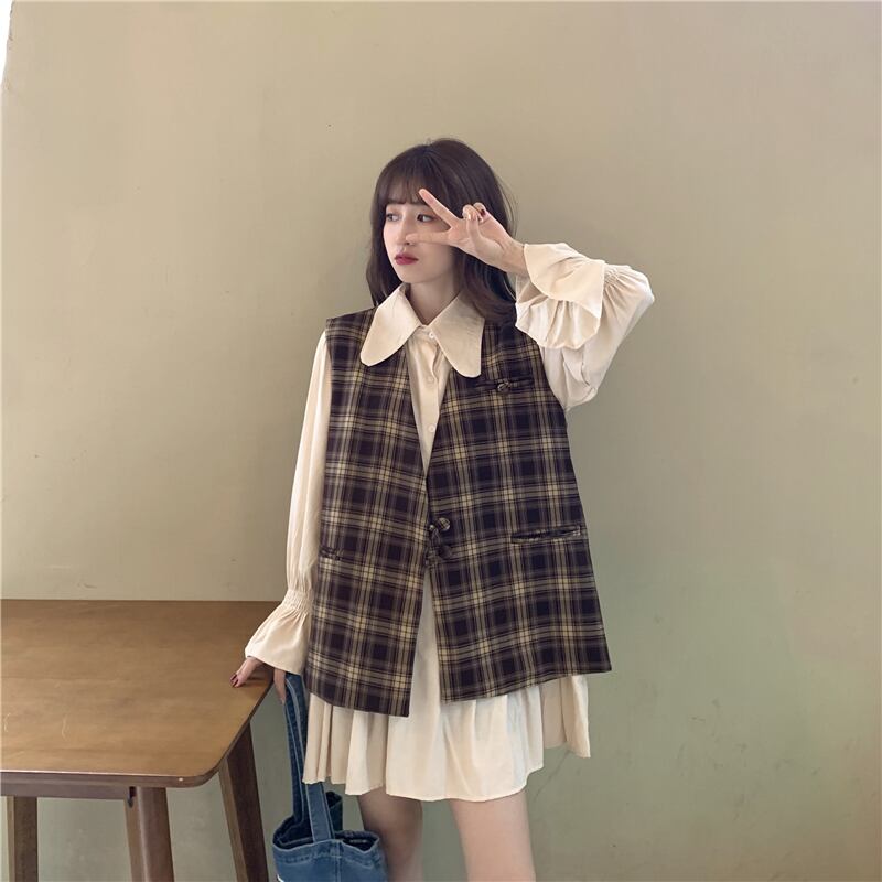 色:ワンピース,チェック柄ベスト,カードベストワンピース