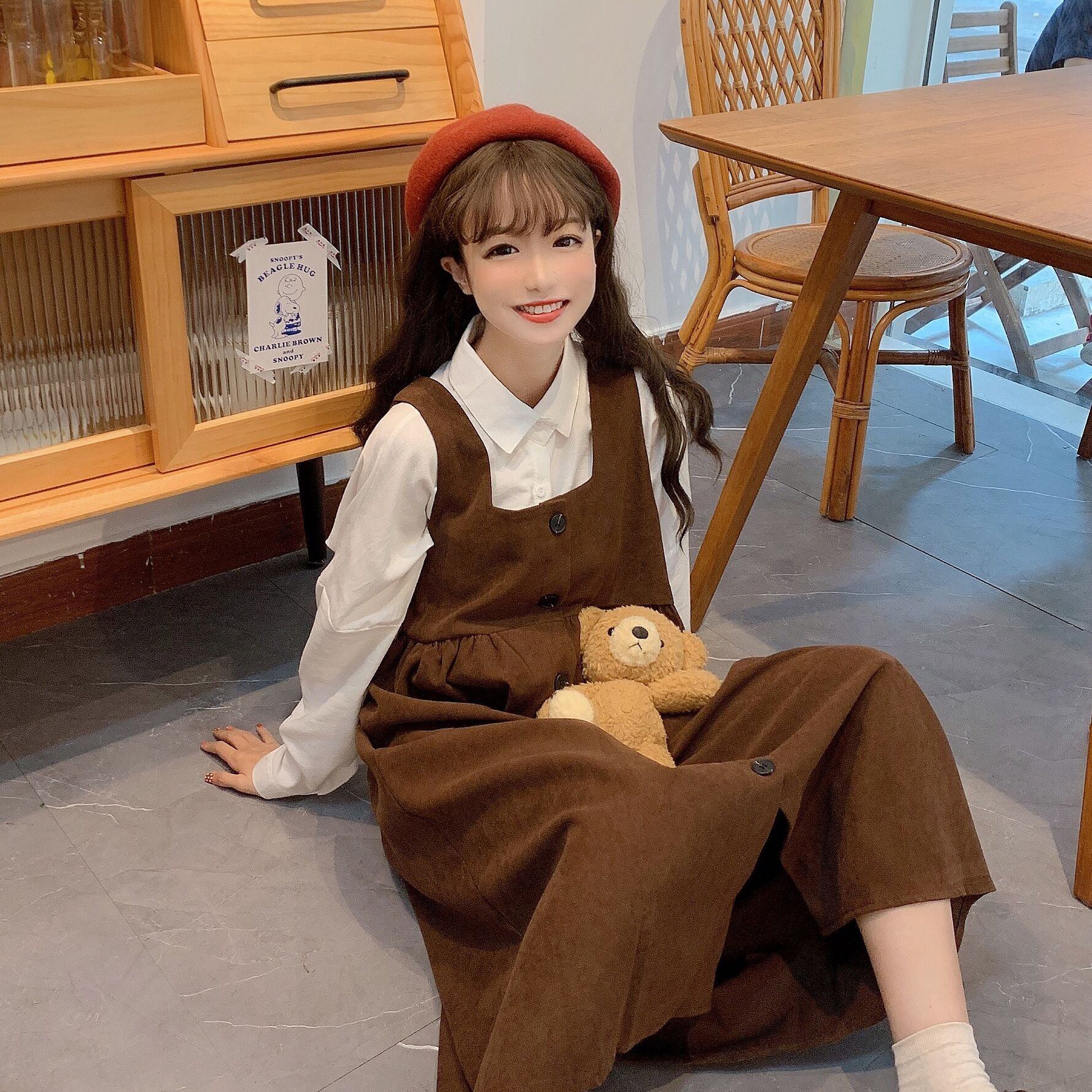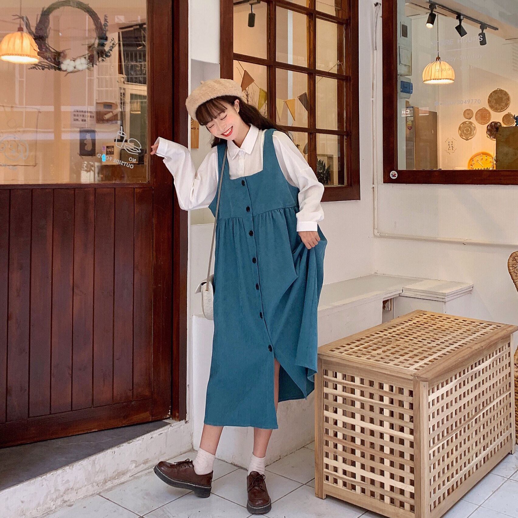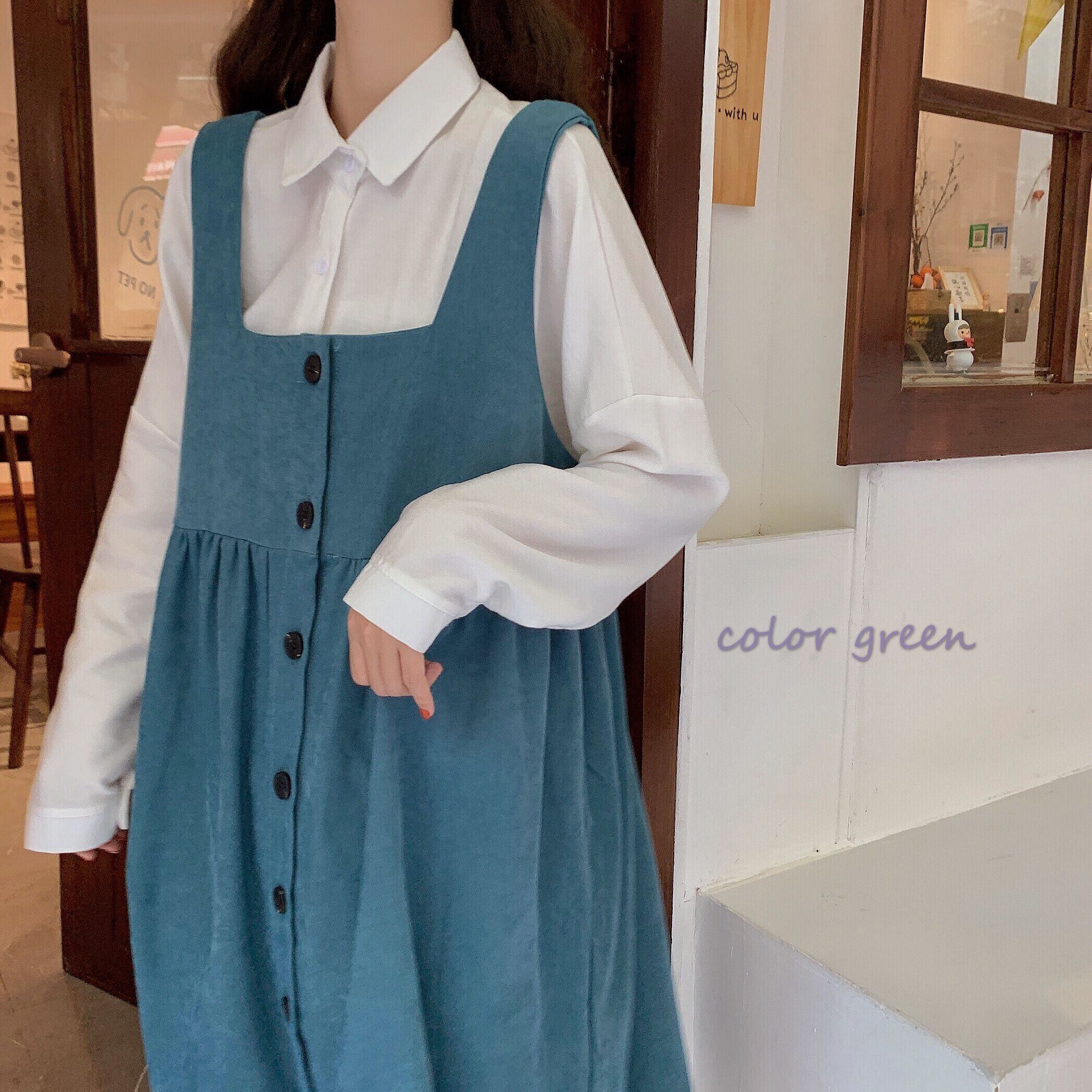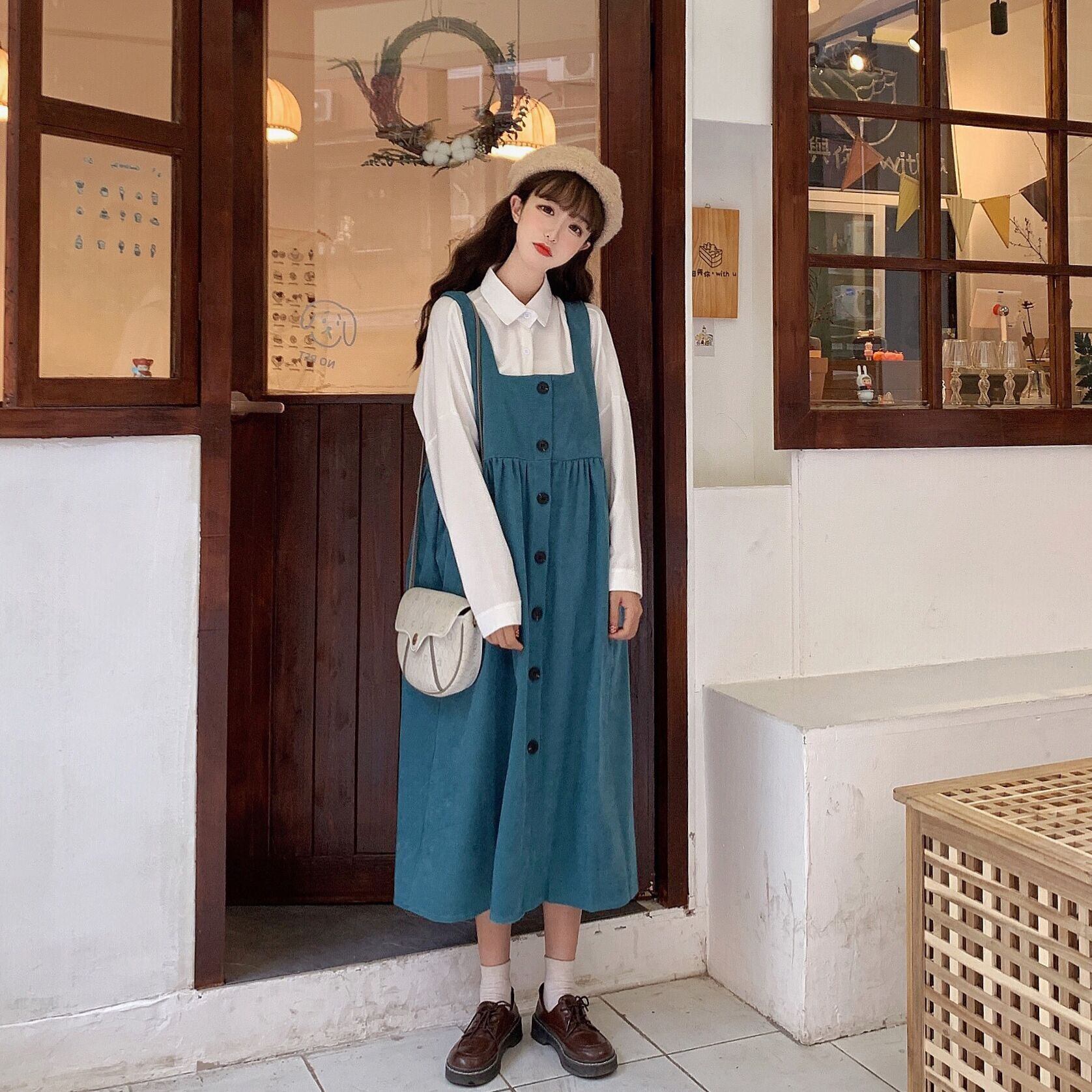 色:白いシャツワンピース,ピーコックブルーストラップワンピース,ブラウンストラップワンピース