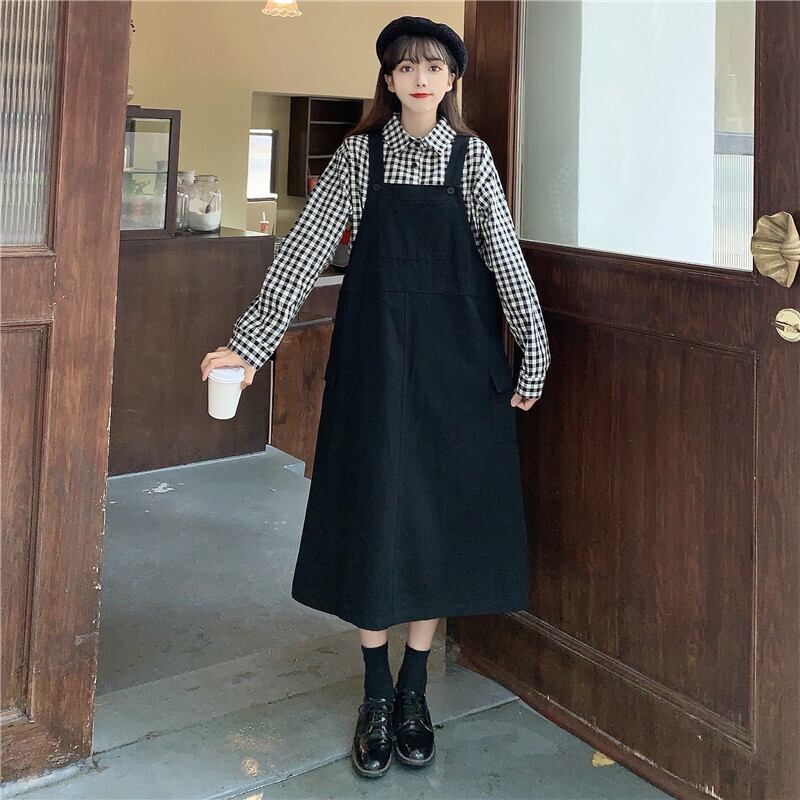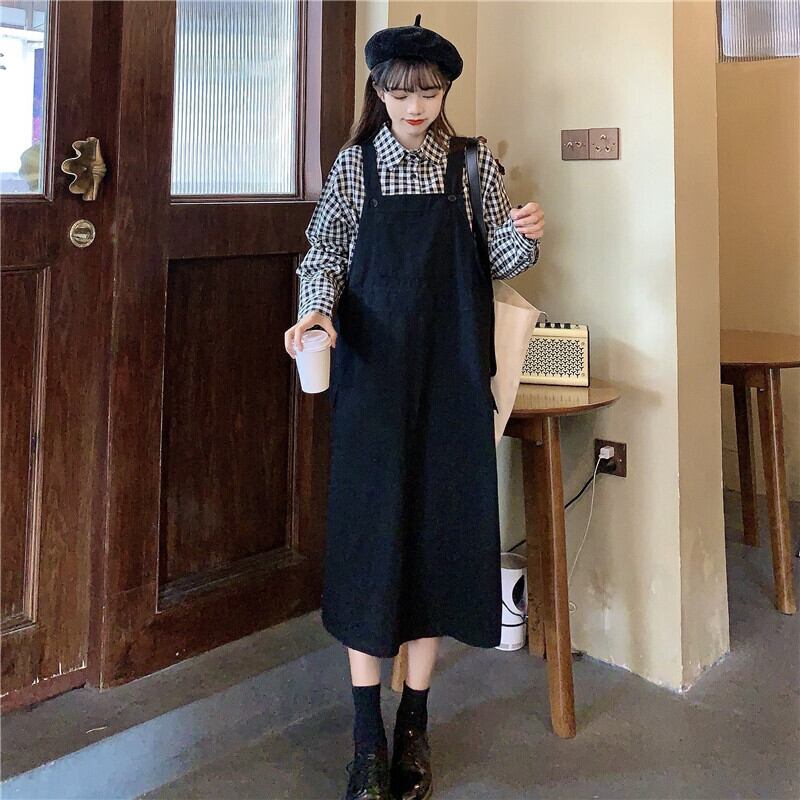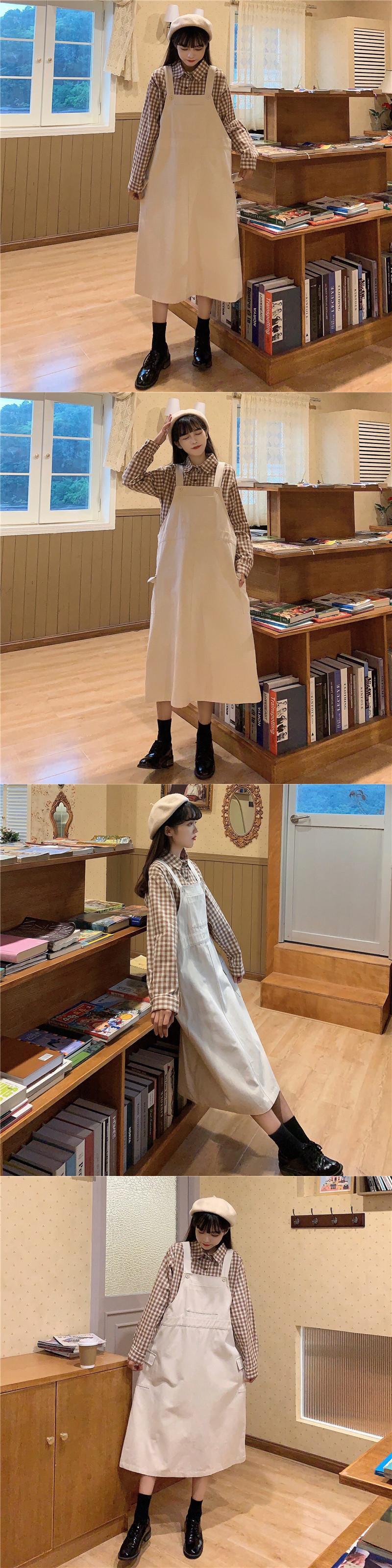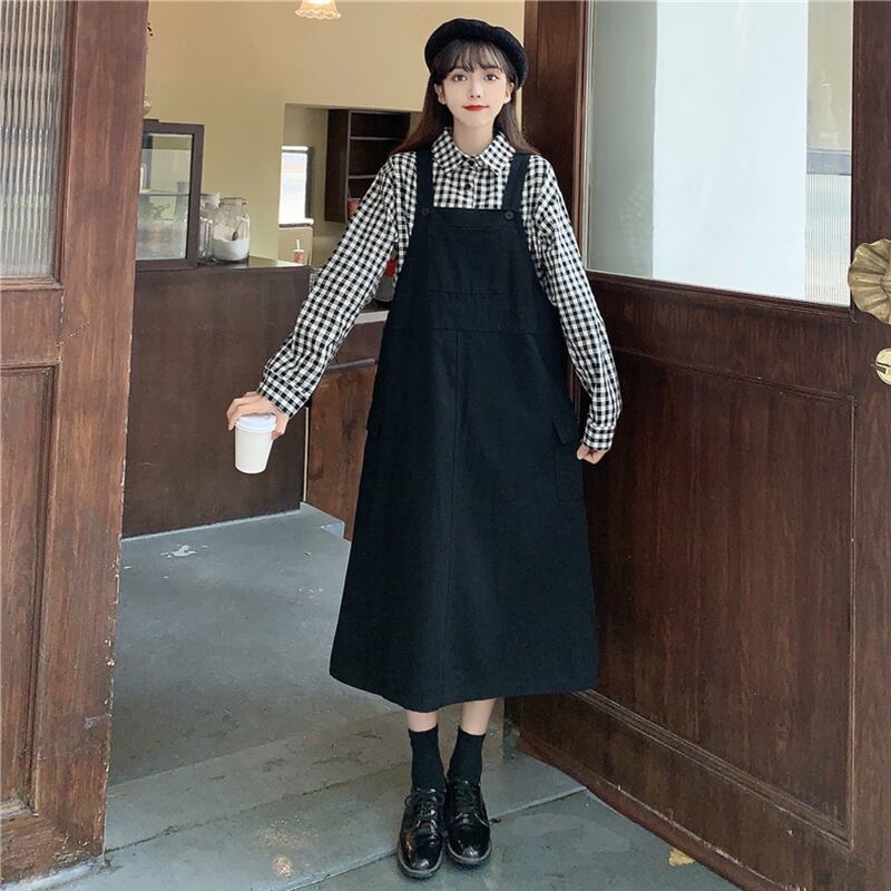 色:ブラックグリッドシャツ,ケージシャツシングル,ブラックストラップスカートワンピース,オフホワイトのストラップワンピース