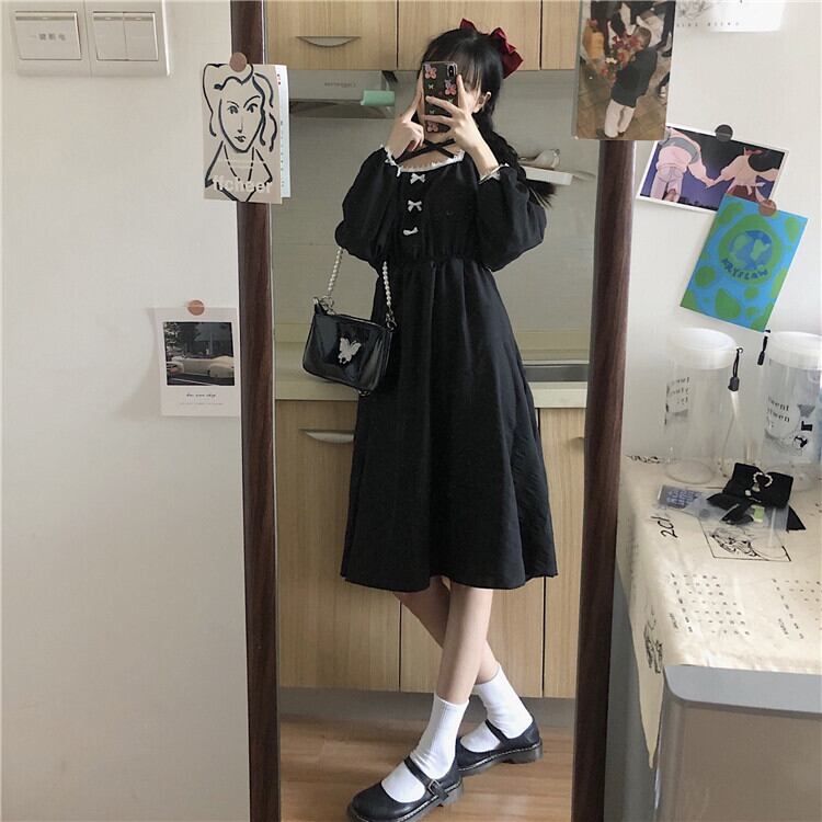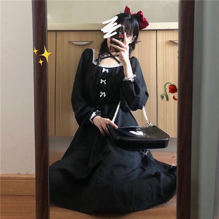 ✞ ドレス ワンピースクロス長袖スリーブリボン♥カワイイ♥ブラック ロング スクウェア ステッチ ✞ゴスロリ SM ミリ 甘ロリ クラロリ 和ロリ エレガント 黒ロリ 姫ロリ 華ロリ BB-BB66856671114