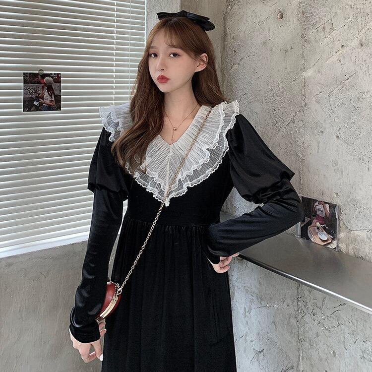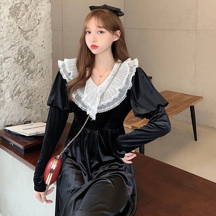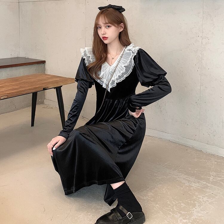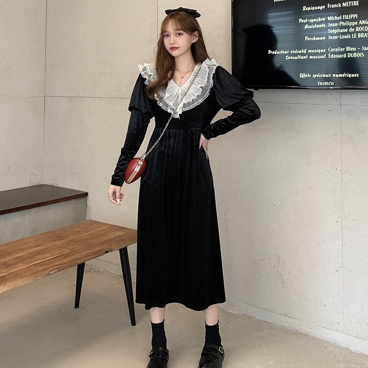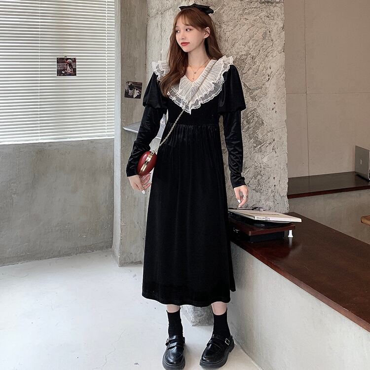 ✞ スタンダードゴールドベルベットブラックレースVネックスリムフィット ロング レトロ スウィート ステッチ ✞ゴスロリ SM ミリ 甘ロリ クラロリ 和ロリ エレガント 黒ロリ 姫ロリ 華ロリ BB-BB73624434277