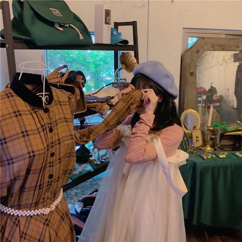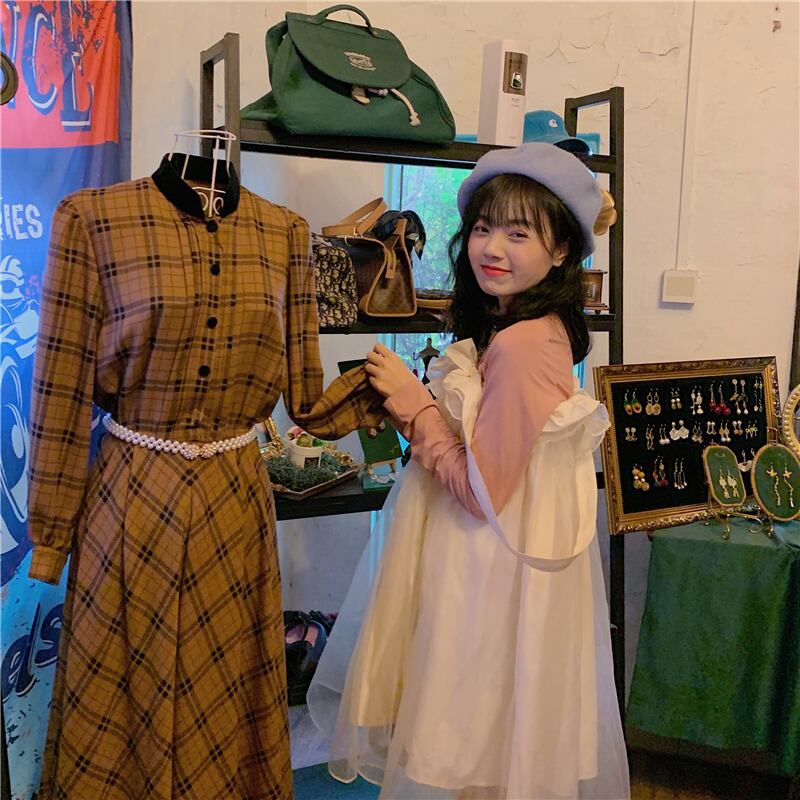 色:ピンクのボトムスシャツワンピース,オフホワイトのストラップ付きスカートワンピース