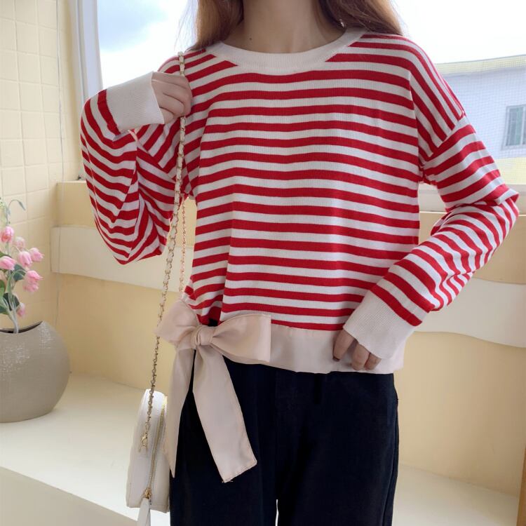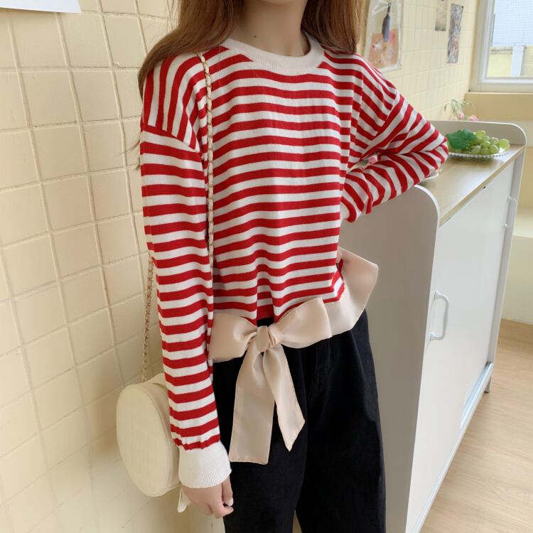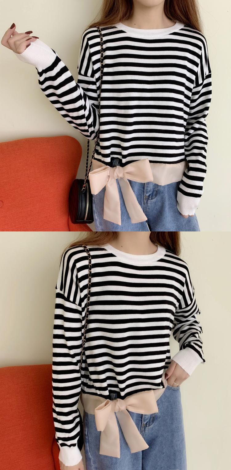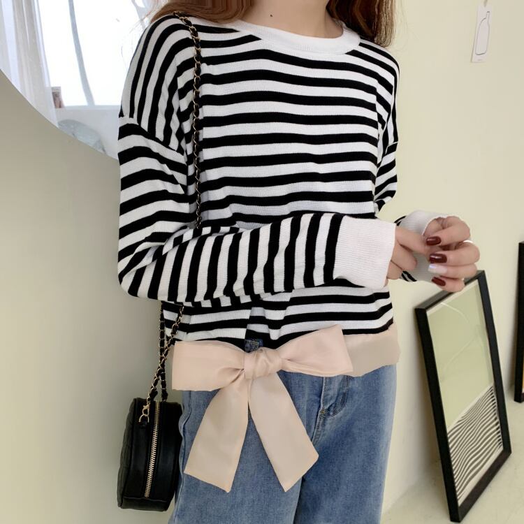 ✞ リボン長袖スリーブラウンドネックカラーストライプショートTシャツ トップス ロング スウィート ✞ゴスロリ SM ミリ 甘ロリ クラロリ 和ロリ エレガント 黒ロリ 姫ロリ 華ロリ BB-BB91576827241